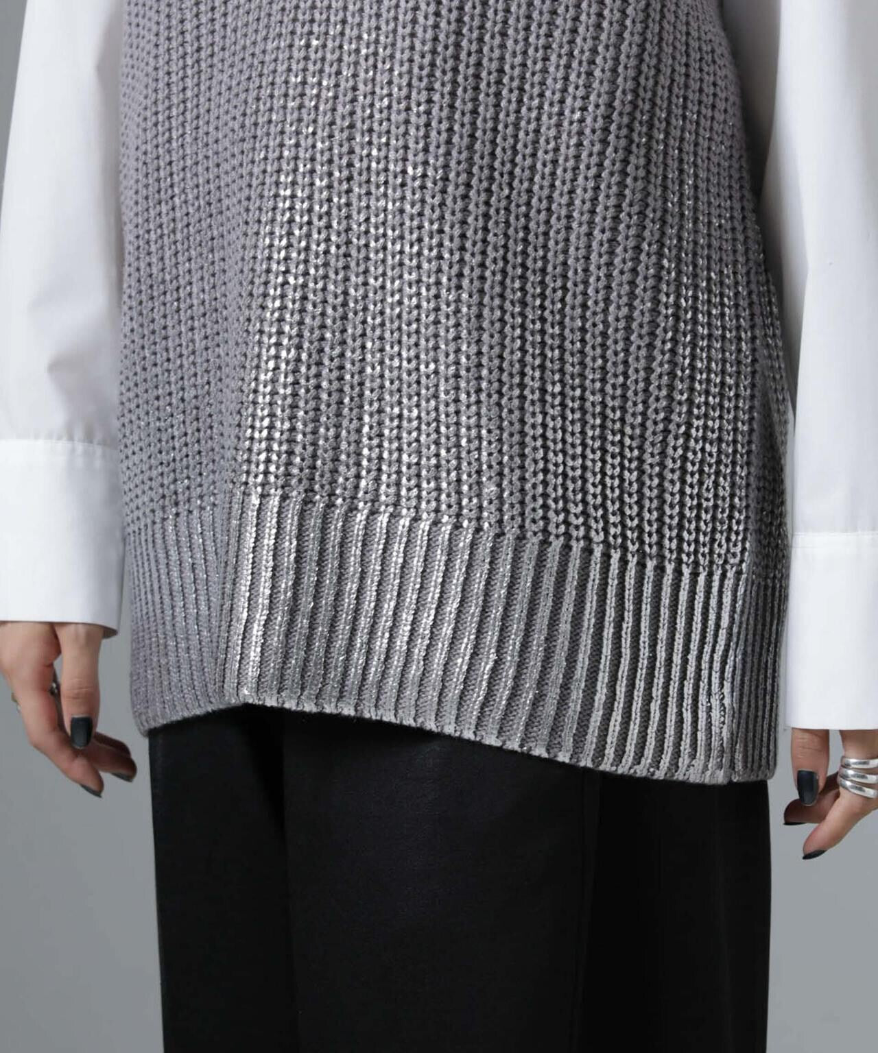 ざっくりとした凹凸感のある編みのニットベスト。裾からグラデーション箔プリントをのせたキャッチーなアイテム。シンプルなインナーやカットソー、シャツに合わせるだけでスタイルを楽しんでいただける一枚です。