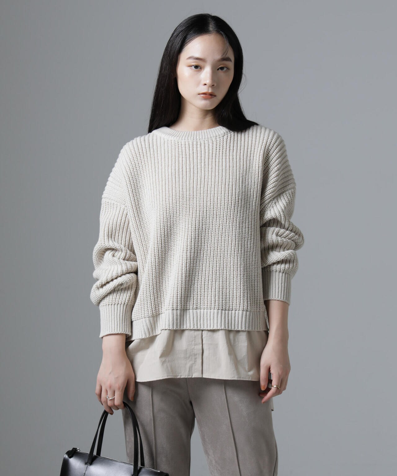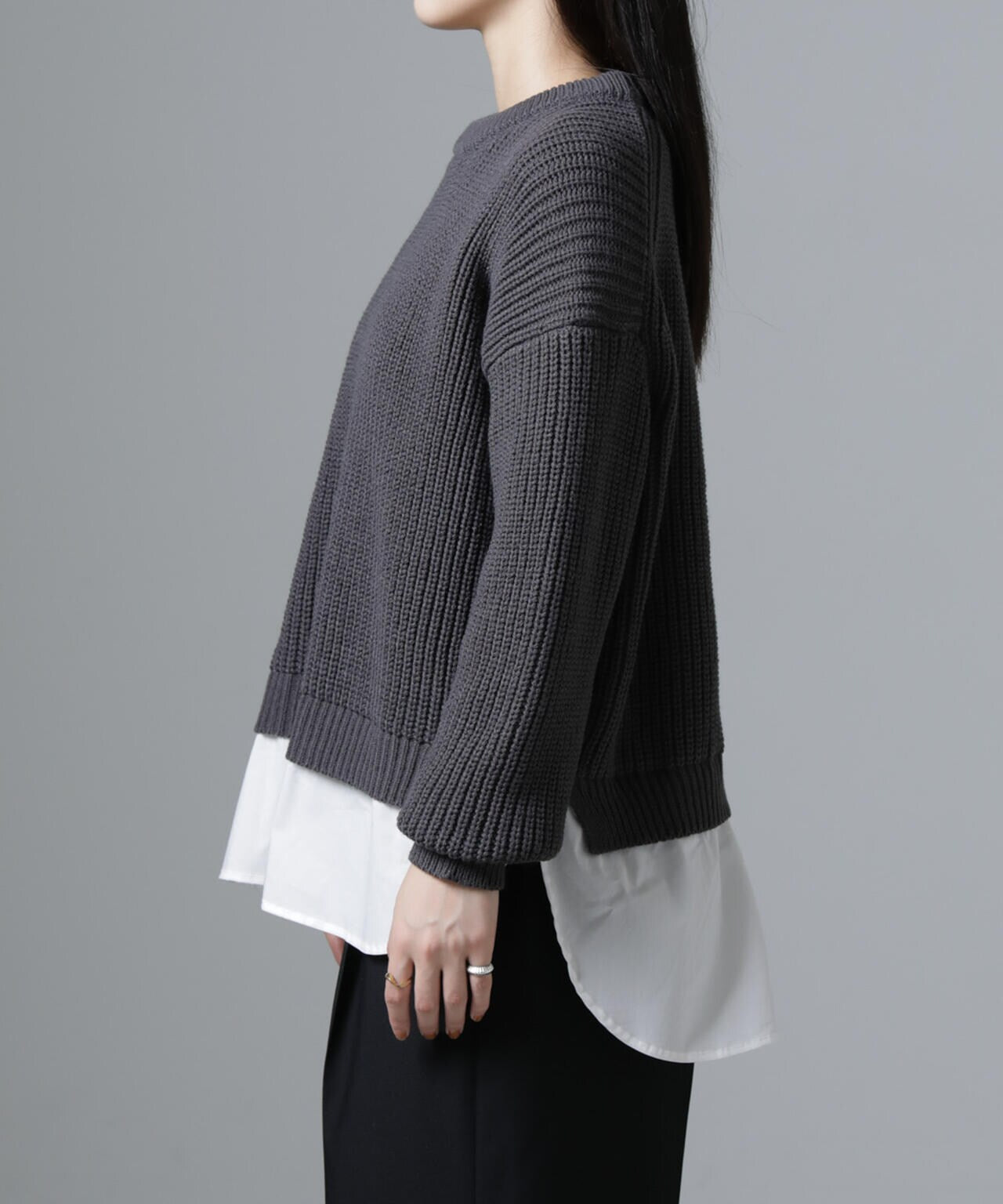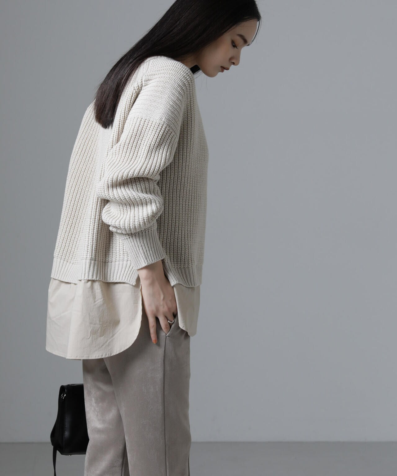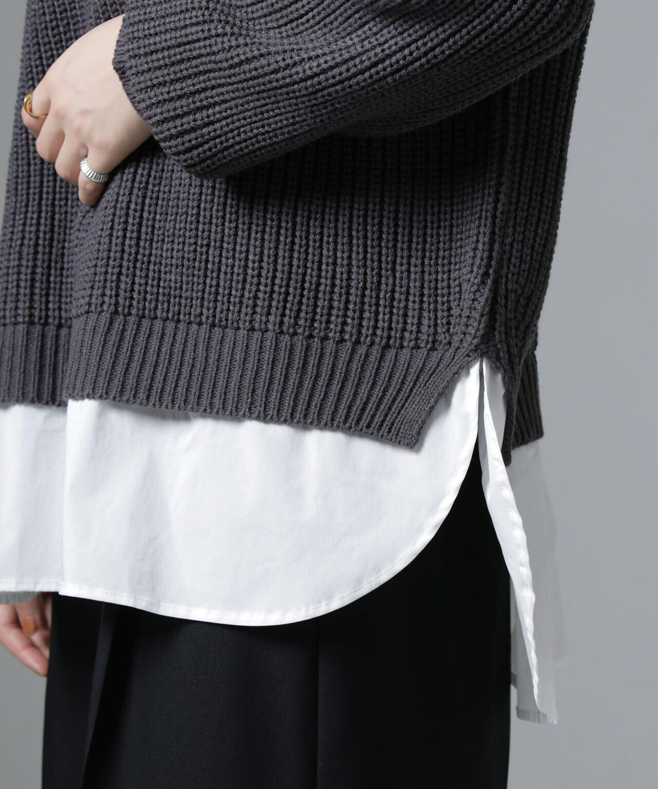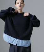 ・キレイ目なシャツ素材を裾にドッキングさせたレイヤード風ニットトップス