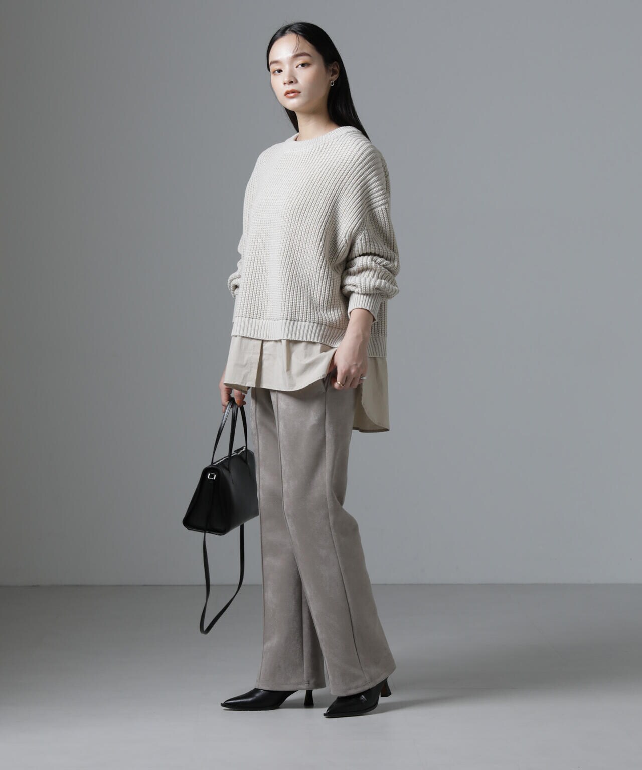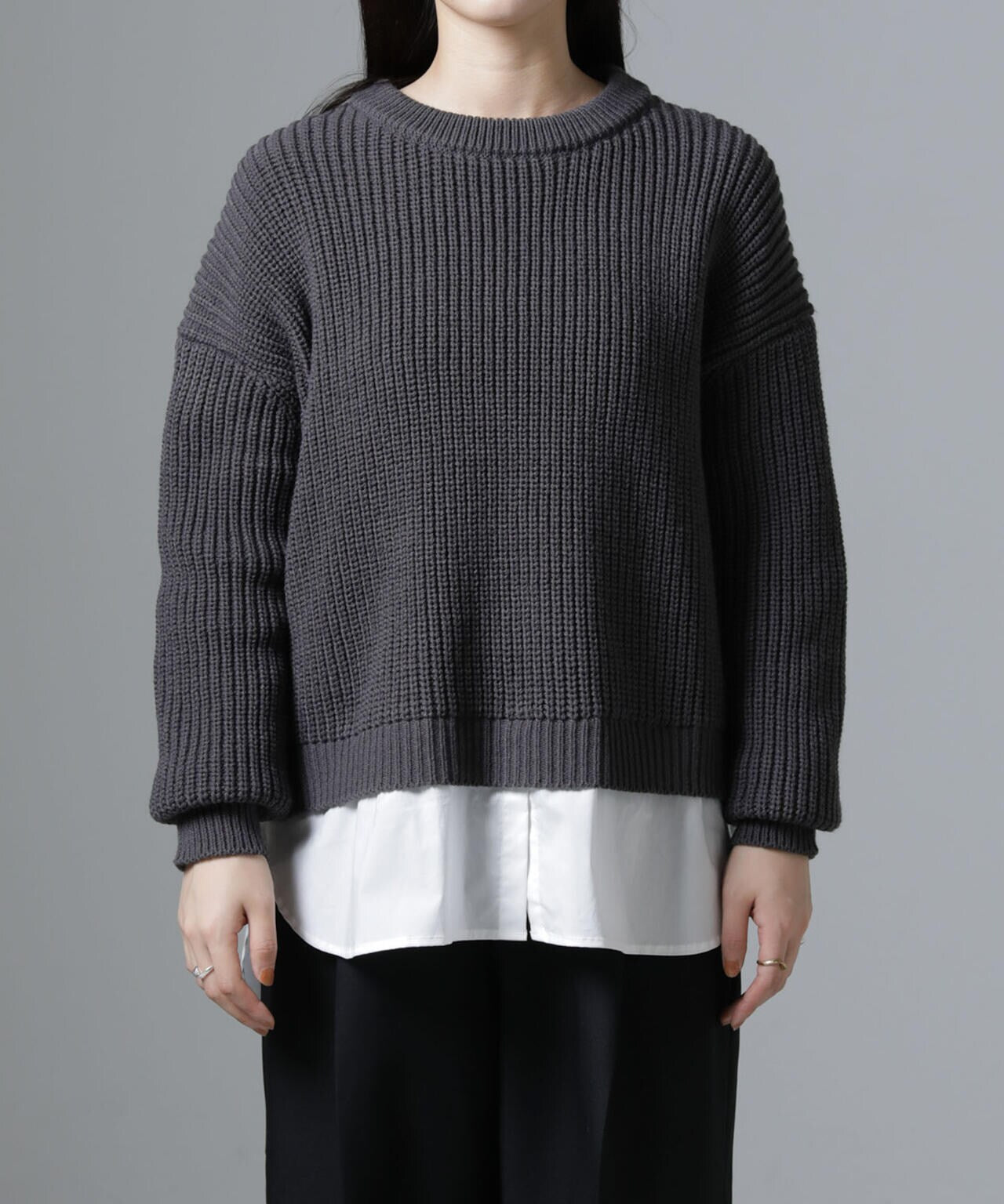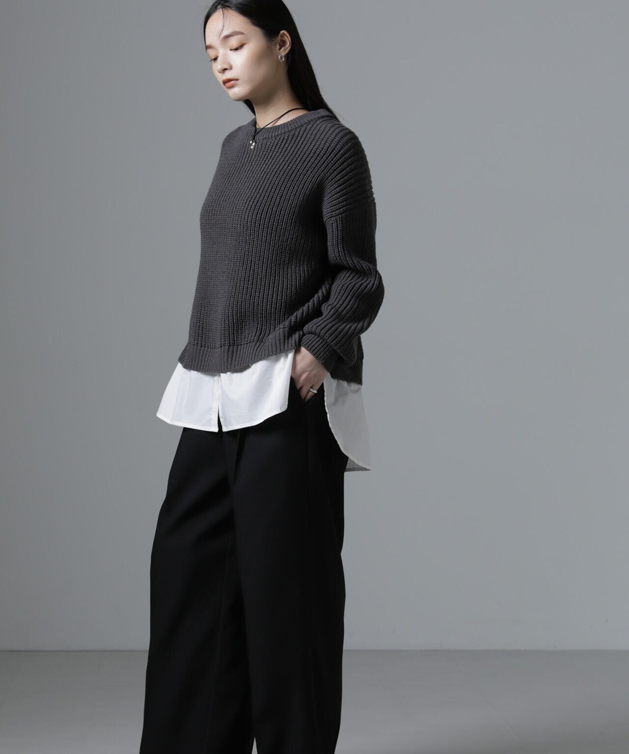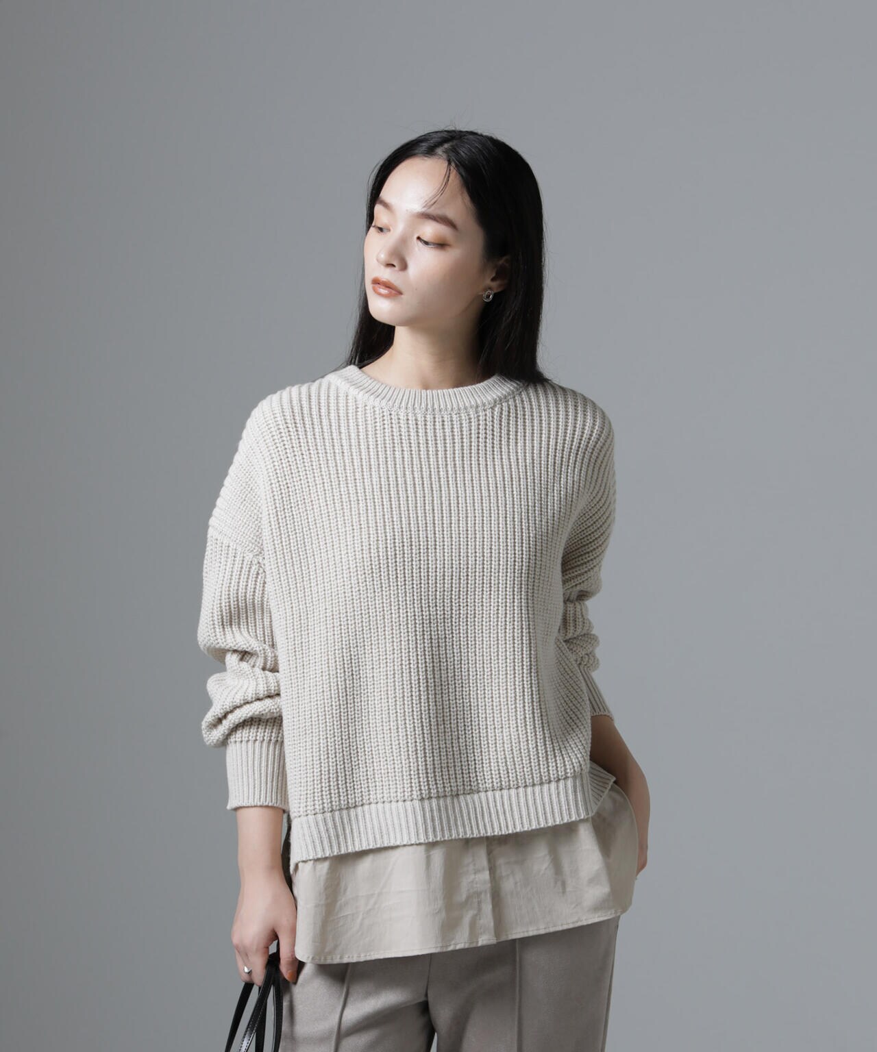 ・キレイ目なシャツ素材を裾にドッキングさせたレイヤード風ニットトップス