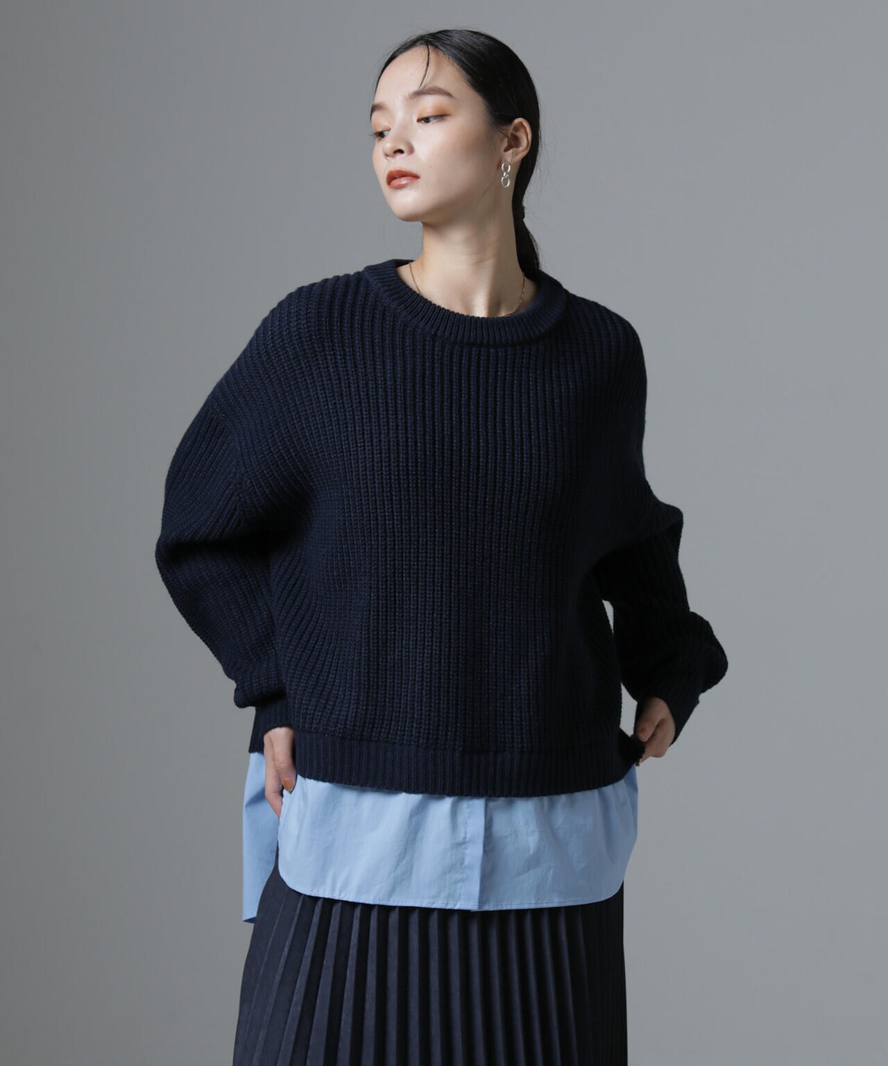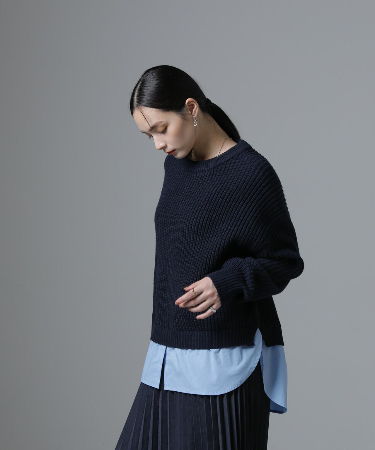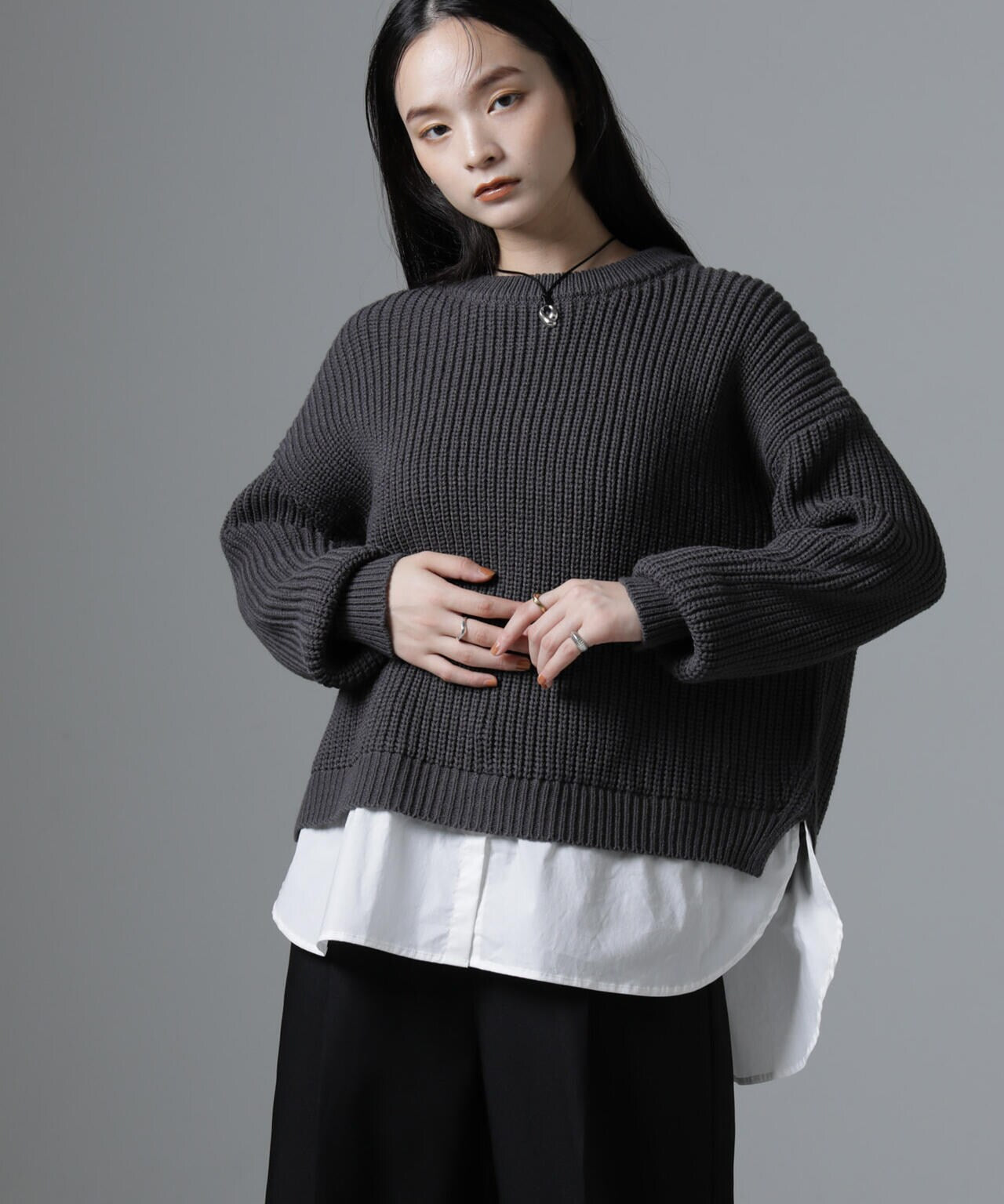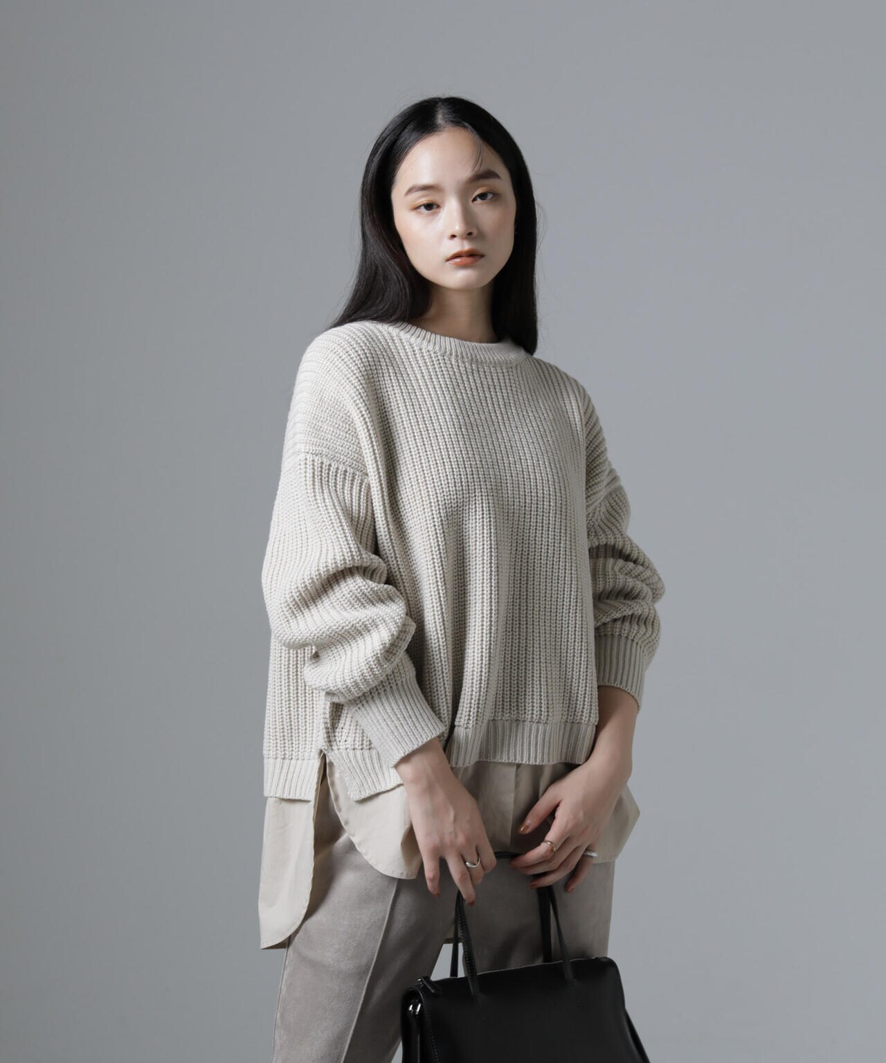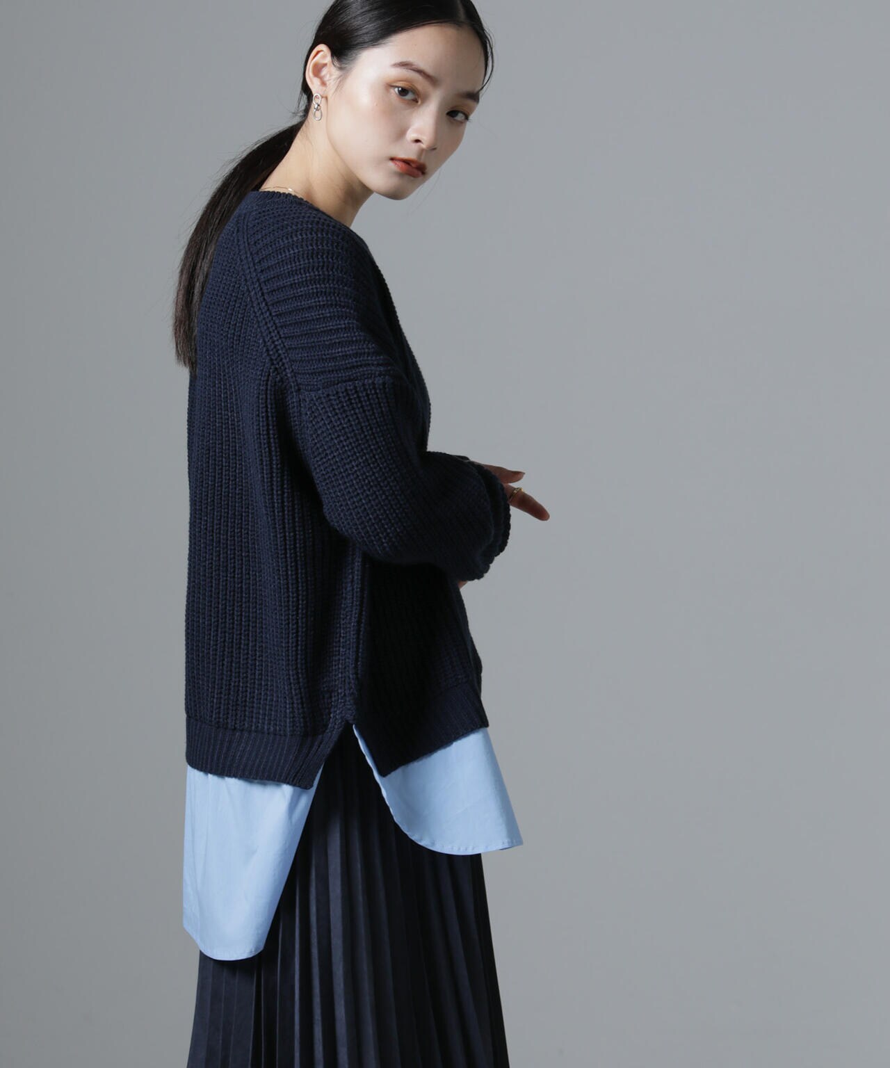 裾から見えるシャツのバランスがこなれ見えする異素材コンビのニット。サイドスリット入りのラウンドカットの裾デザインでボトムを合わせやすく、大人のカジュアルスタイルに重宝するひと品です。