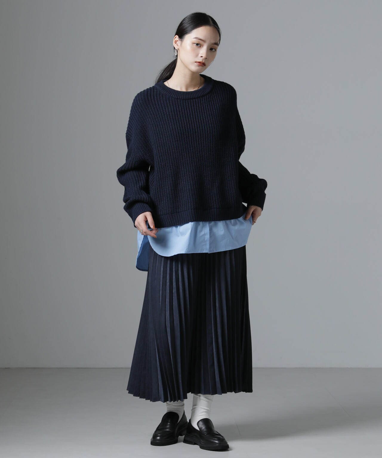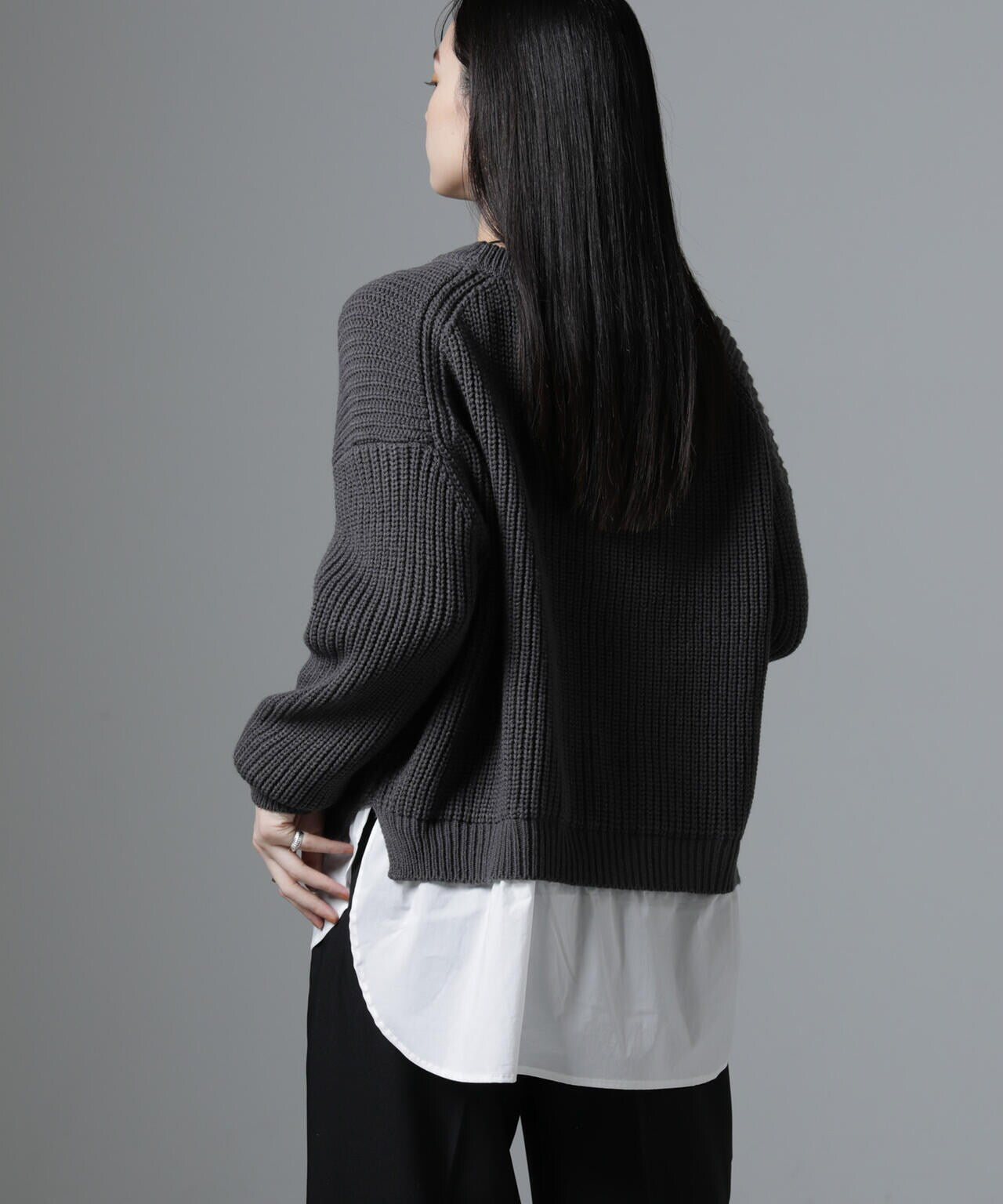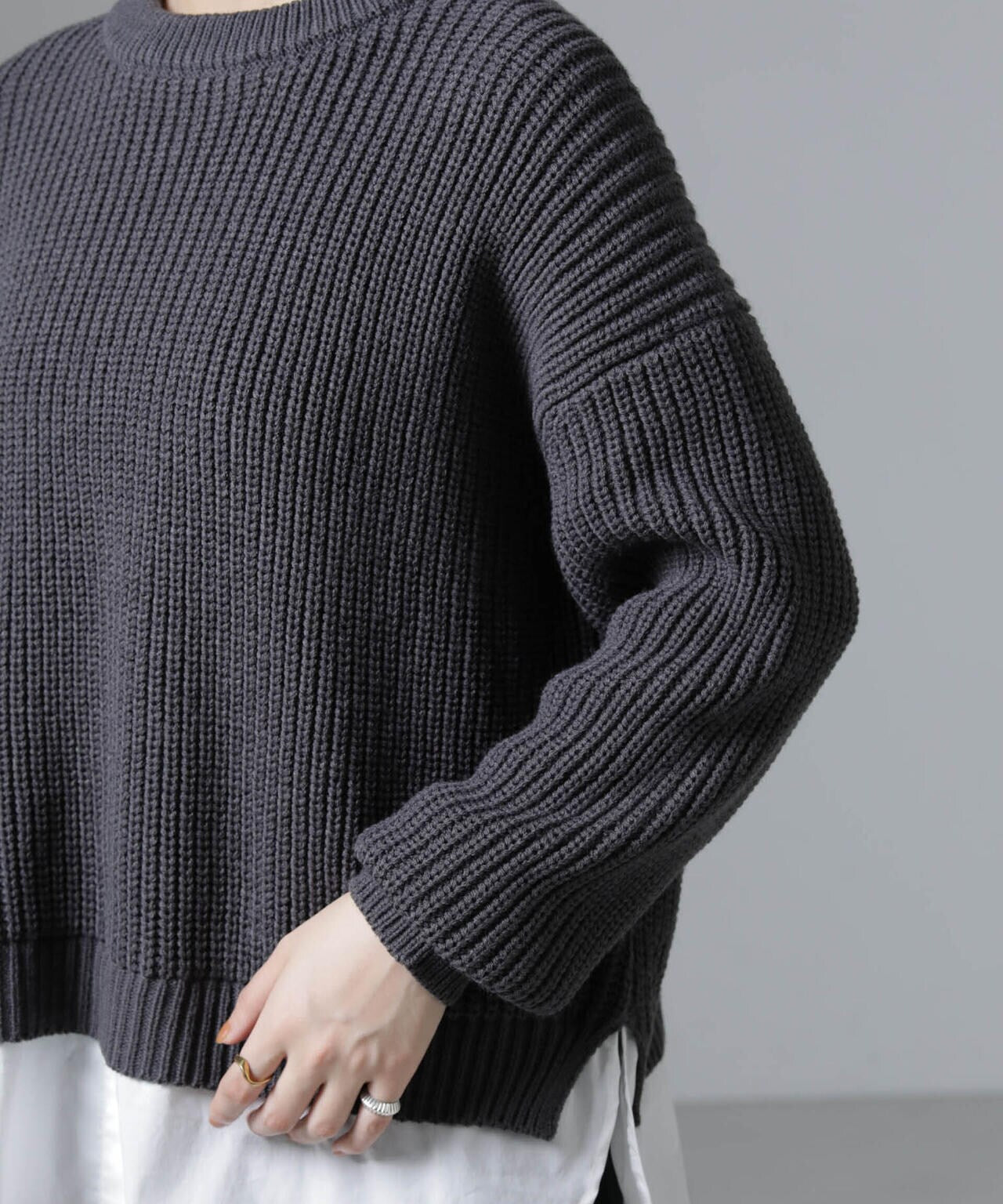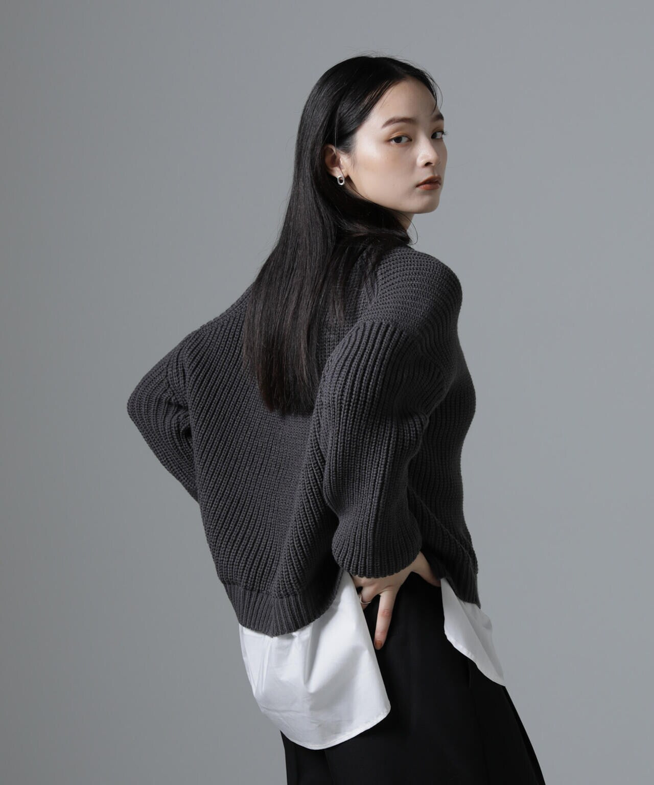 裾から見えるシャツのバランスがこなれ見えする異素材コンビのニット。サイドスリット入りのラウンドカットの裾デザインでボトムを合わせやすく、大人のカジュアルスタイルに重宝するひと品です。