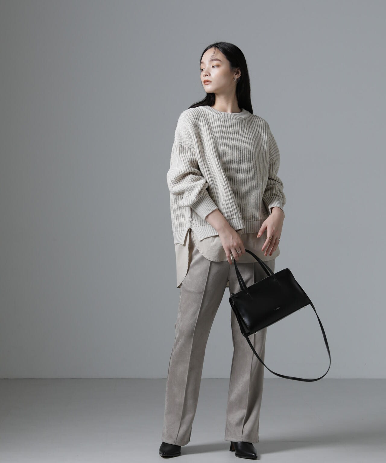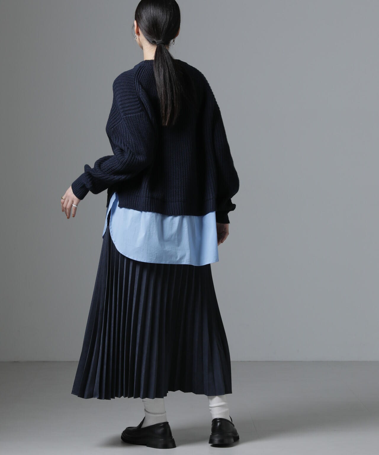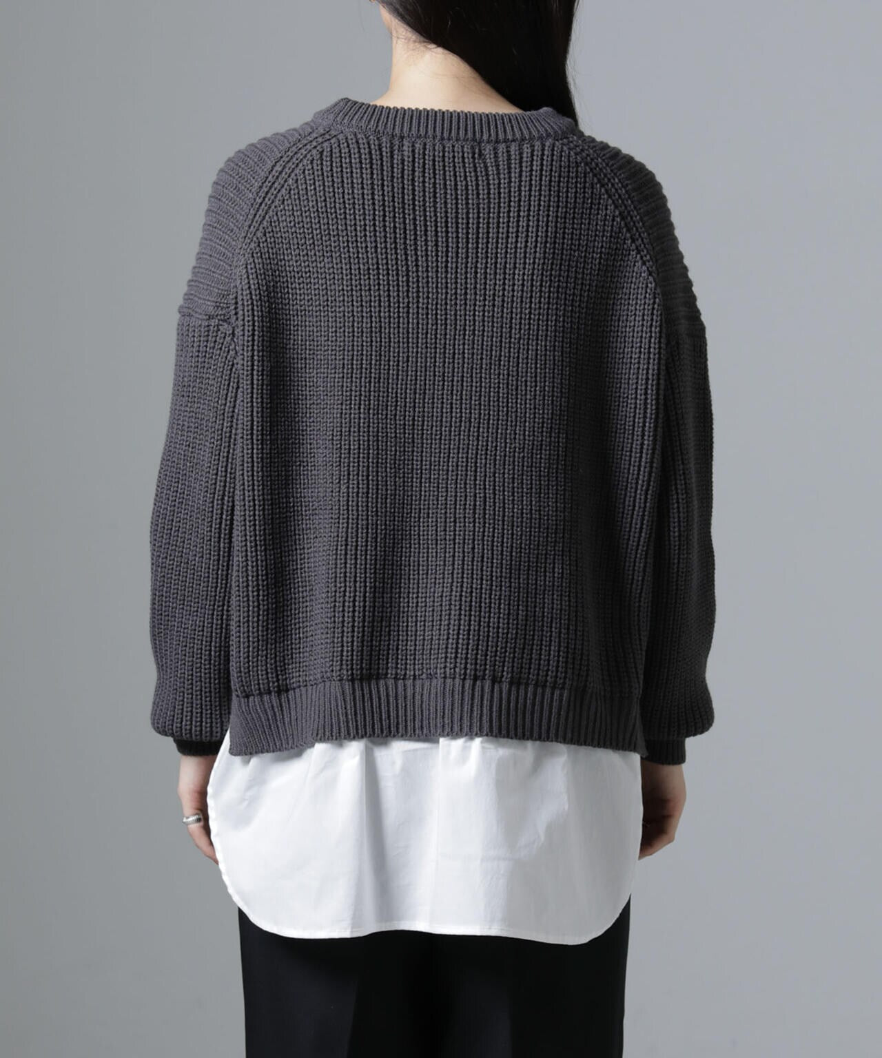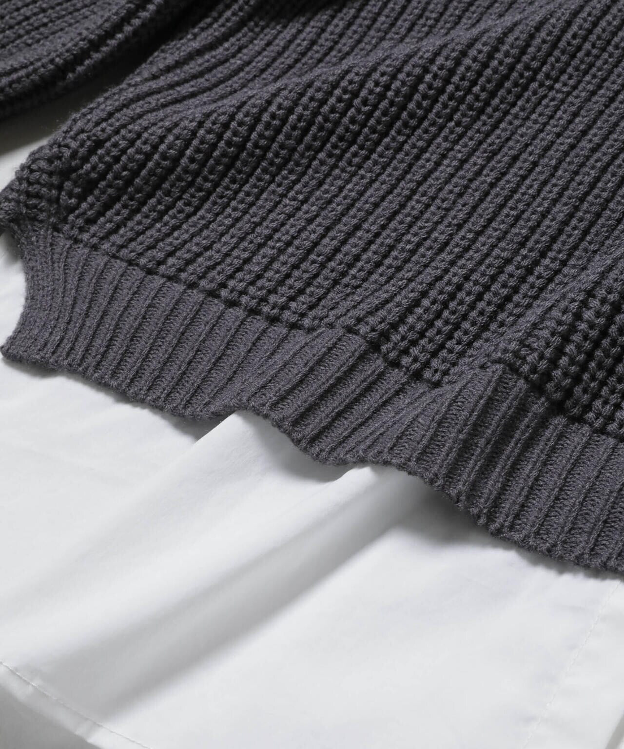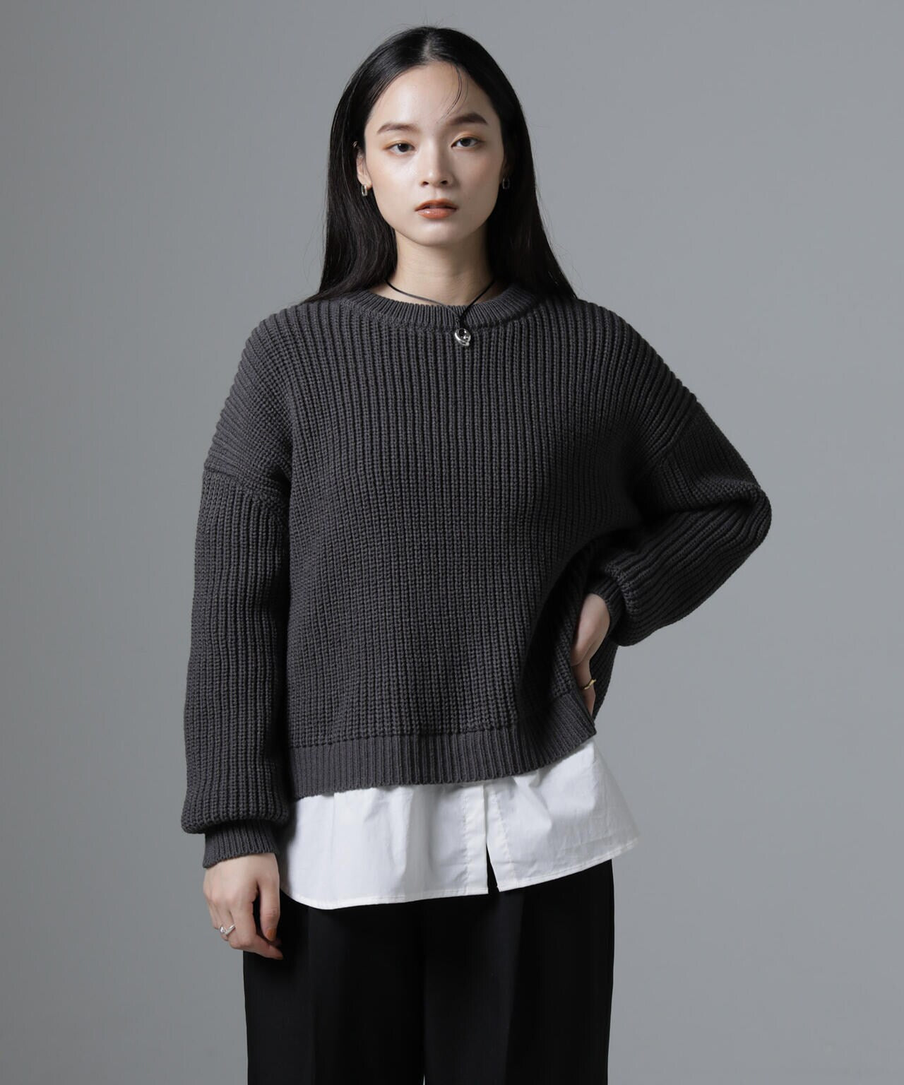 裾から見えるシャツのバランスがこなれ見えする異素材コンビのニット。サイドスリット入りのラウンドカットの裾デザインでボトムを合わせやすく、大人のカジュアルスタイルに重宝するひと品です。