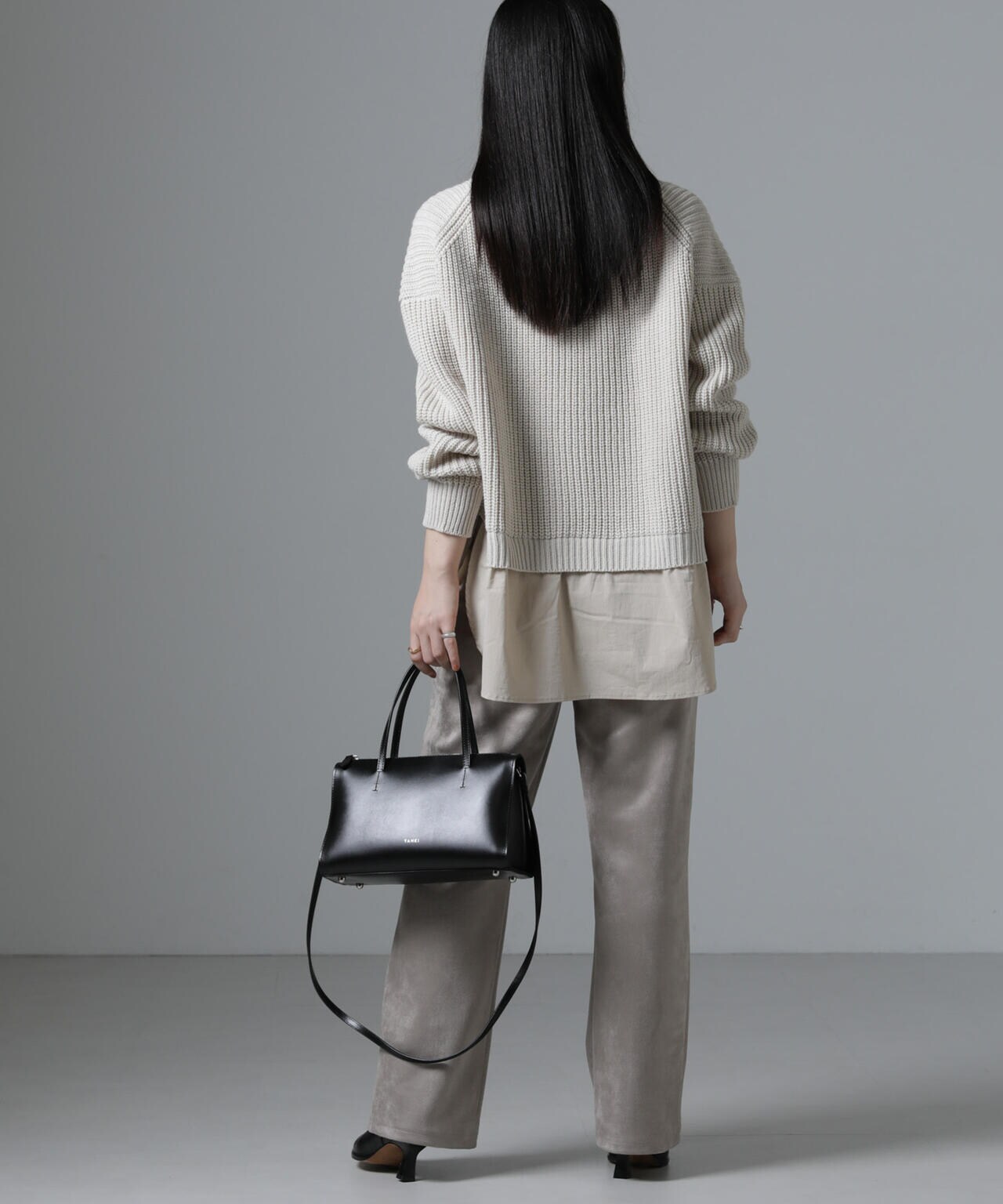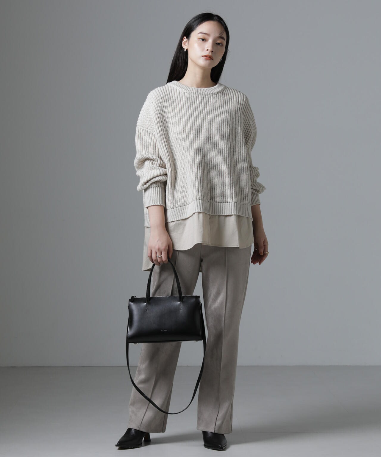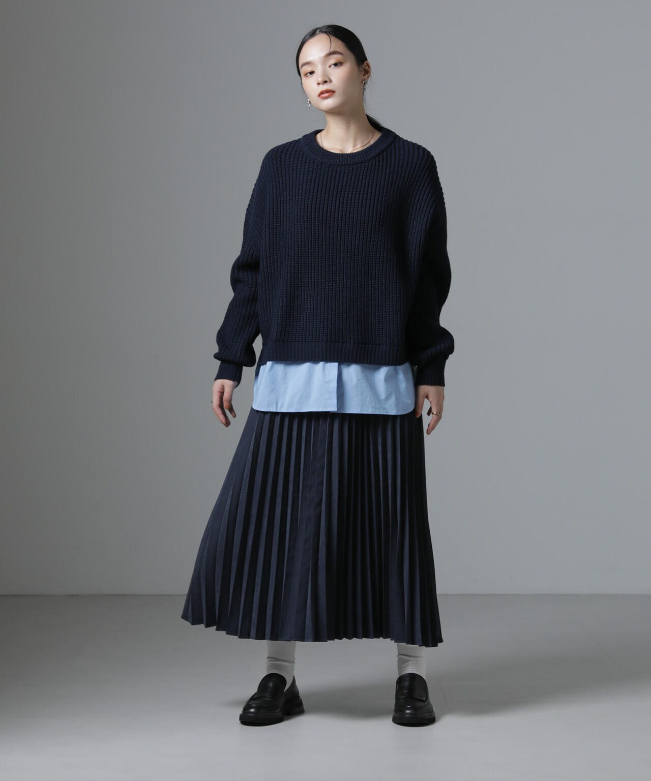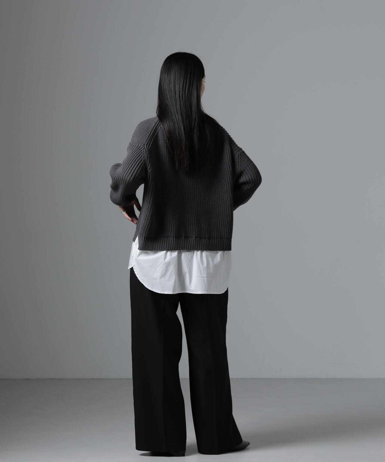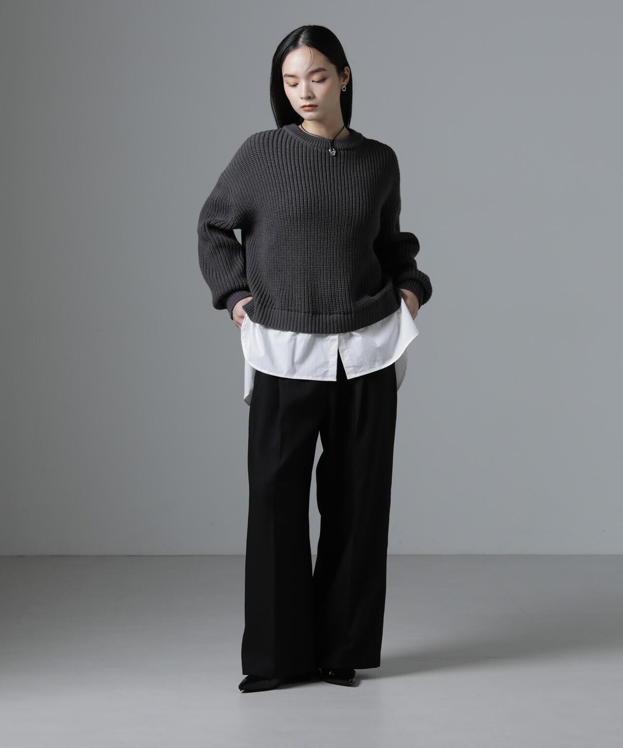 裾から見えるシャツのバランスがこなれ見えする異素材コンビのニット。サイドスリット入りのラウンドカットの裾デザインでボトムを合わせやすく、大人のカジュアルスタイルに重宝するひと品です。
