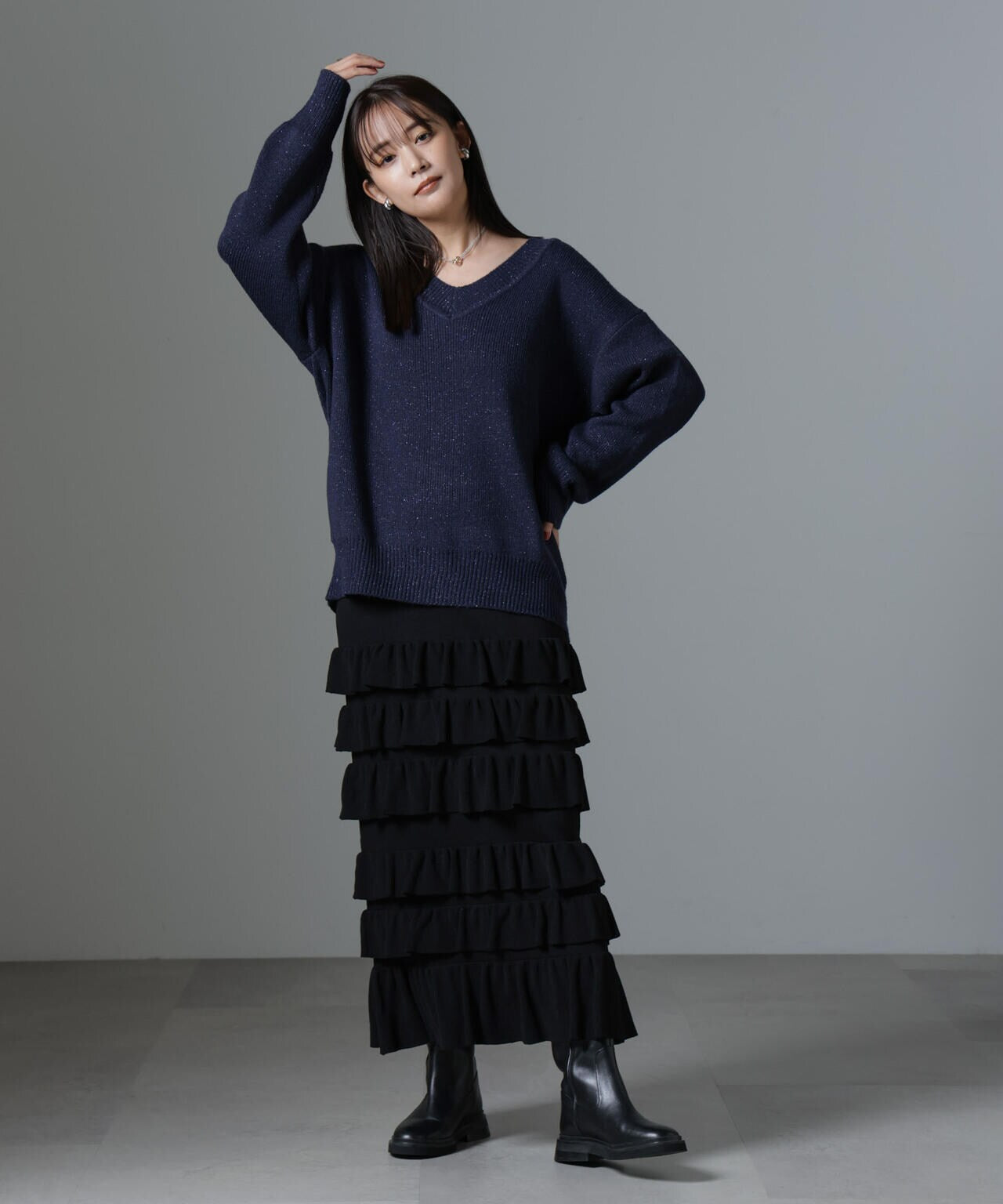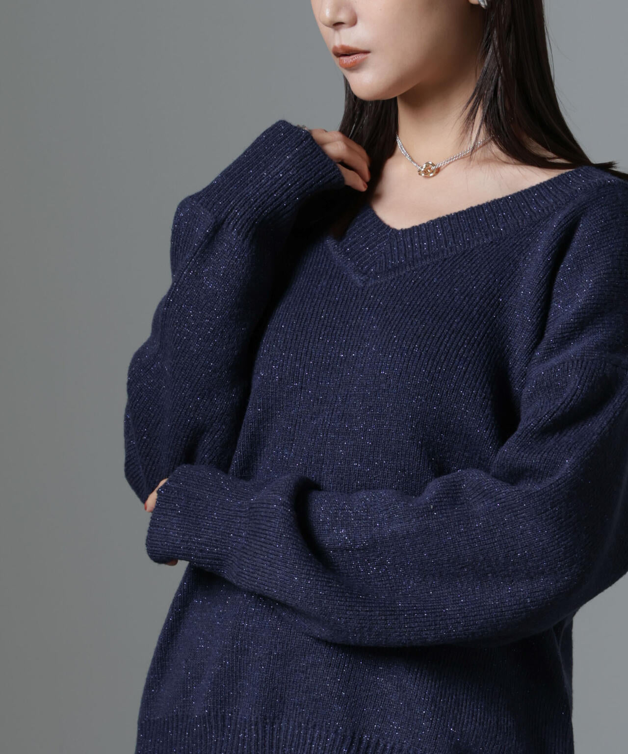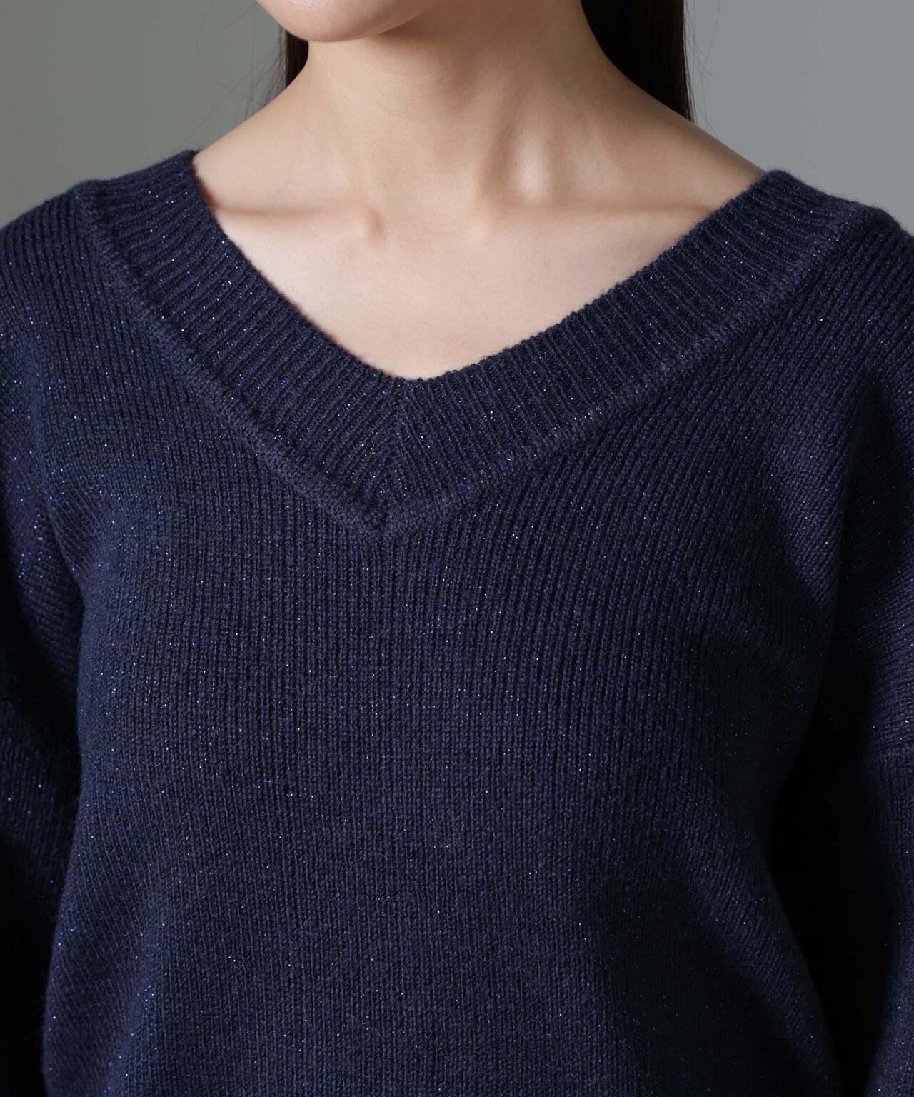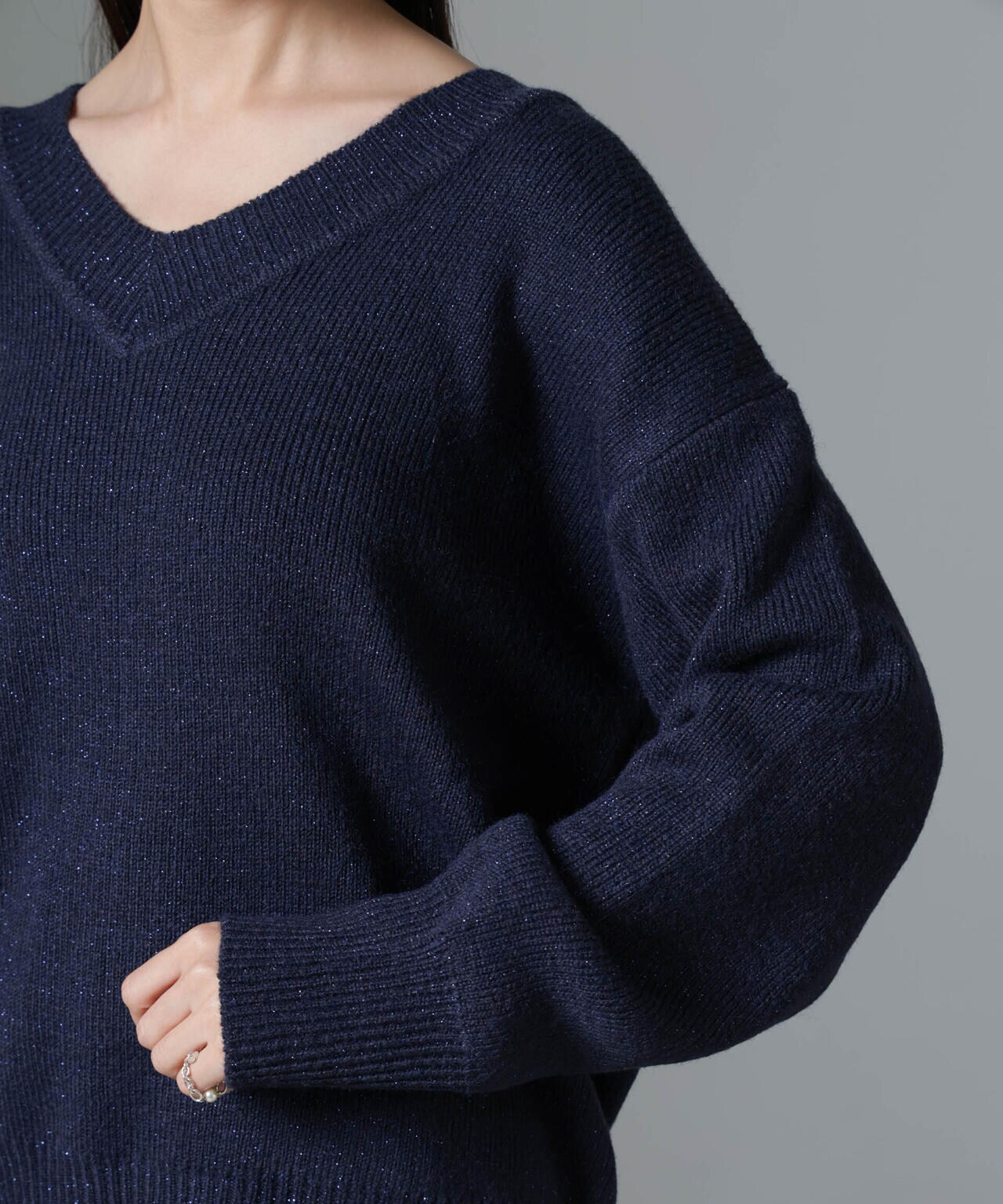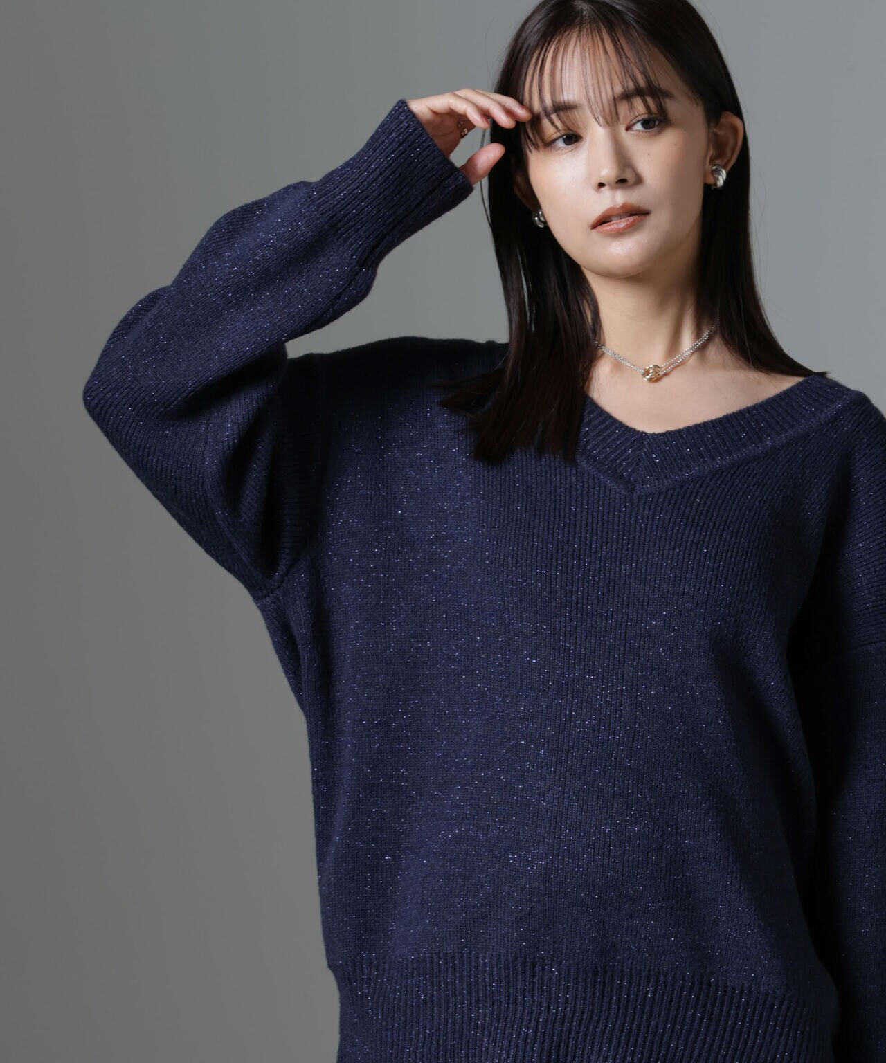 上品なラメがトレンド感を惹きだしてきれるワイドニット。適度なゆとりのあるリラックス感あるシルエットで、Vネックが抜け感がありヘルシーな印象に◎。一枚着でも大人っぽい雰囲気でサマになるアイテムです。