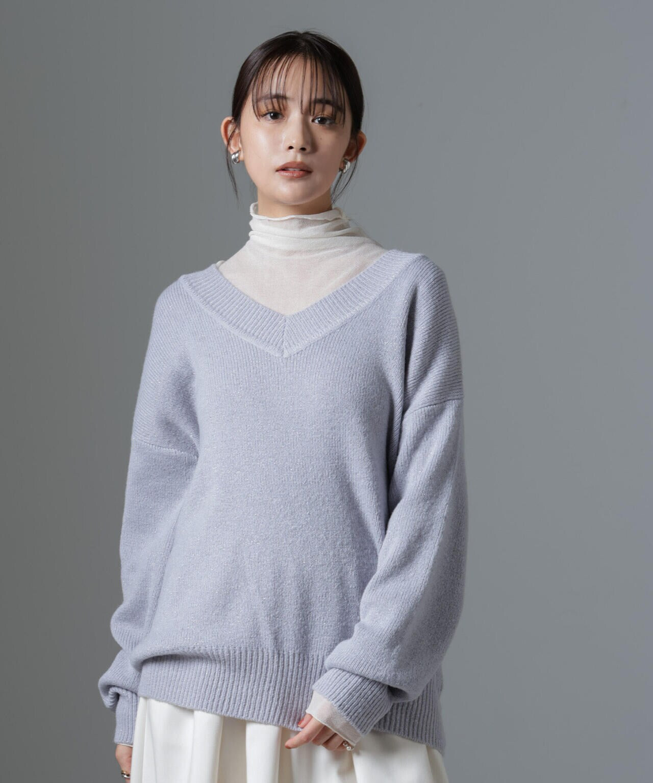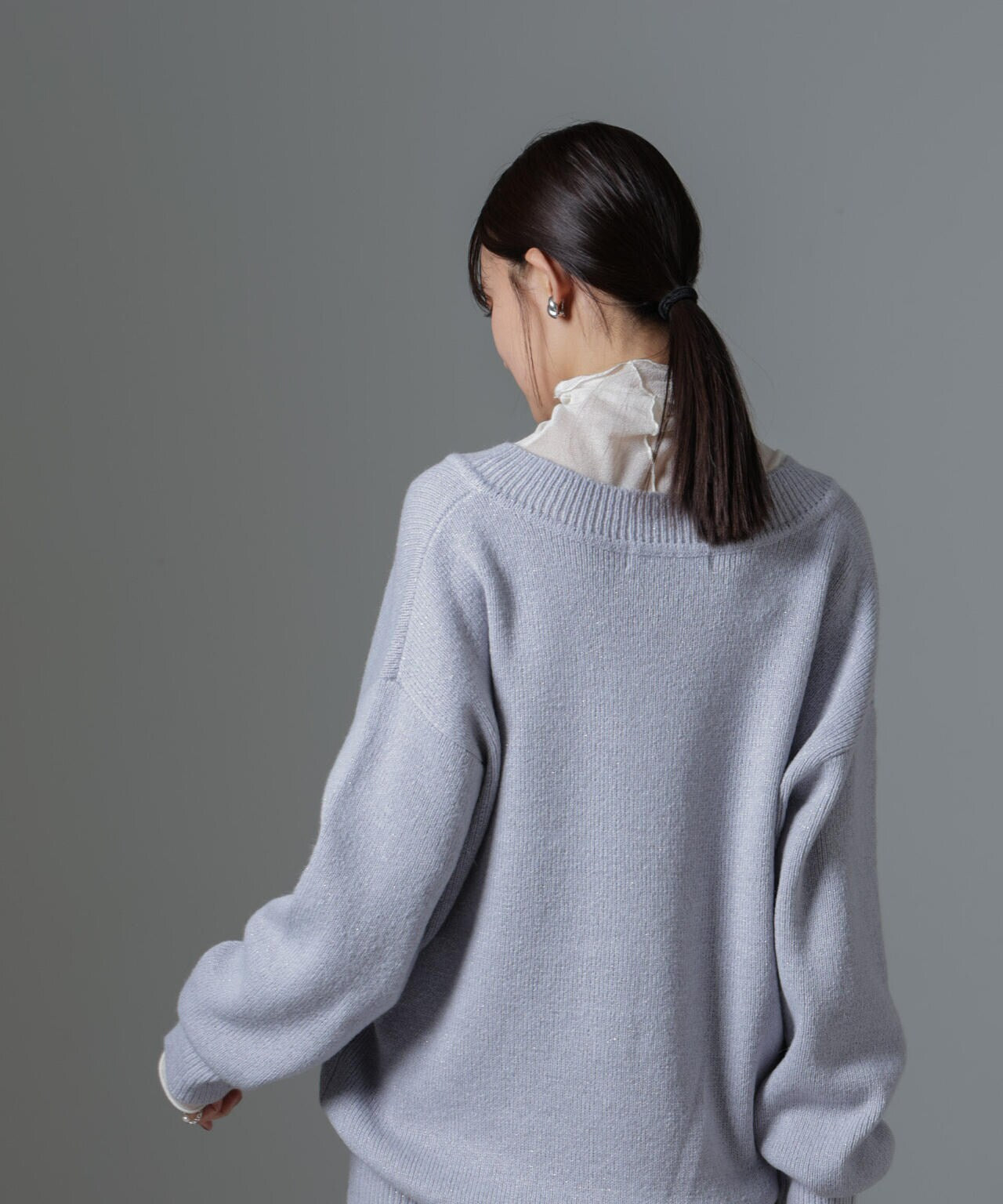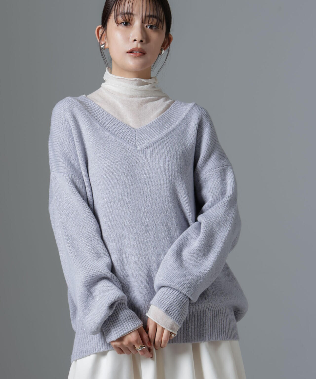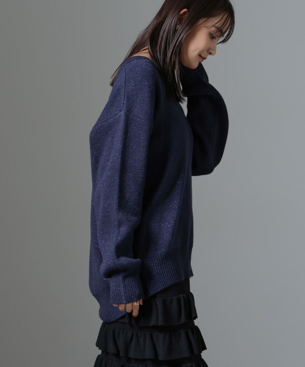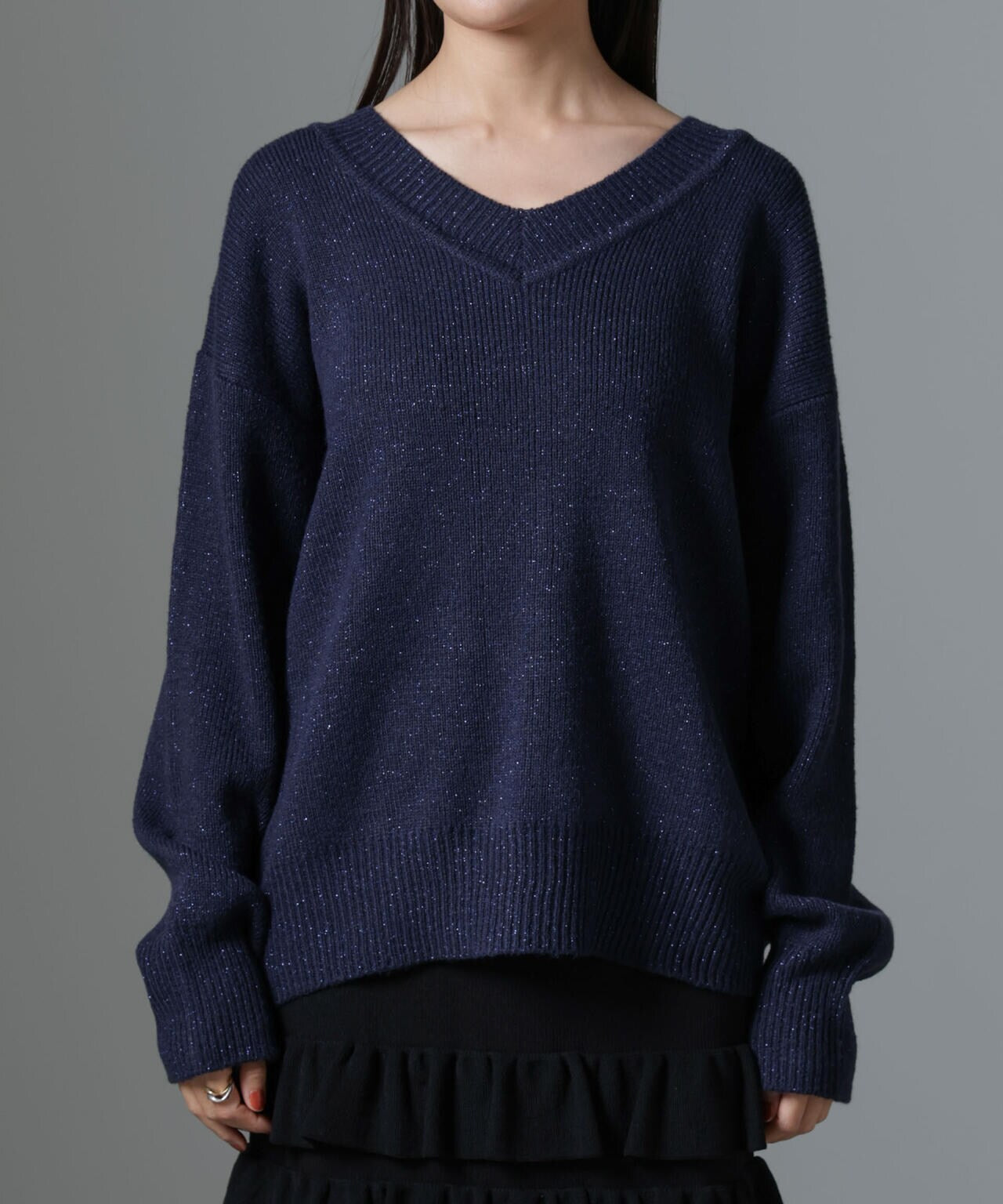 上品なラメがトレンド感を惹きだしてきれるワイドニット。適度なゆとりのあるリラックス感あるシルエットで、Vネックが抜け感がありヘルシーな印象に◎。一枚着でも大人っぽい雰囲気でサマになるアイテムです。