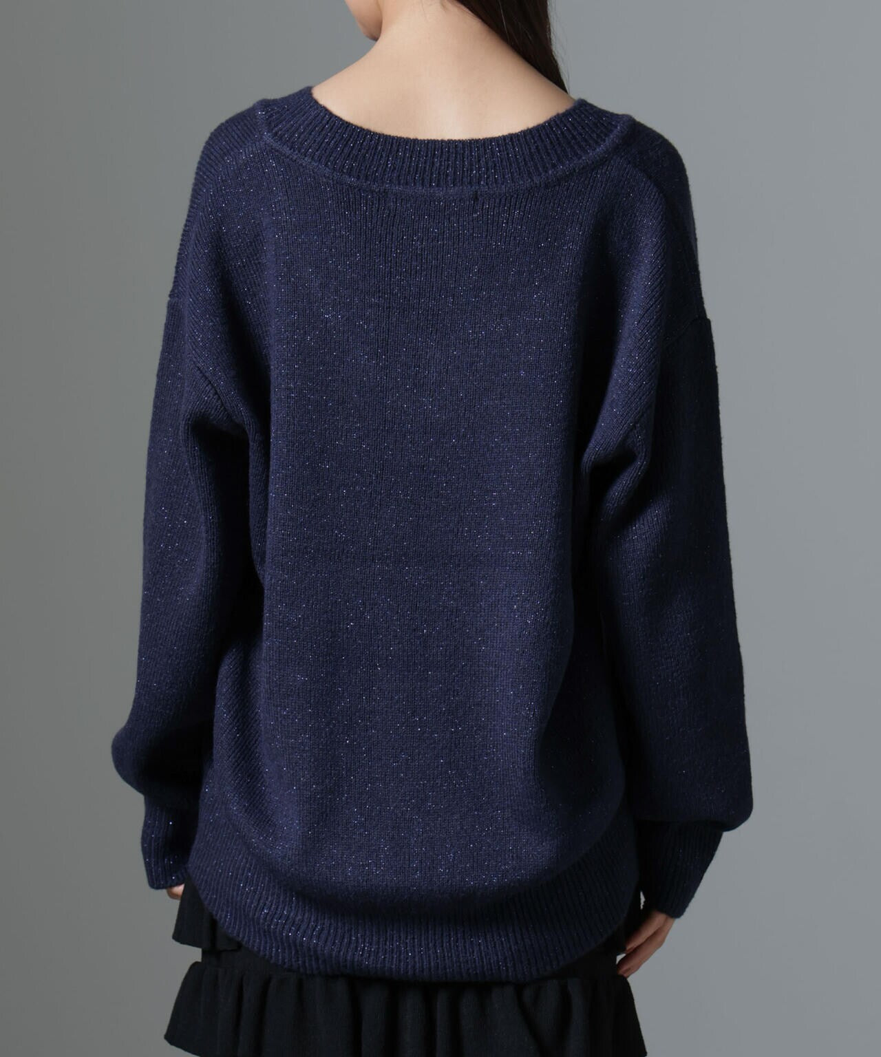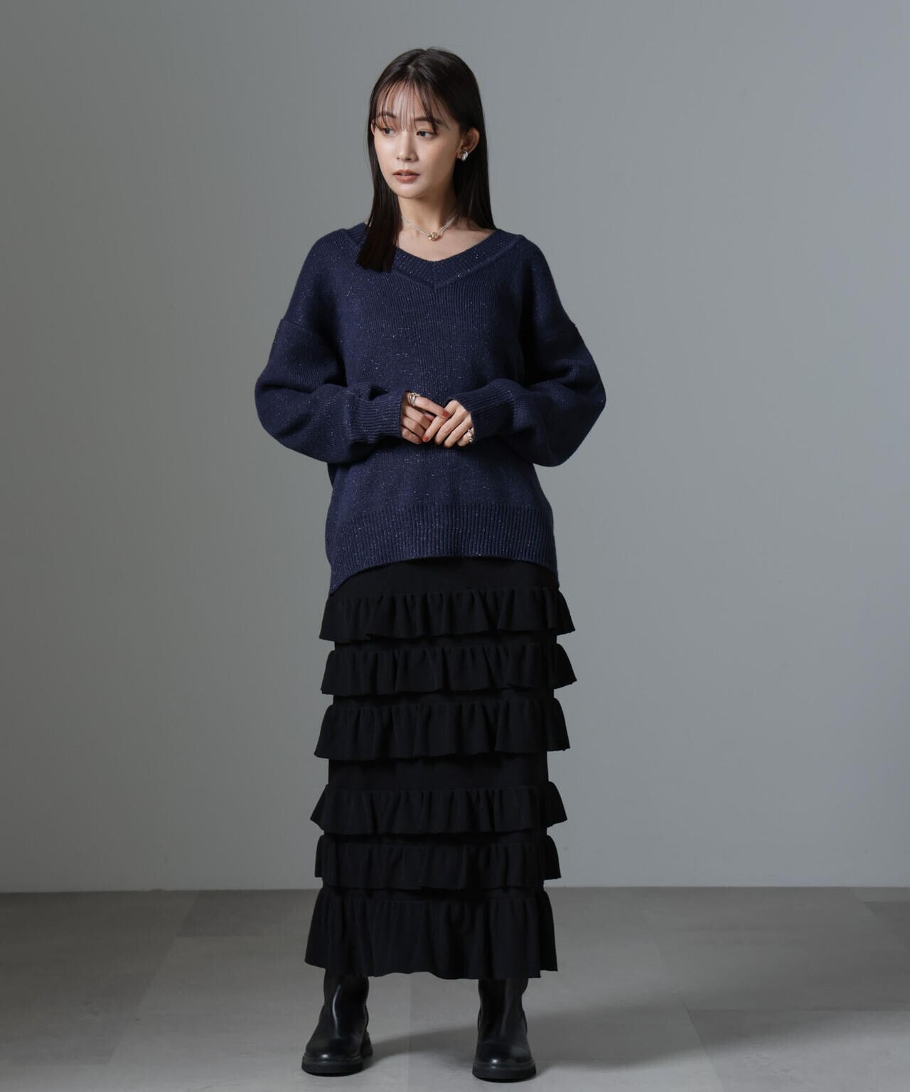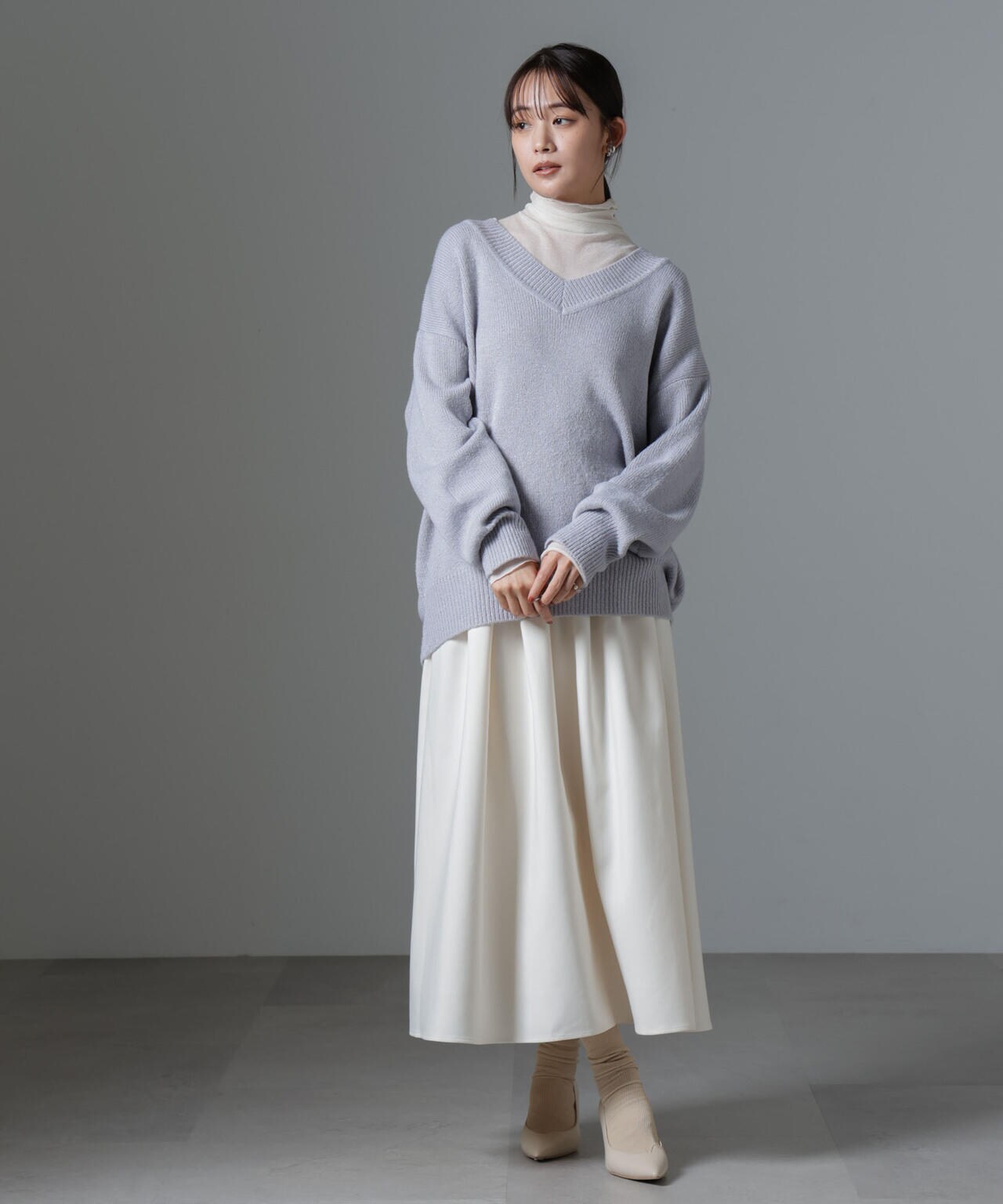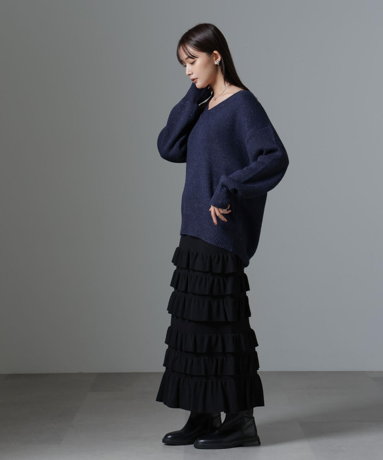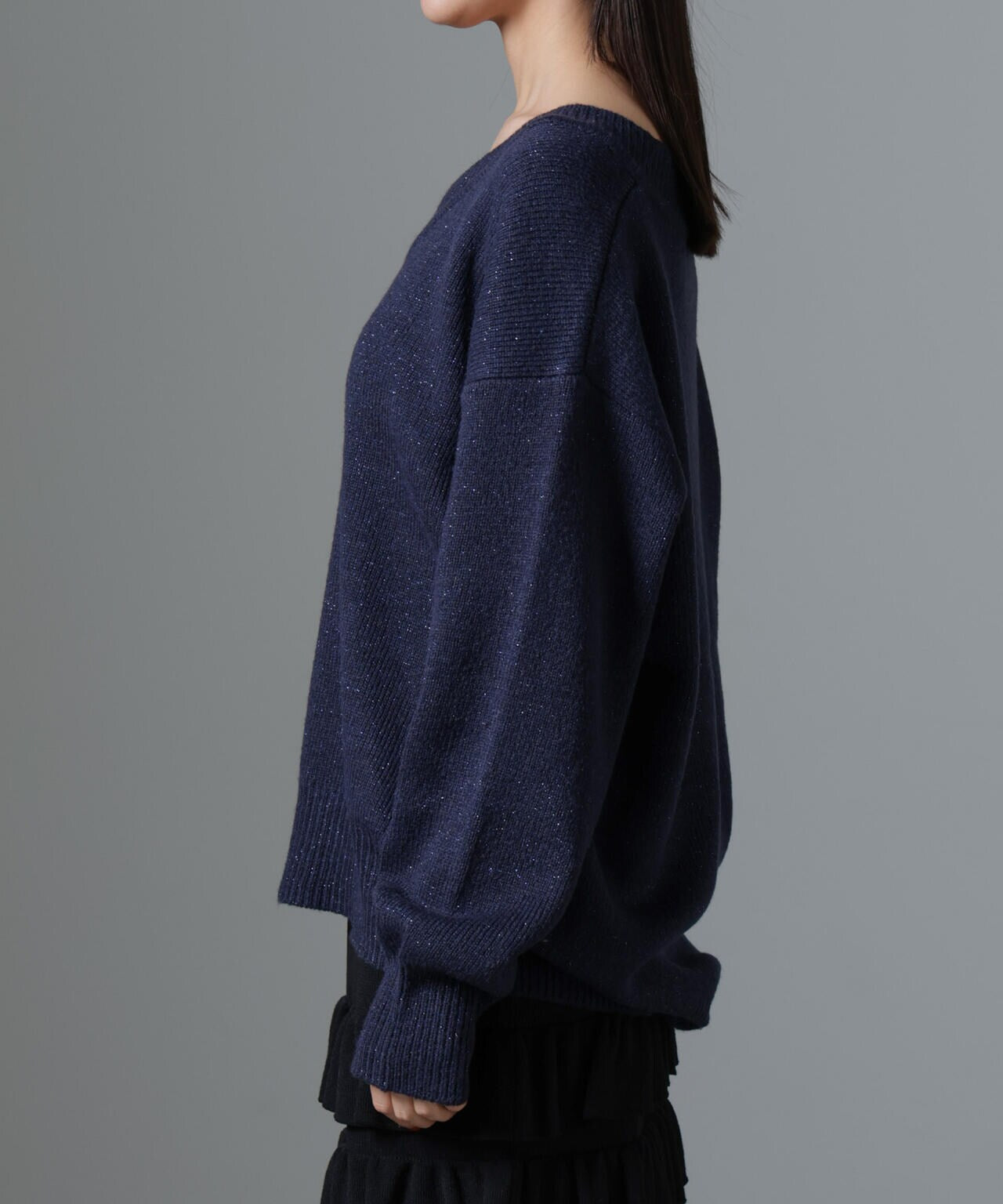 上品なラメがトレンド感を惹きだしてきれるワイドニット。適度なゆとりのあるリラックス感あるシルエットで、Vネックが抜け感がありヘルシーな印象に◎。一枚着でも大人っぽい雰囲気でサマになるアイテムです。