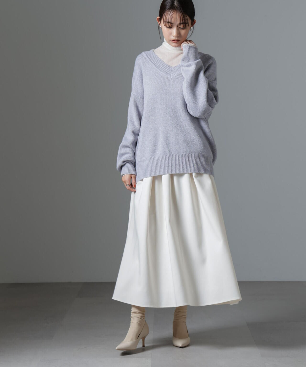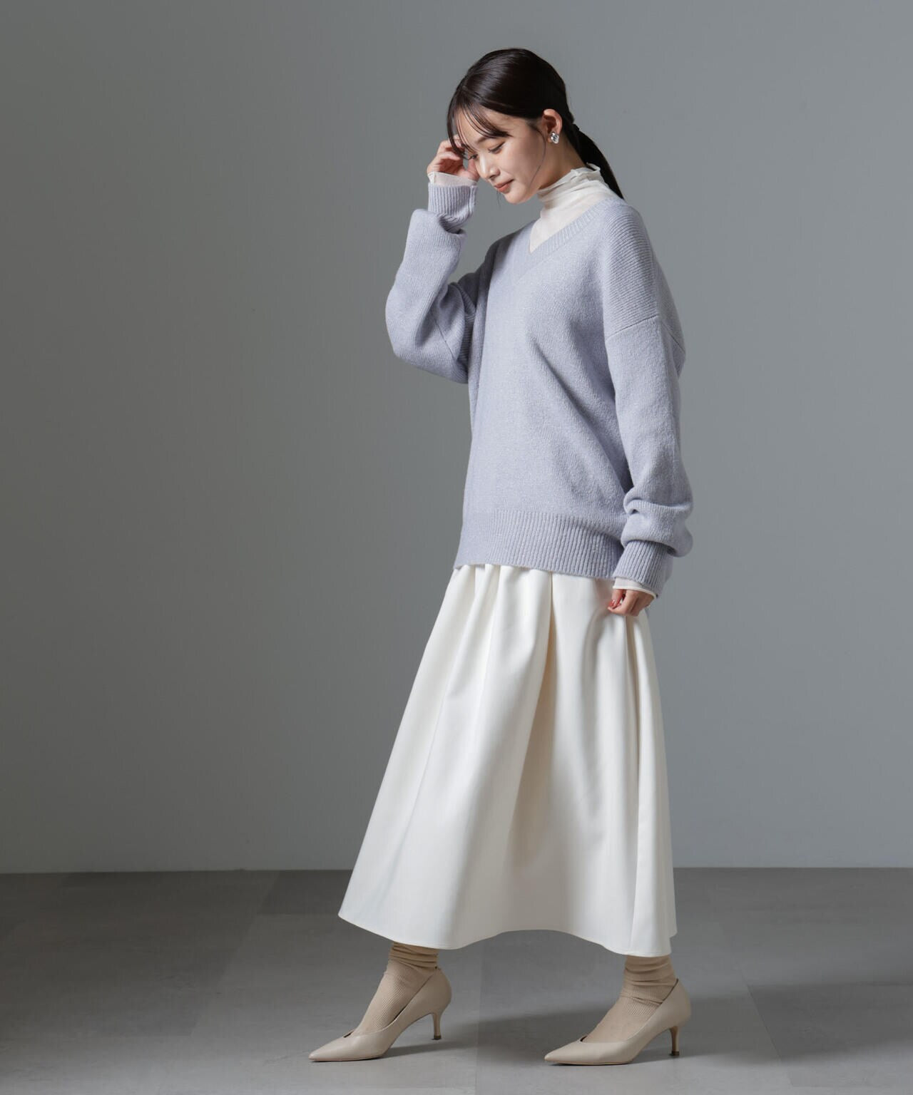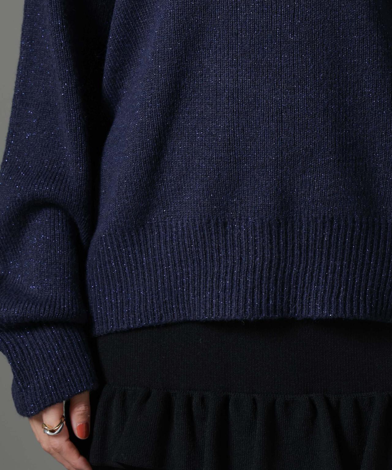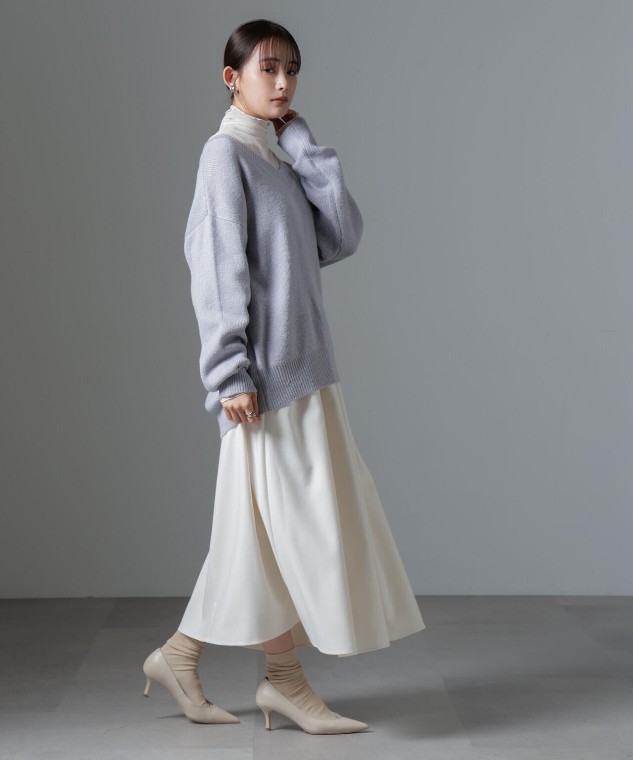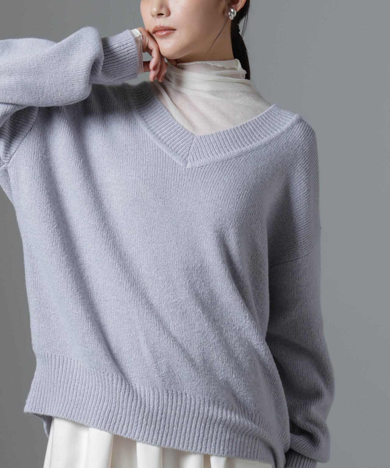 上品なラメがトレンド感を惹きだしてきれるワイドニット。適度なゆとりのあるリラックス感あるシルエットで、Vネックが抜け感がありヘルシーな印象に◎。一枚着でも大人っぽい雰囲気でサマになるアイテムです。
