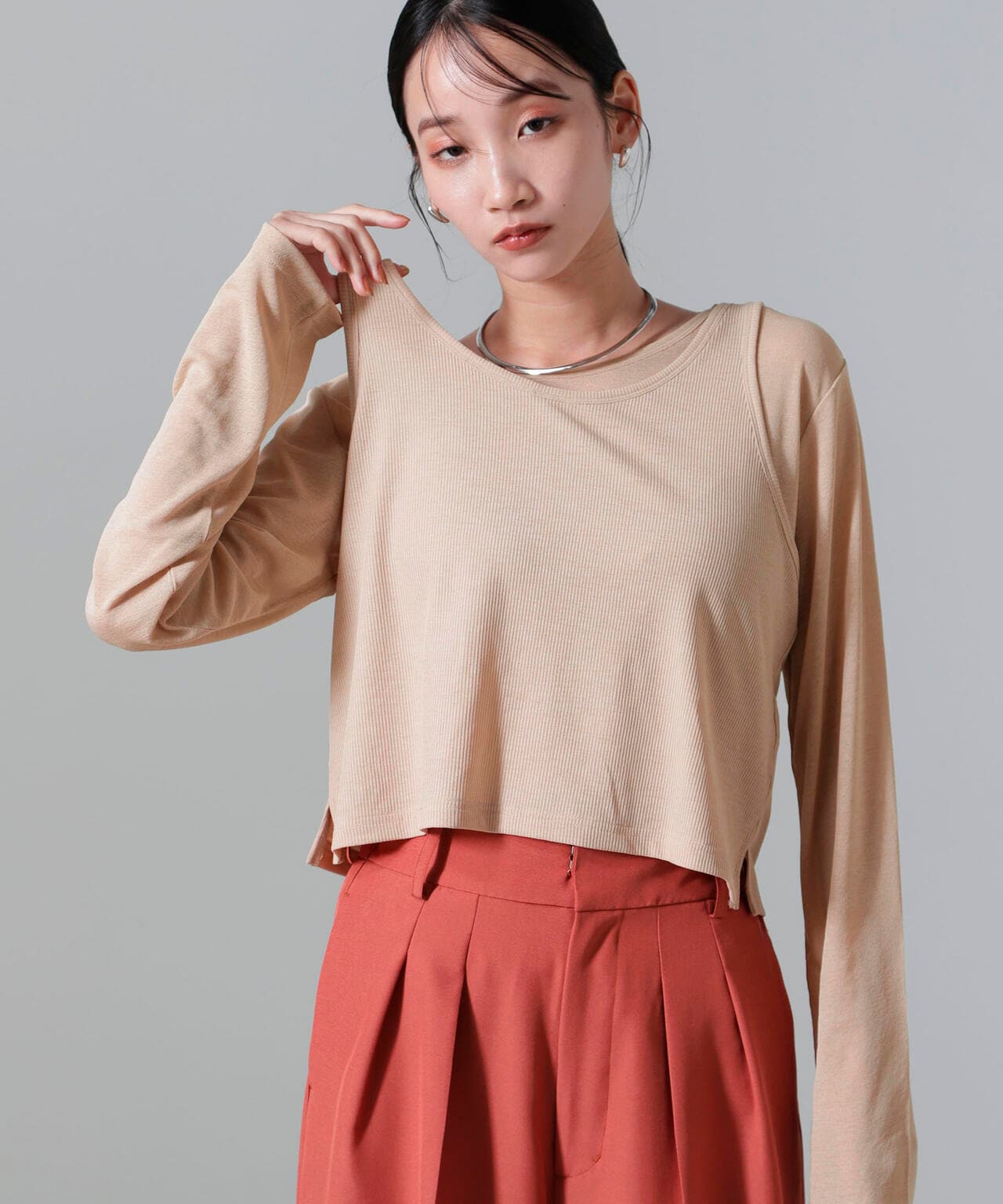 ロングTシャツと、タンクトップのシアーレイヤードトップス。透け感のある素材をそれぞれ異なる編地を組み合わせているのが魅力的ポイント◎セットになっているので、簡単にトレンド感のあるレイヤードスタイルを楽しめます。ロングTシャツ、タンクトップそれぞれ単品でも使えるのでスタイリングの幅が広がる万能なアイテムです。
