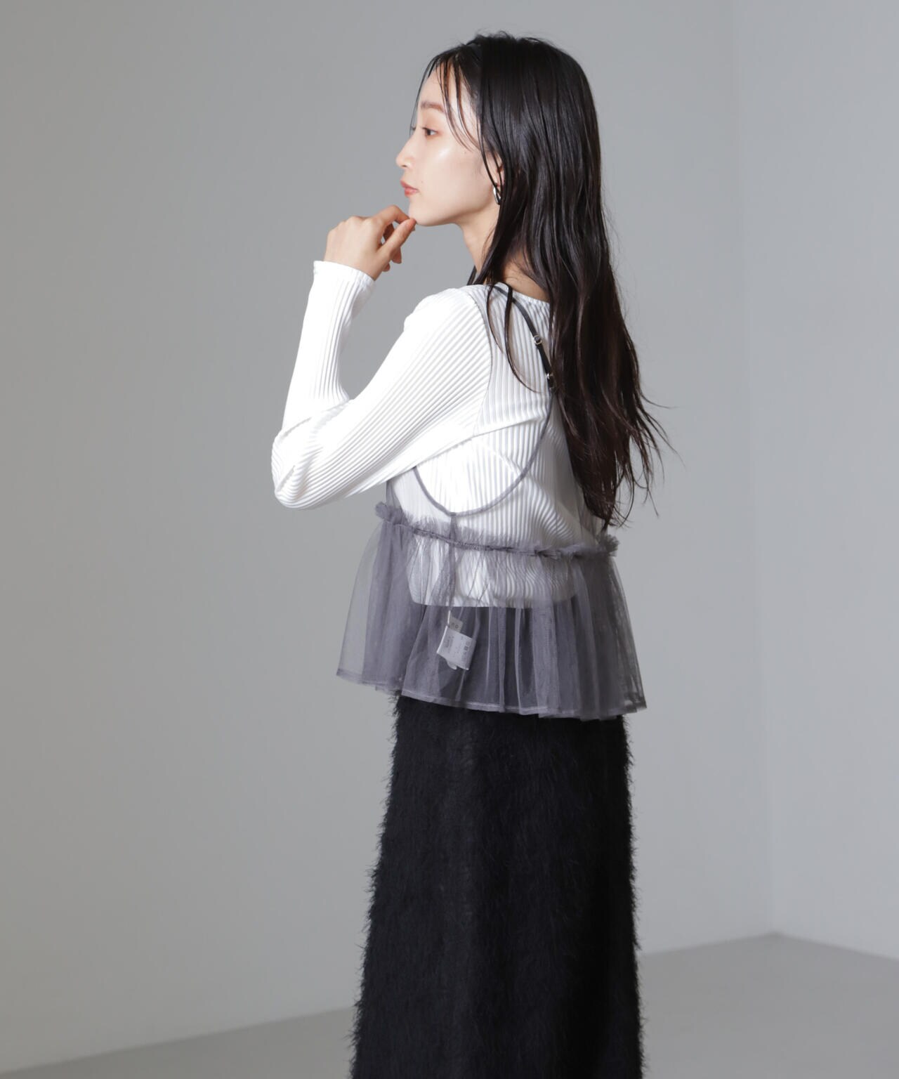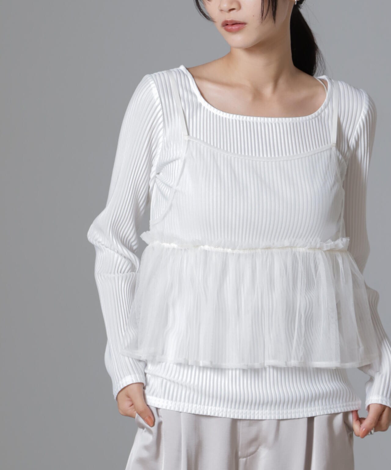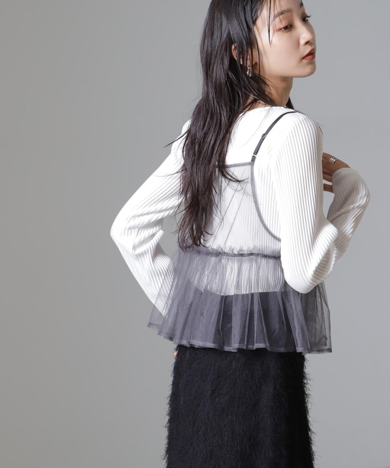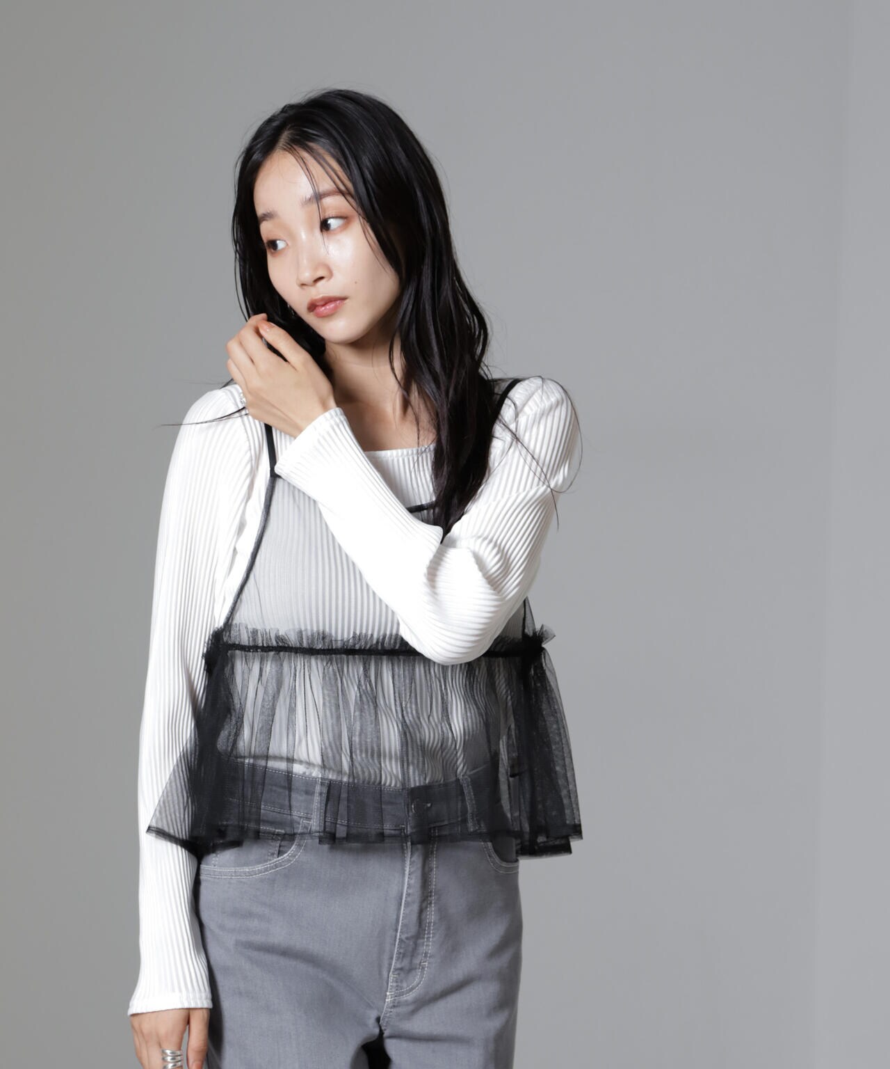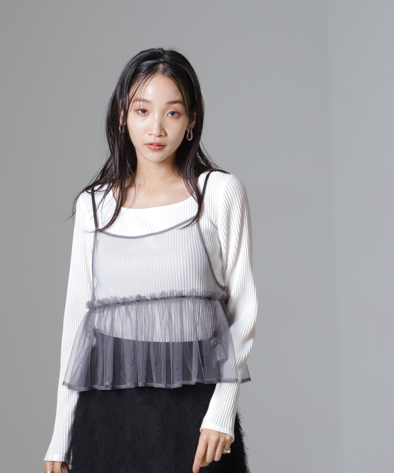 トレンド感のある着こなしが楽しめるチュールキャミとロンTのセットアイテム。ソフトなチュールを使用したっぷりとしたギャザーを寄せたディテール。テレコロンTは前後2WAYなので気分によってアレンジしたり、単品でもレイヤードスタイルでも楽しめる逸品です!