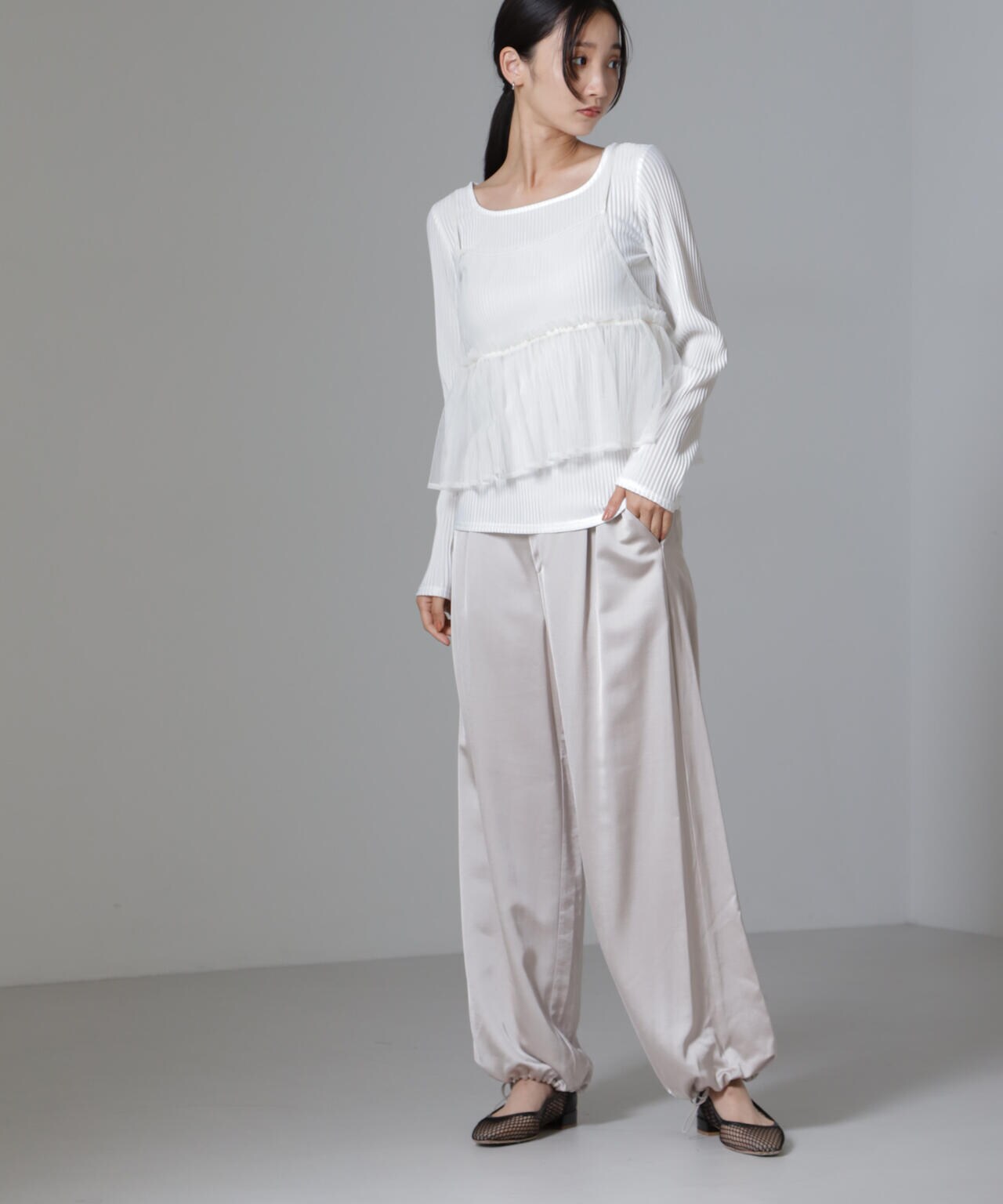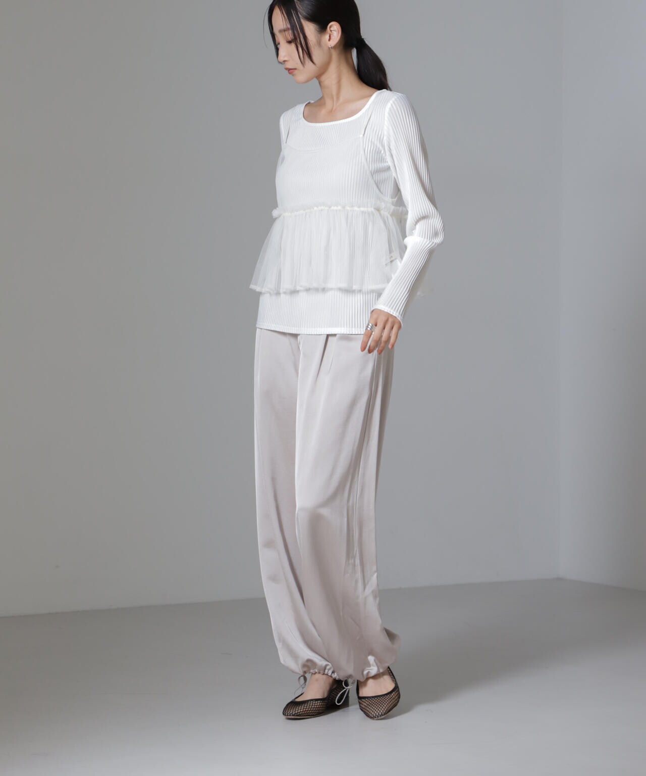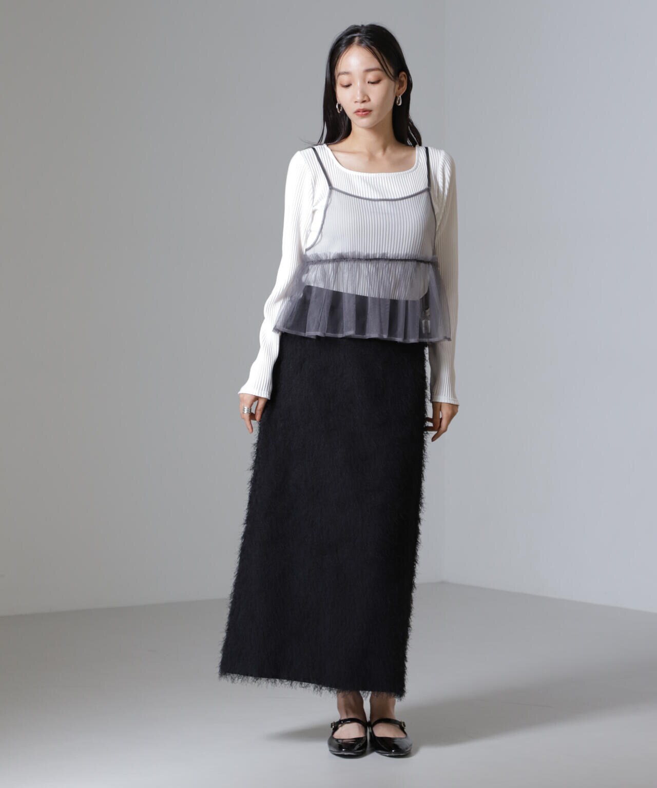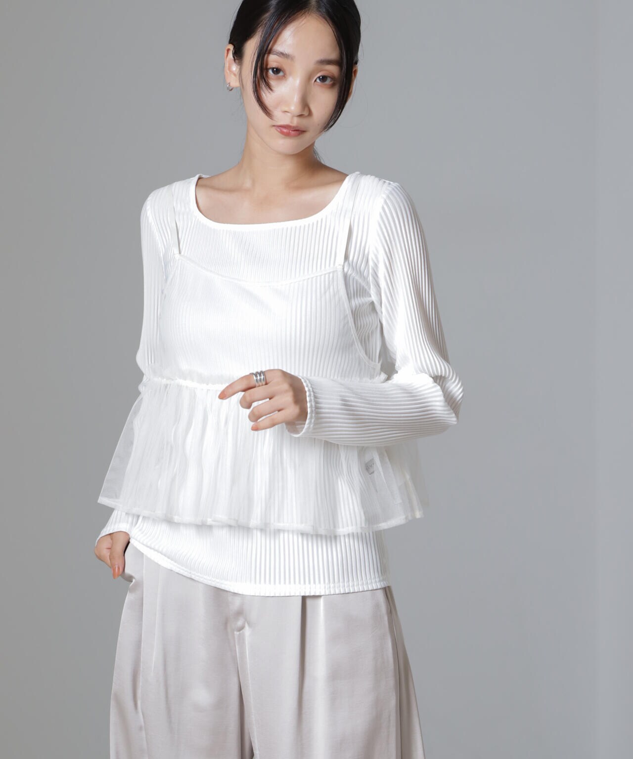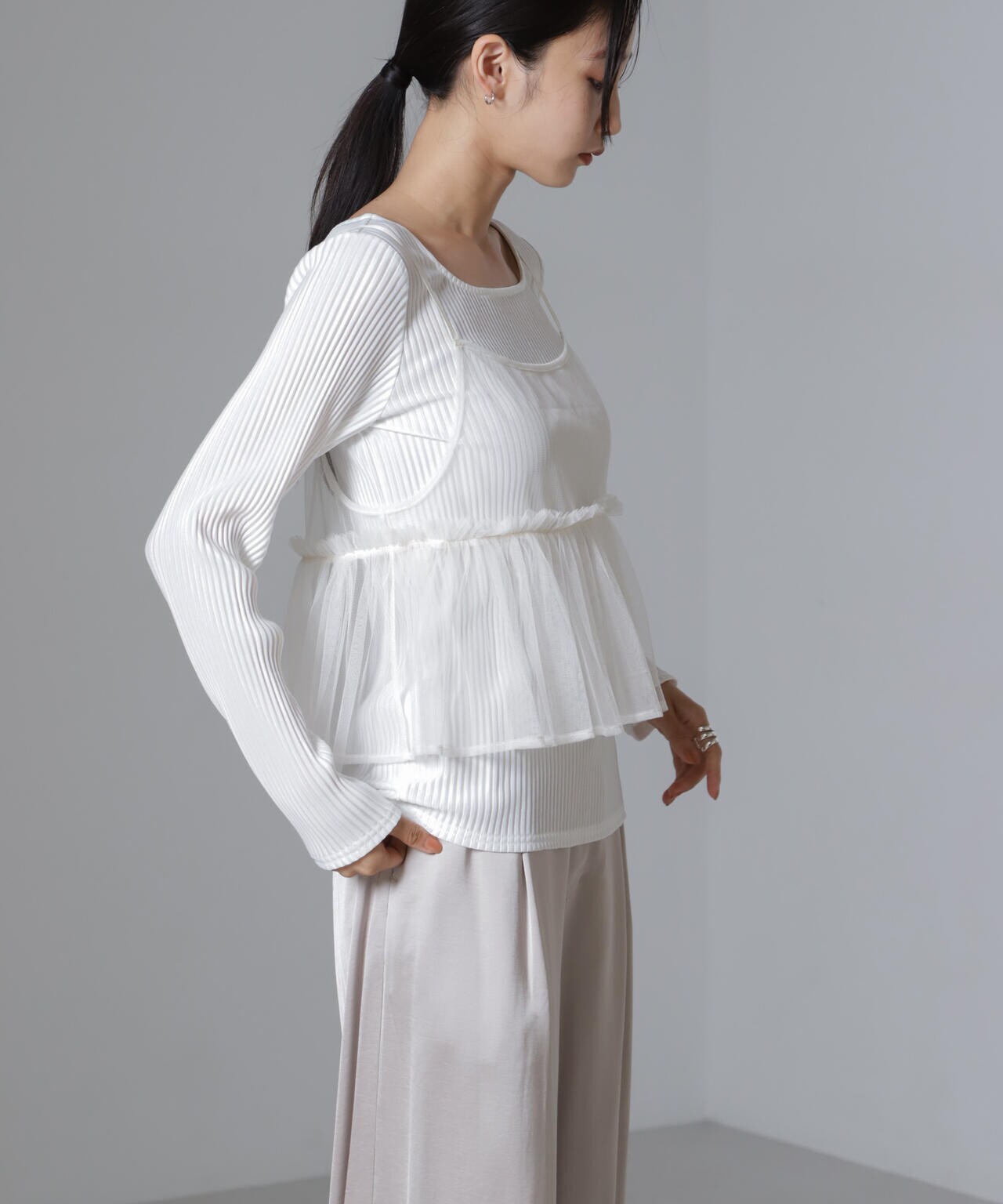 トレンド感のある着こなしが楽しめるチュールキャミとロンTのセットアイテム。ソフトなチュールを使用したっぷりとしたギャザーを寄せたディテール。テレコロンTは前後2WAYなので気分によってアレンジしたり、単品でもレイヤードスタイルでも楽しめる逸品です!