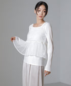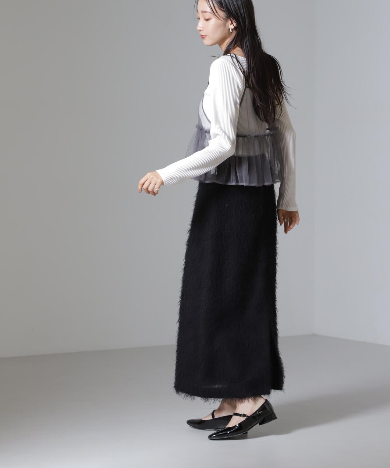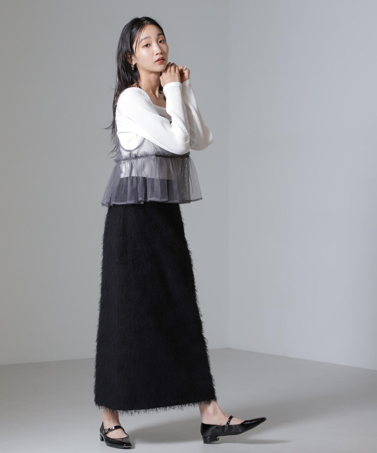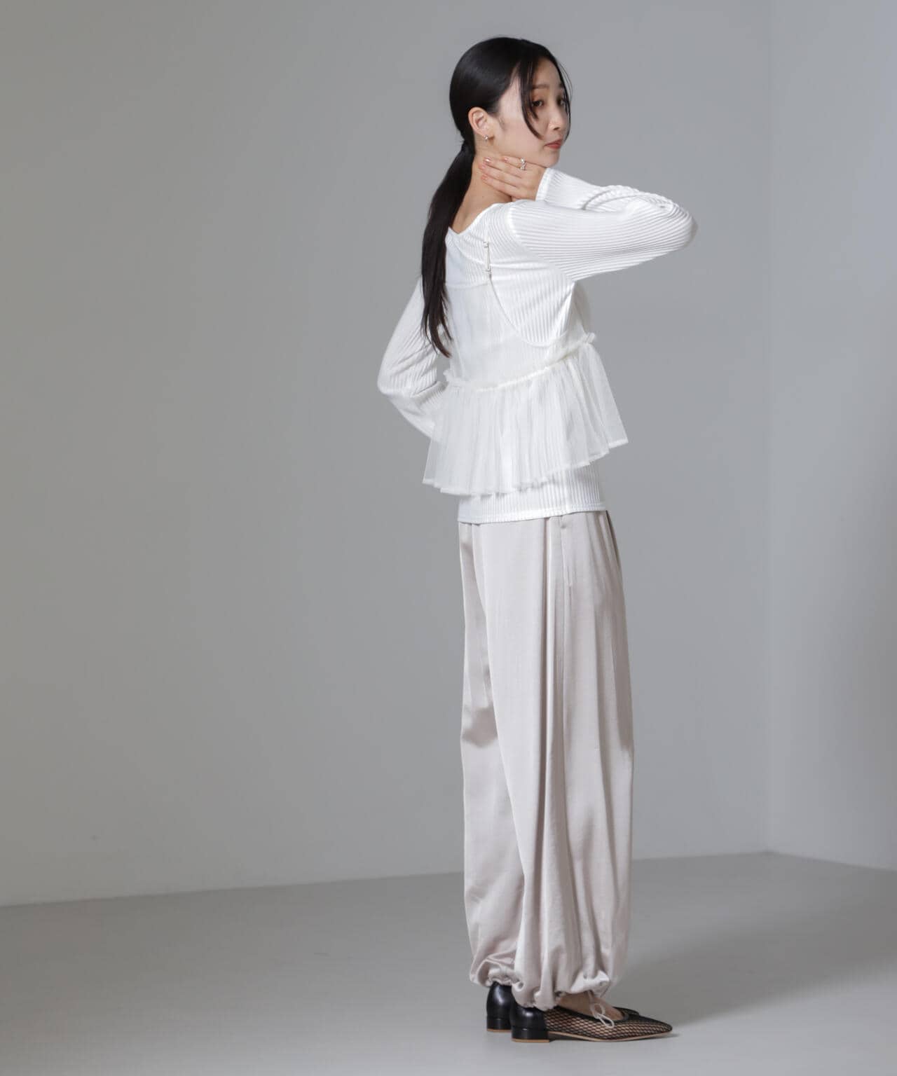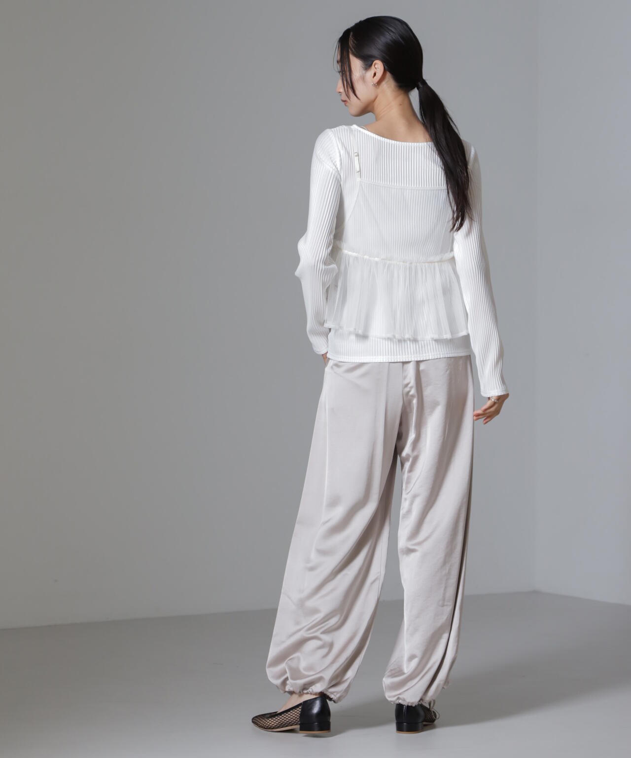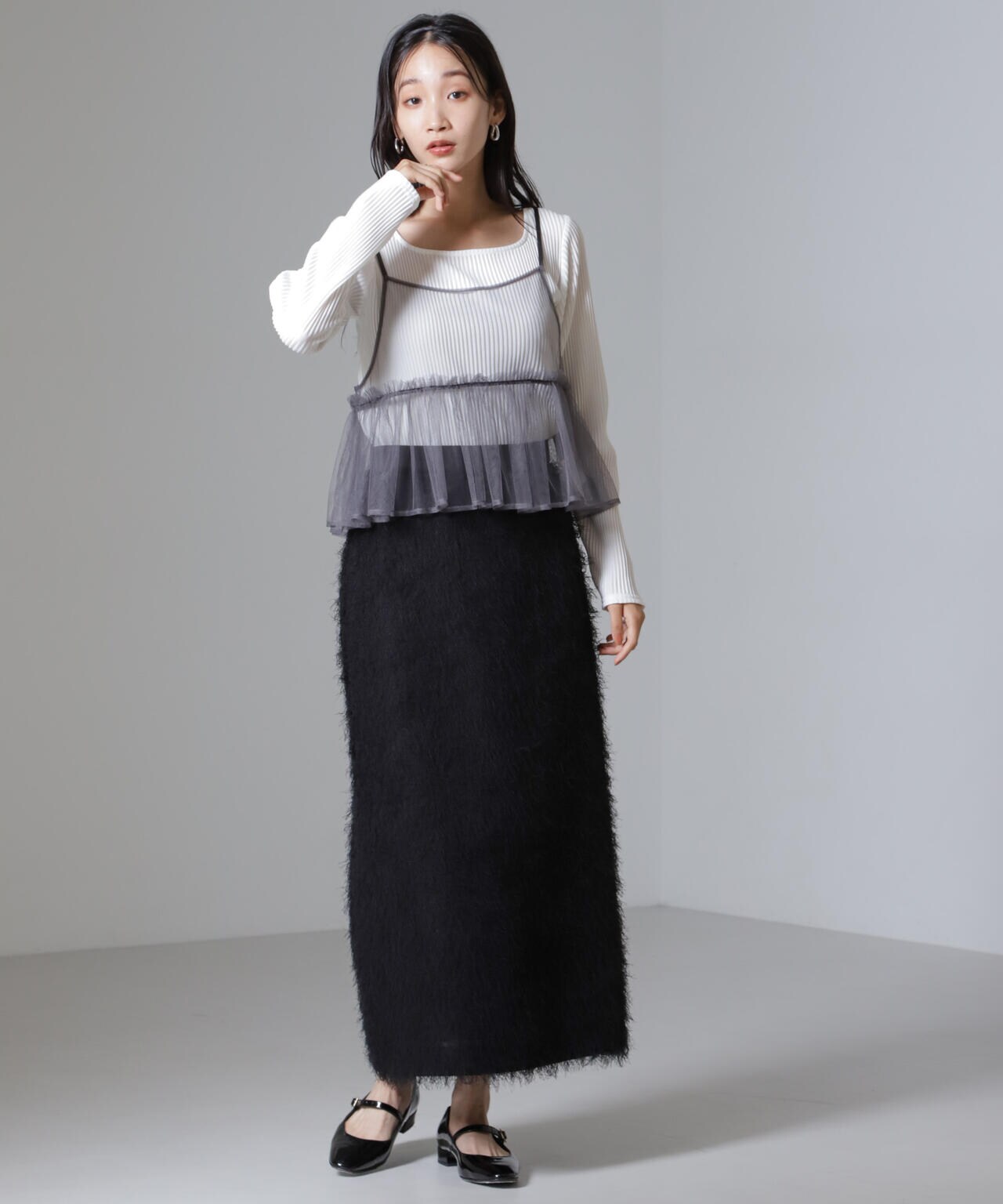 トレンド感のある着こなしが楽しめるチュールキャミとロンTのセットアイテム。ソフトなチュールを使用したっぷりとしたギャザーを寄せたディテール。テレコロンTは前後2WAYなので気分によってアレンジしたり、単品でもレイヤードスタイルでも楽しめる逸品です!