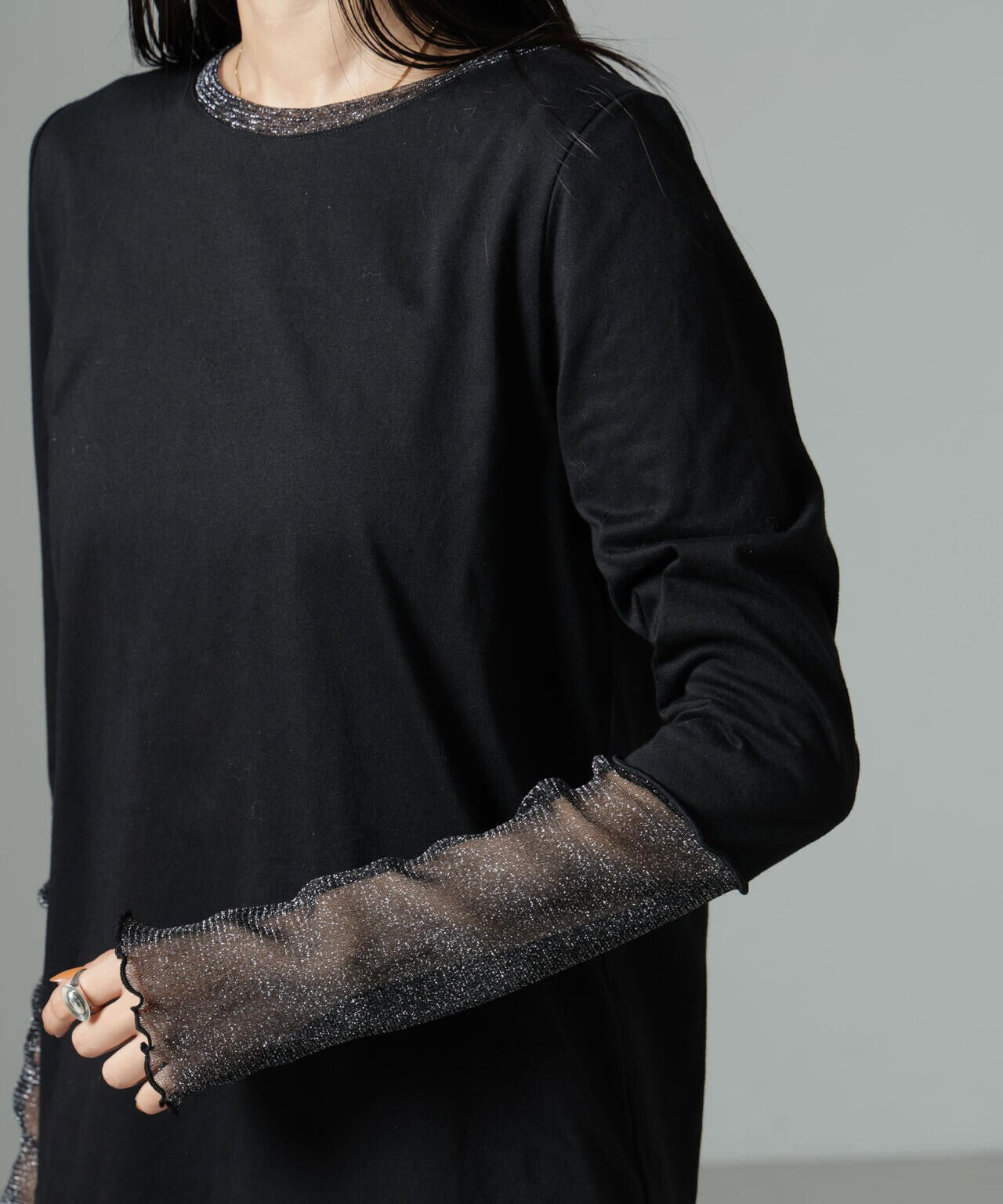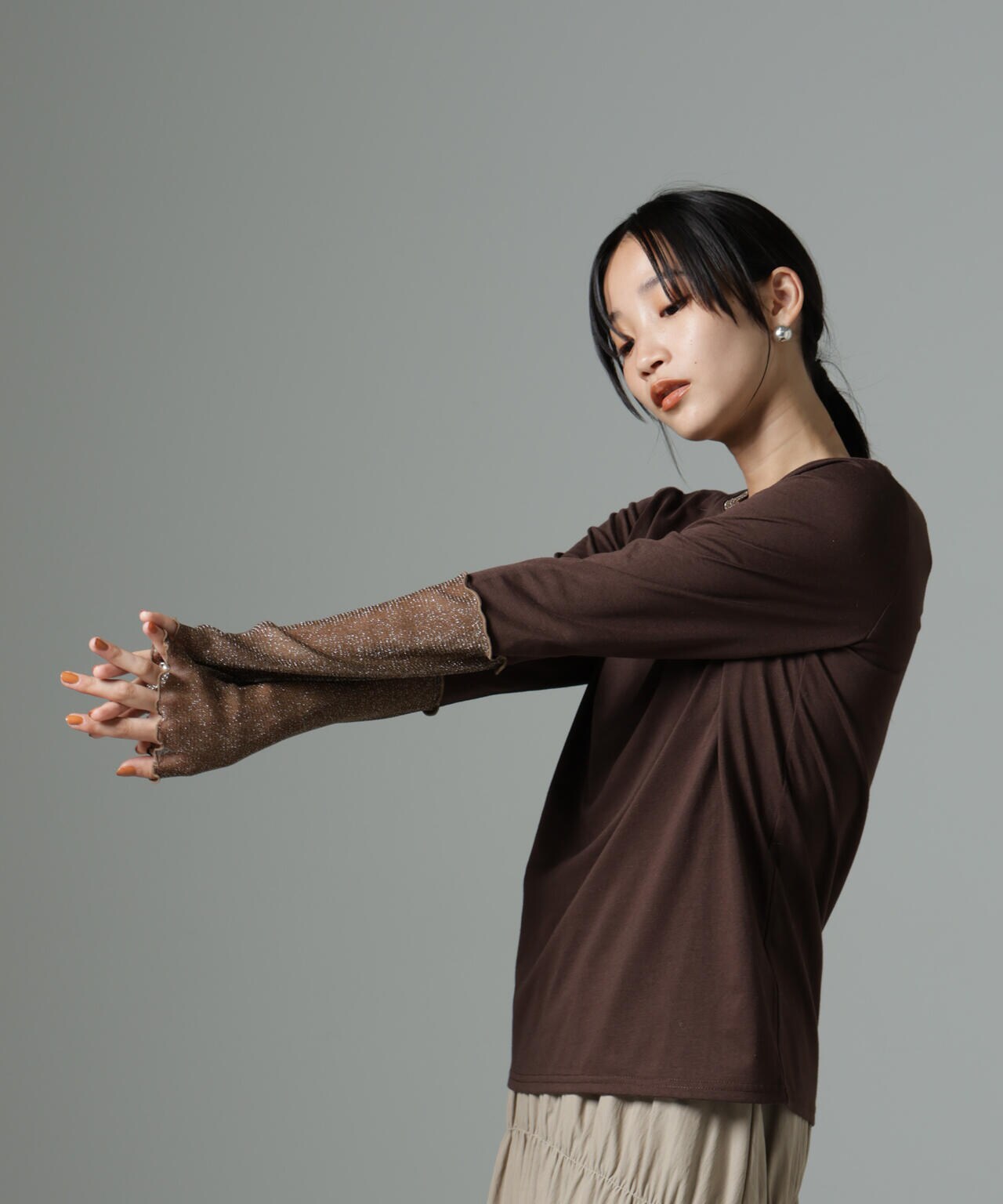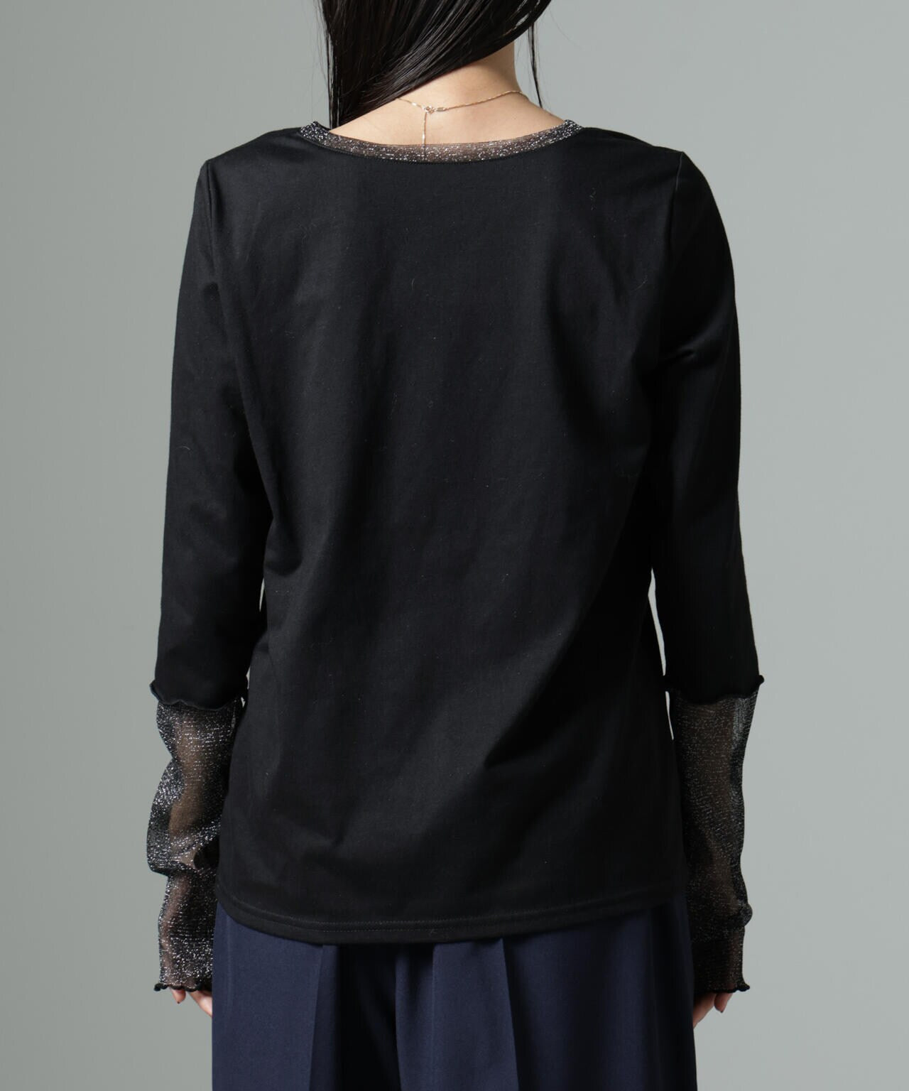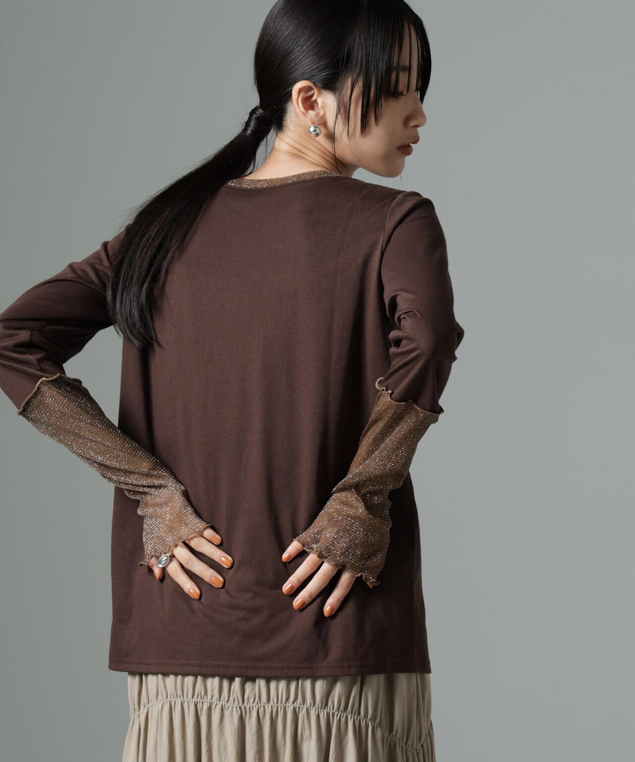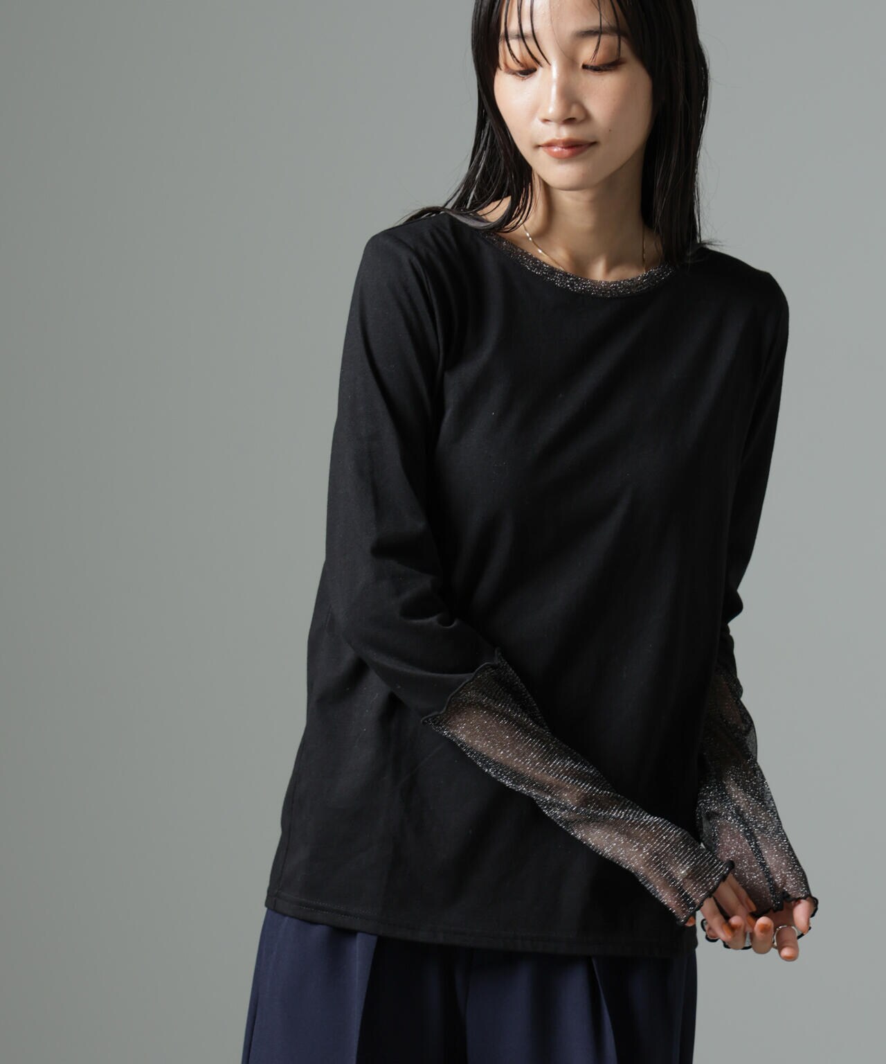 レイヤードスタイルが楽しめるロングTシャツカットソー。袖口と衿まわりが、シアーラメのカットソー素材になっているので、チラっと見えるだけでも華やかな雰囲気に◎。切り替えデザインにより、シルエットやスタイルに変化を持たせることができ、コーディネートの幅も広がります!