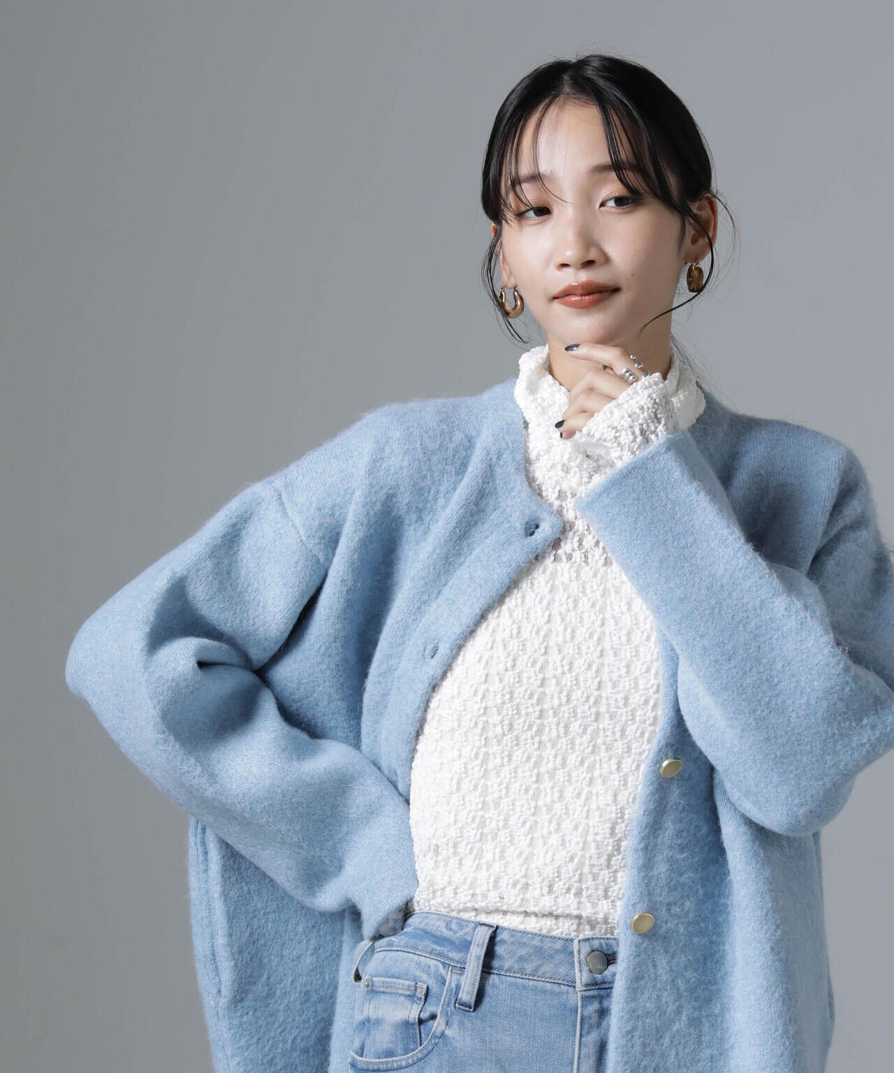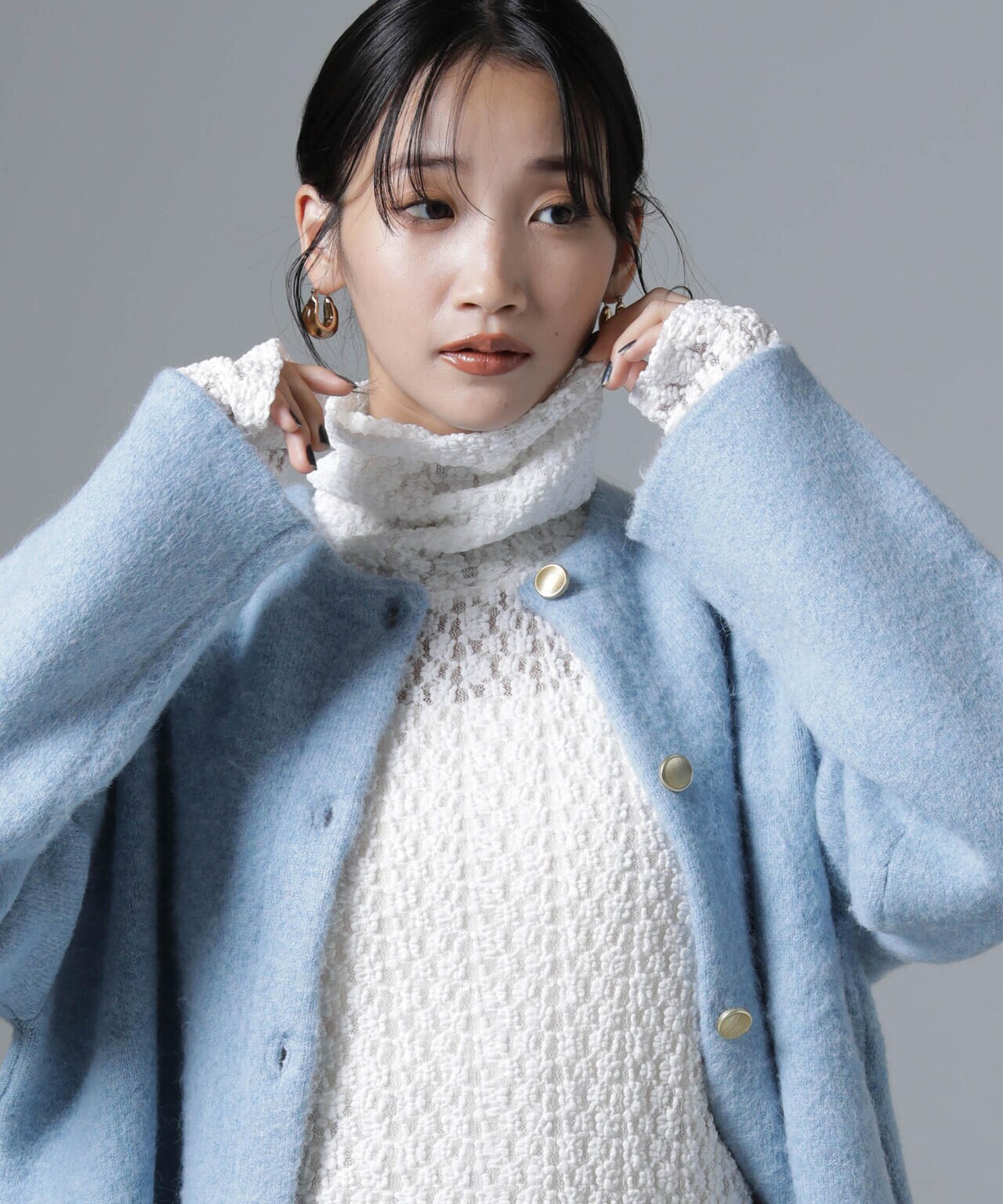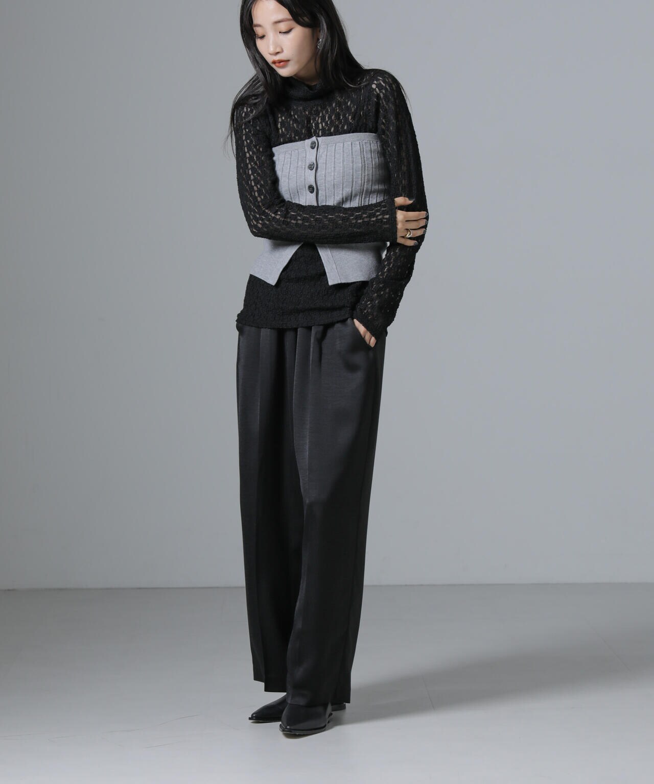 ・ジャケットやキーネックプルオーバーのインナーにあわせてONスタイルも◎