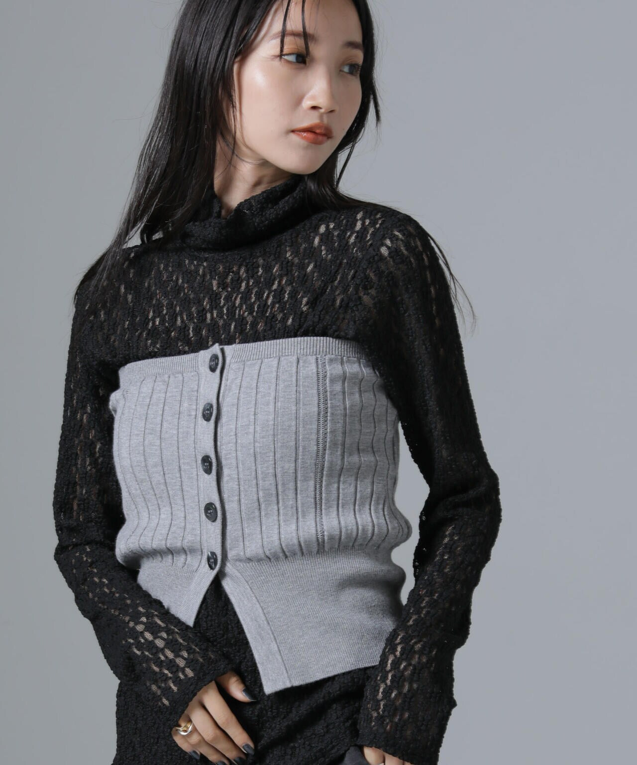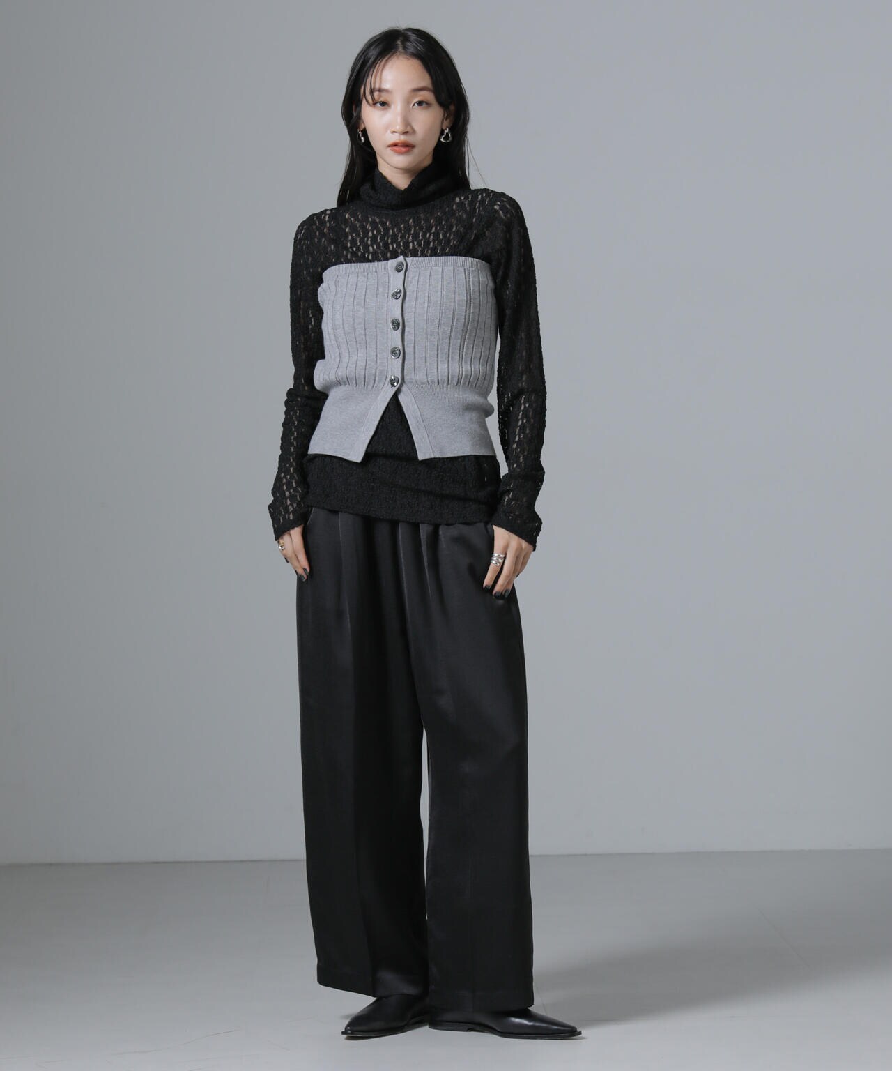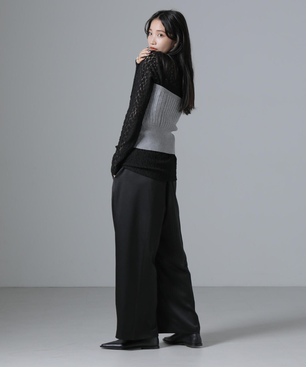 ・ジャケットやキーネックプルオーバーのインナーにあわせてONスタイルも◎