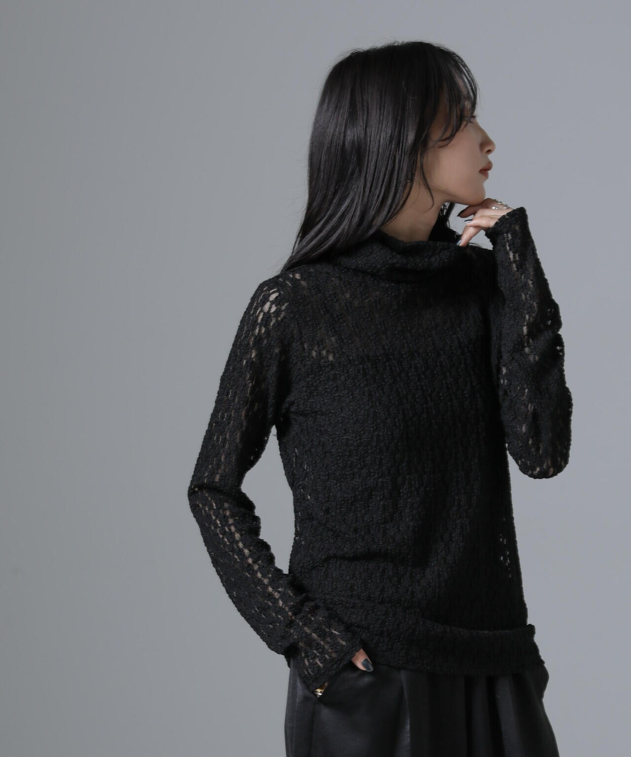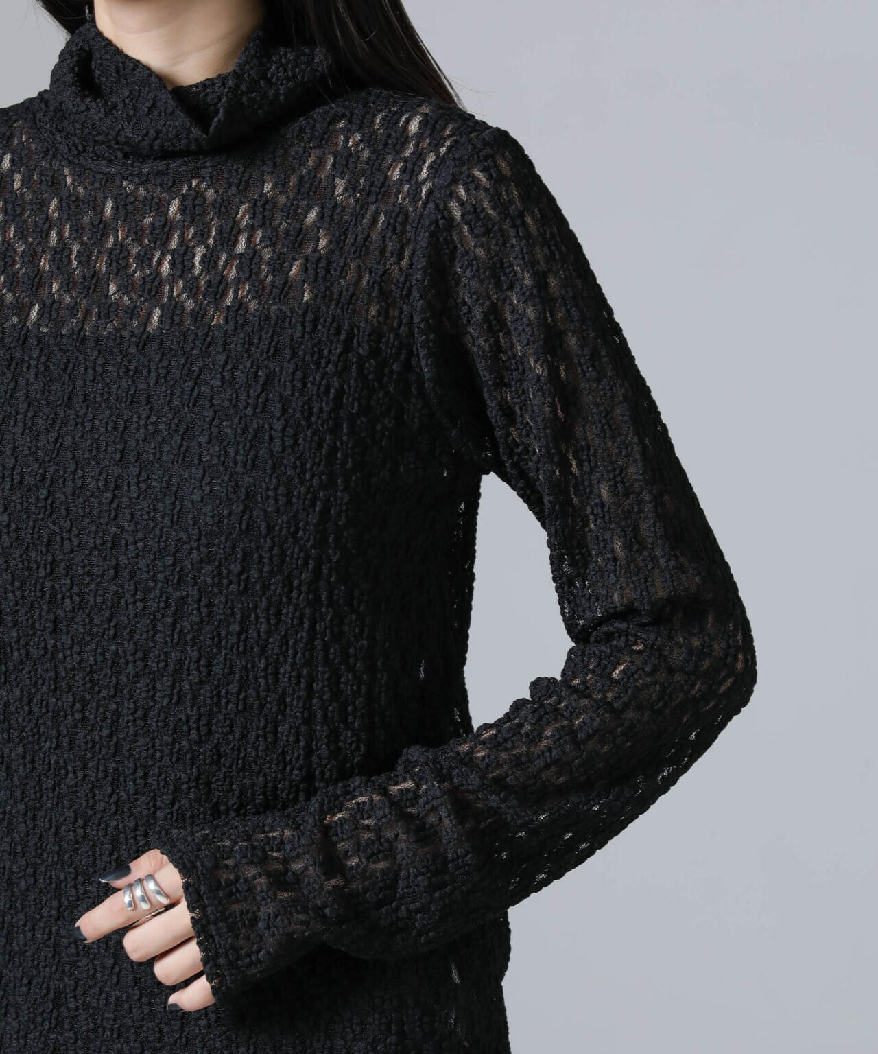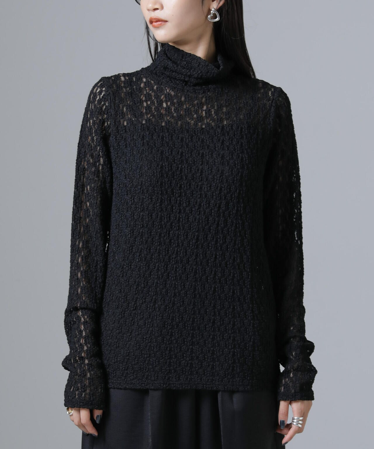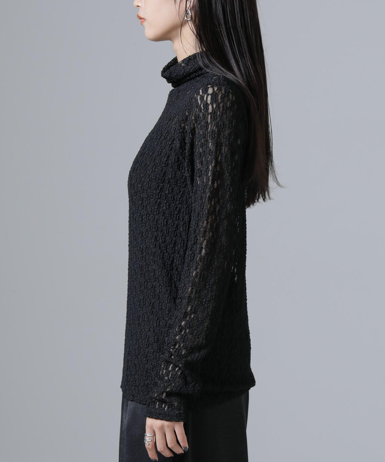 ・起毛した花柄レース素材が華やかな印象のタートルカットソー