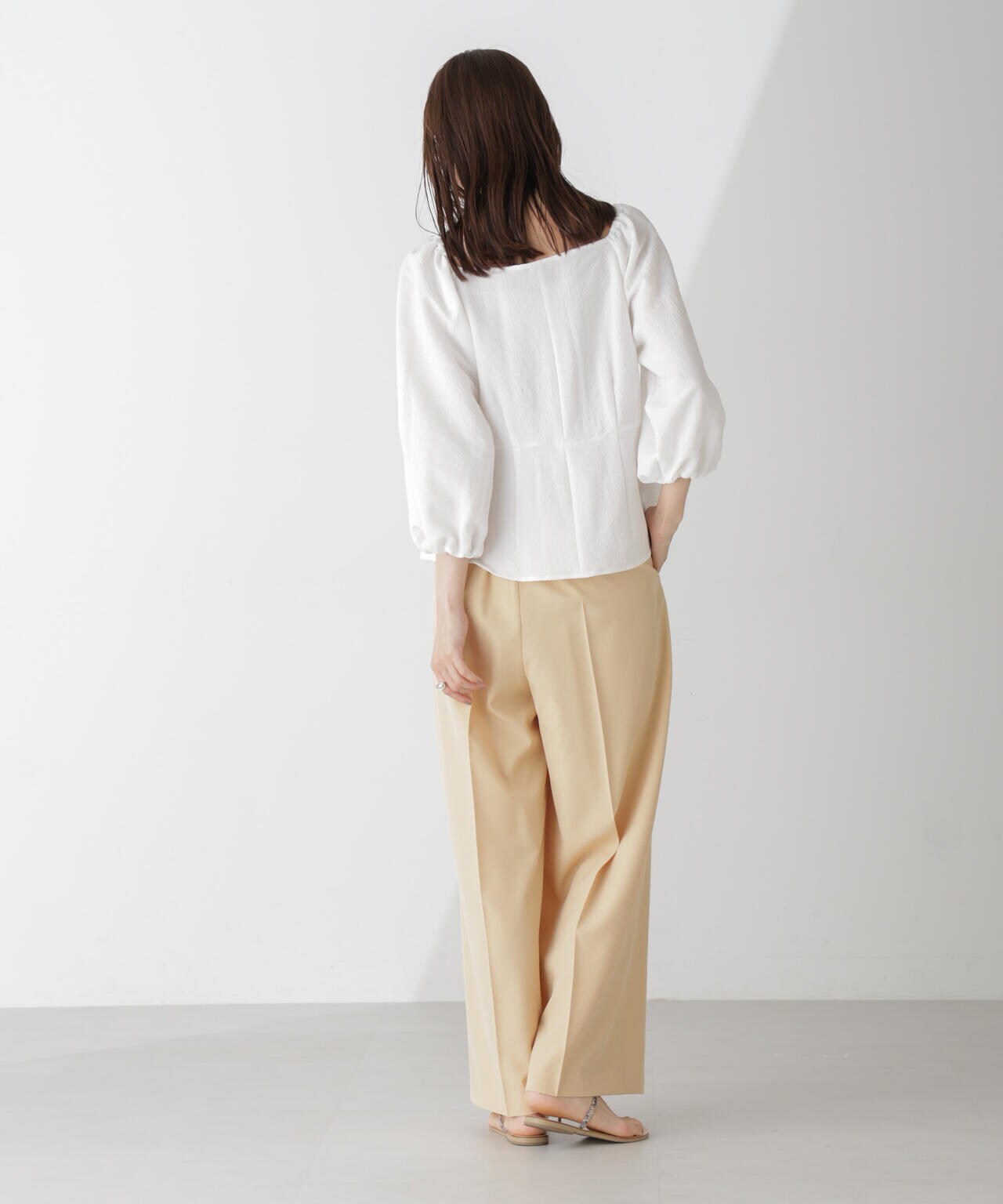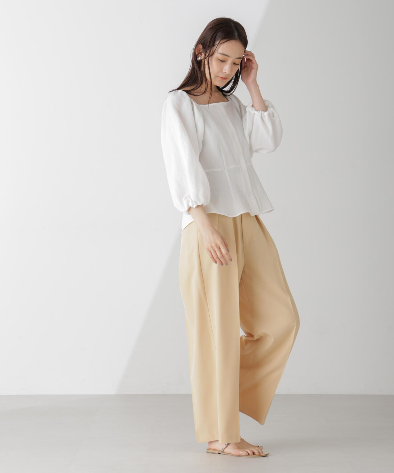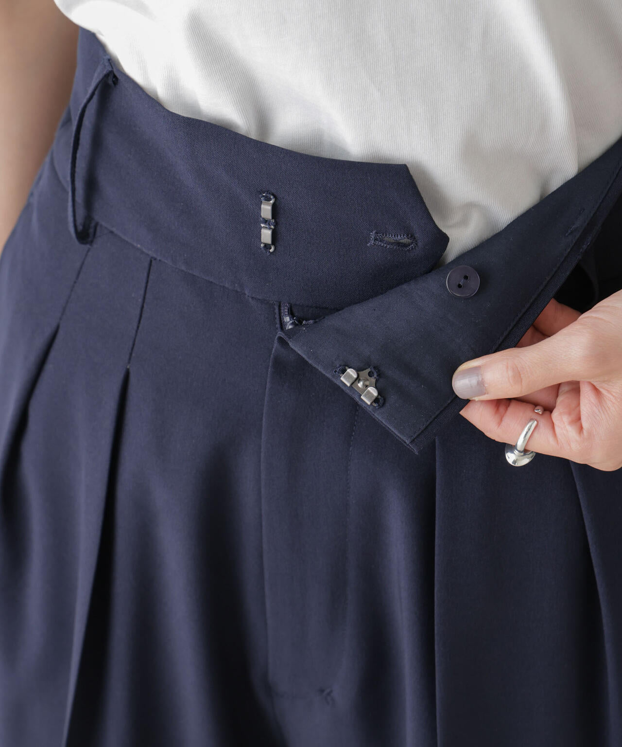 太めのウエストベルトに2タックを効かせたマニッシュなワイドパンツ。腰周りやヒップラインのフィット感と美しいシルエットに拘り、美脚ラインを実現させました。同素材のブラウスとのコーデはもちろん、単品でも合わせやすく定番アイテムとしておすすめしたい1本です。