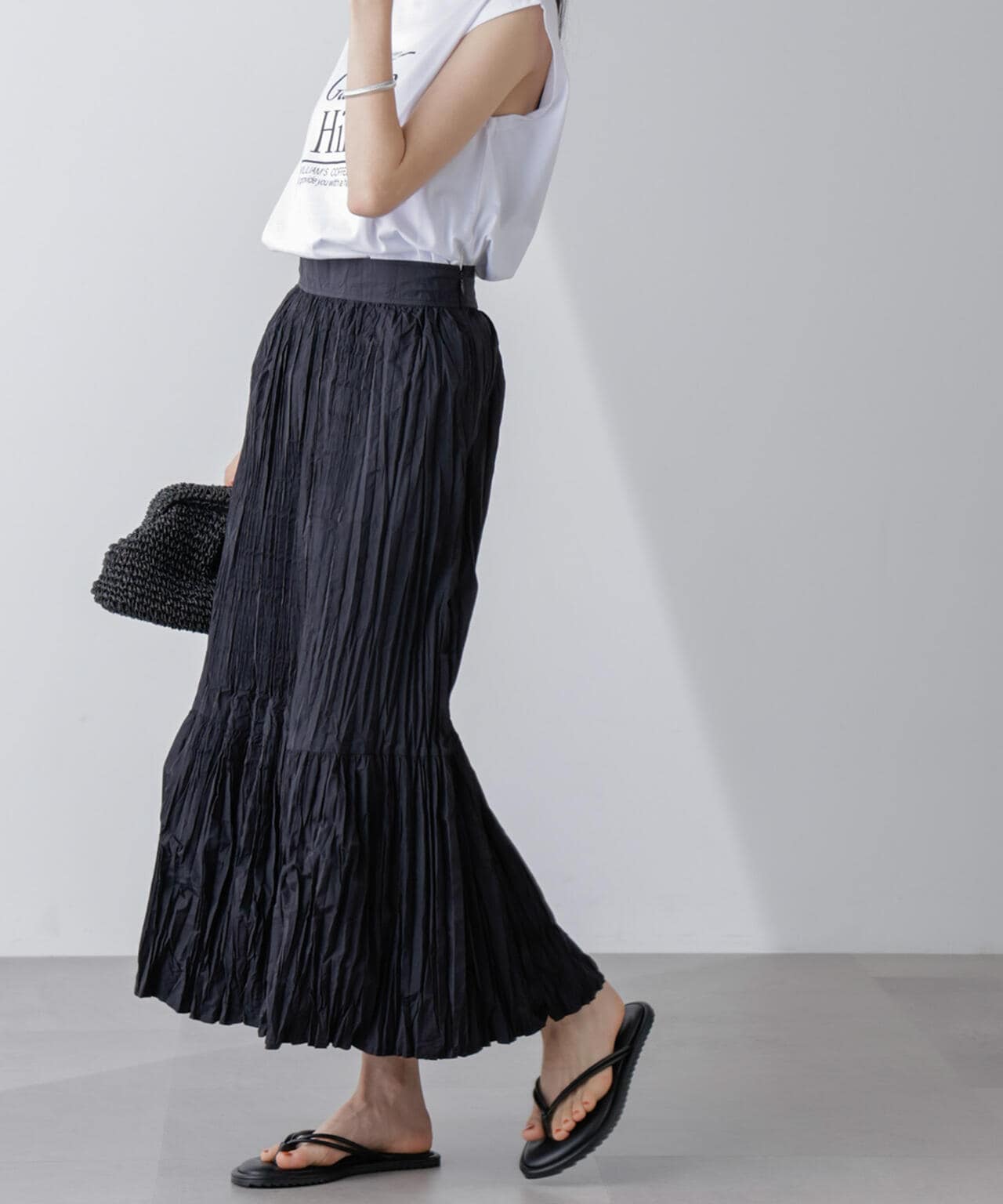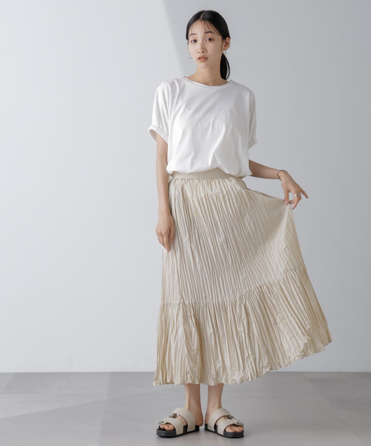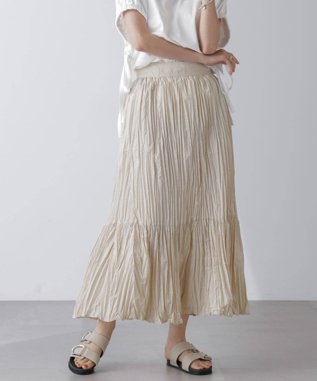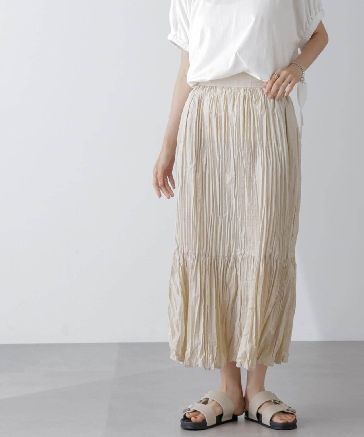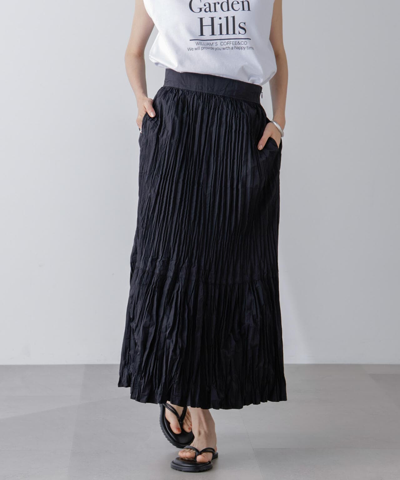 歩くたびにフワッとした動きが楽しめるーワッシャープリーツスカート。リラクシーなウエストゴム仕様で、ワッシャー加工を施しているのでシワが気にならないのも魅力的。大人カジュアルな着こなしや、キレイめなトップスなどでオンスタイルに着こなしもおススメです◎。