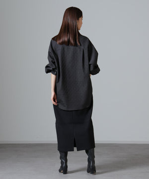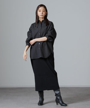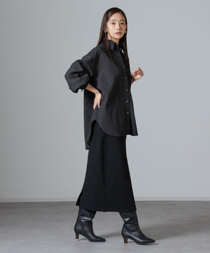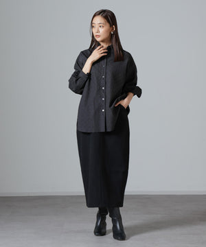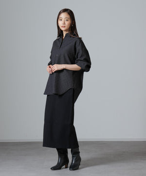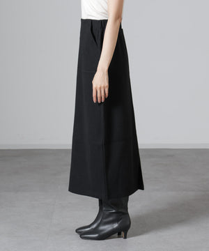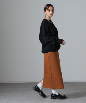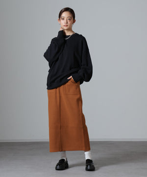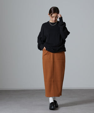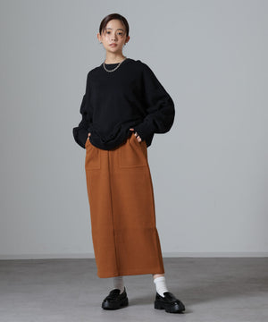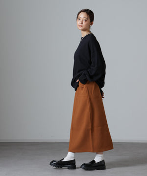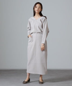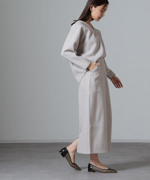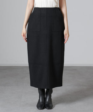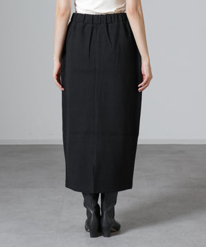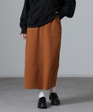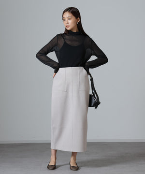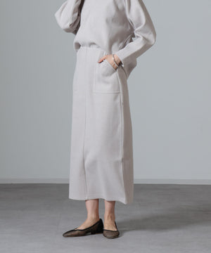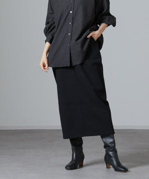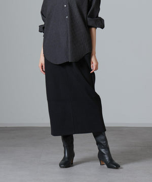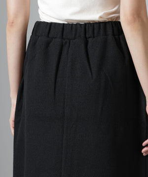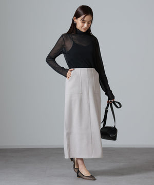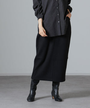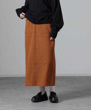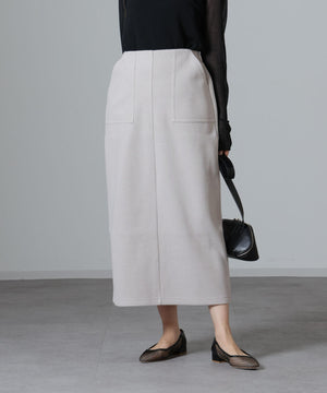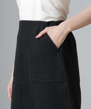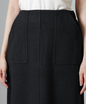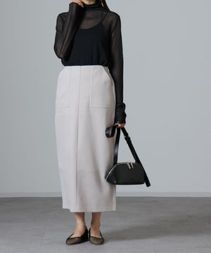 布帛とニットの中間のような素材感で仕立てたIラインスカート。ニットのような暖かみのあるニードルパンチ不織布を使用し、さりげないシーズンムードを取り入れたスタイルが完成します。