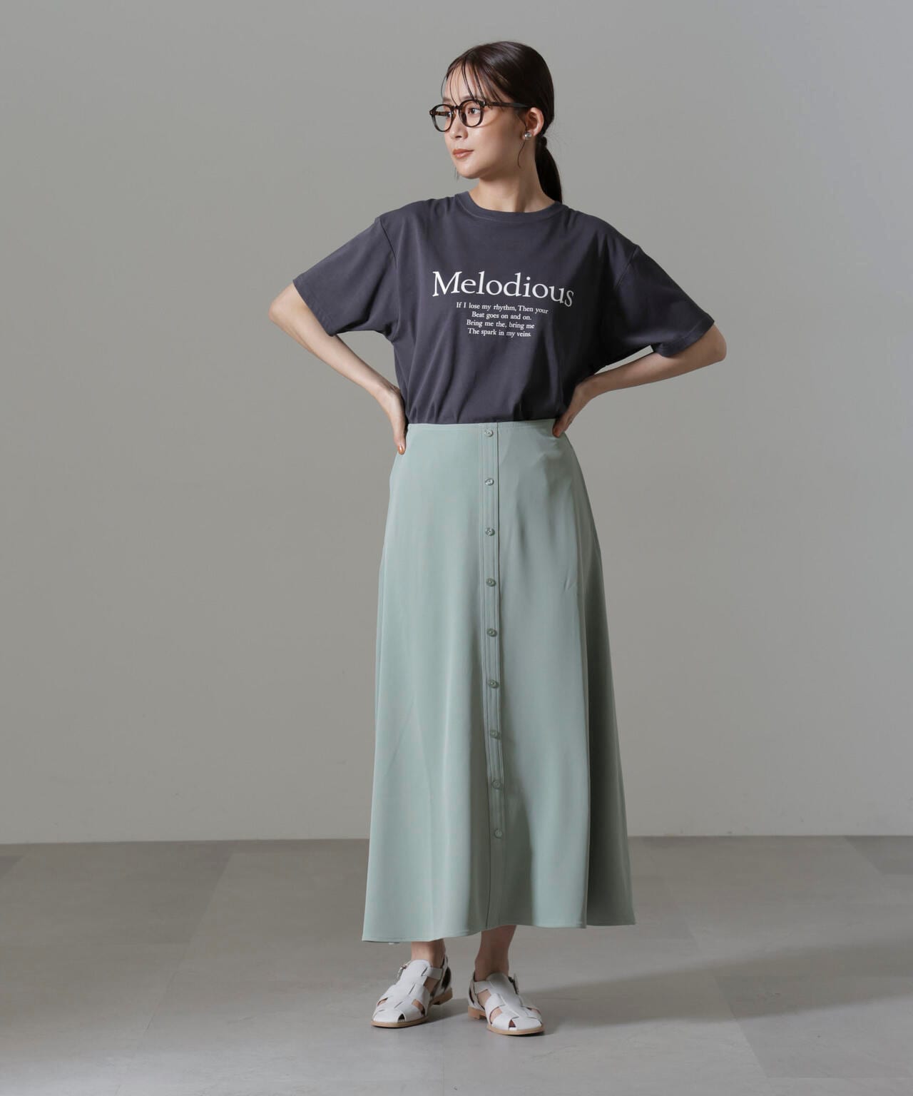 フロントの飾りボタンがアクセントを効かせるフレアスカート。ウエストからヒップにかけてスッキリとしたシルエットに、ボタンディティールが縦のラインを強調し、スタイルアップに貢献。シンプルなカットソーやリブニットと合わせり、同素材のブラウスと合わせたセットアップの着こなしもおすすめです。