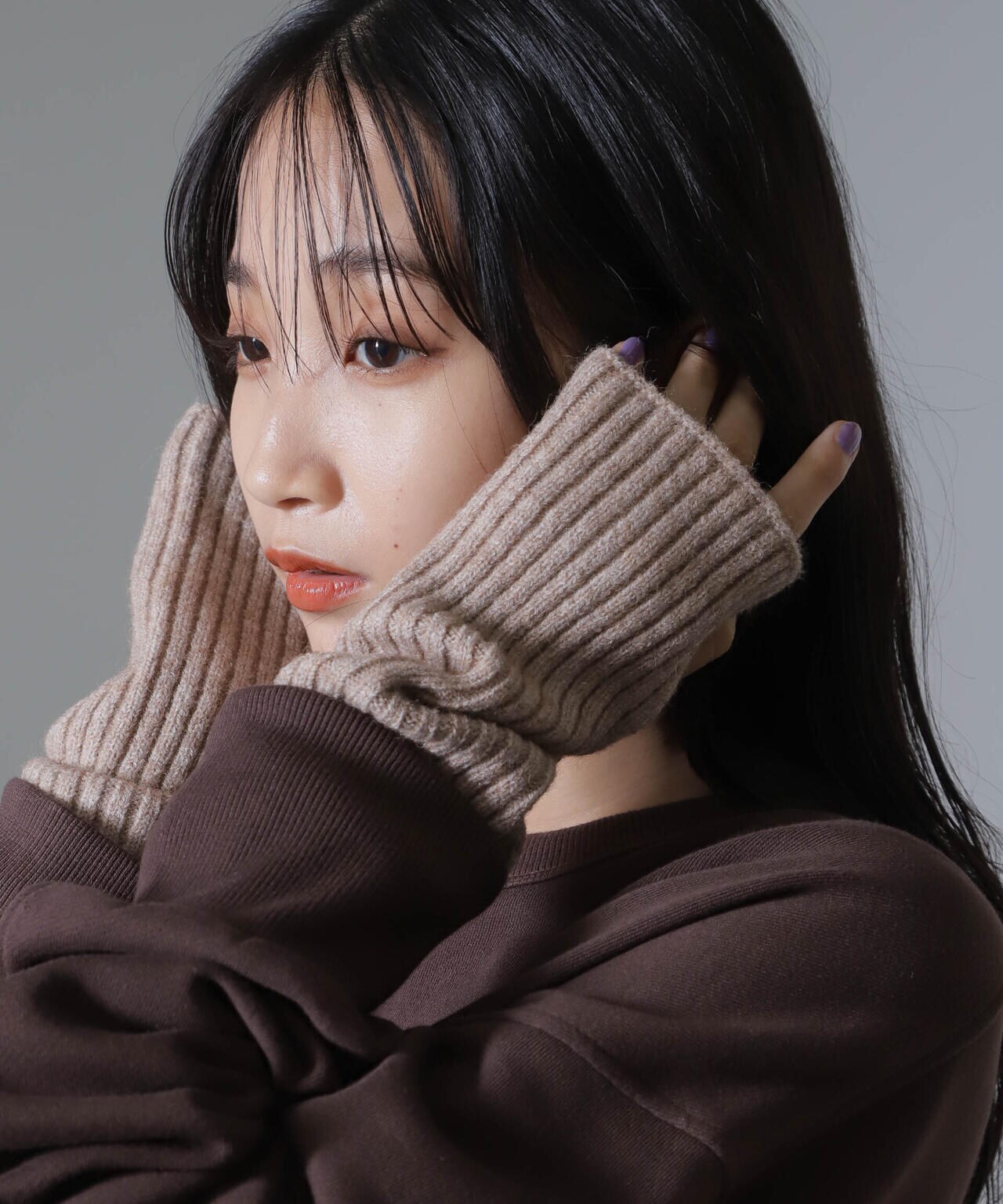 シンプルで使い勝手のよいニットアームウォーマー。防寒はもちろん、指先が出るのでスマホ操作もできる優秀アイテム。シンプルなので合わせるスタイルを選ばず、コートの袖から覗かせると良いアクセントに◎。同素材のニットやバラクラバとセットでのスタイルもおすすめです。