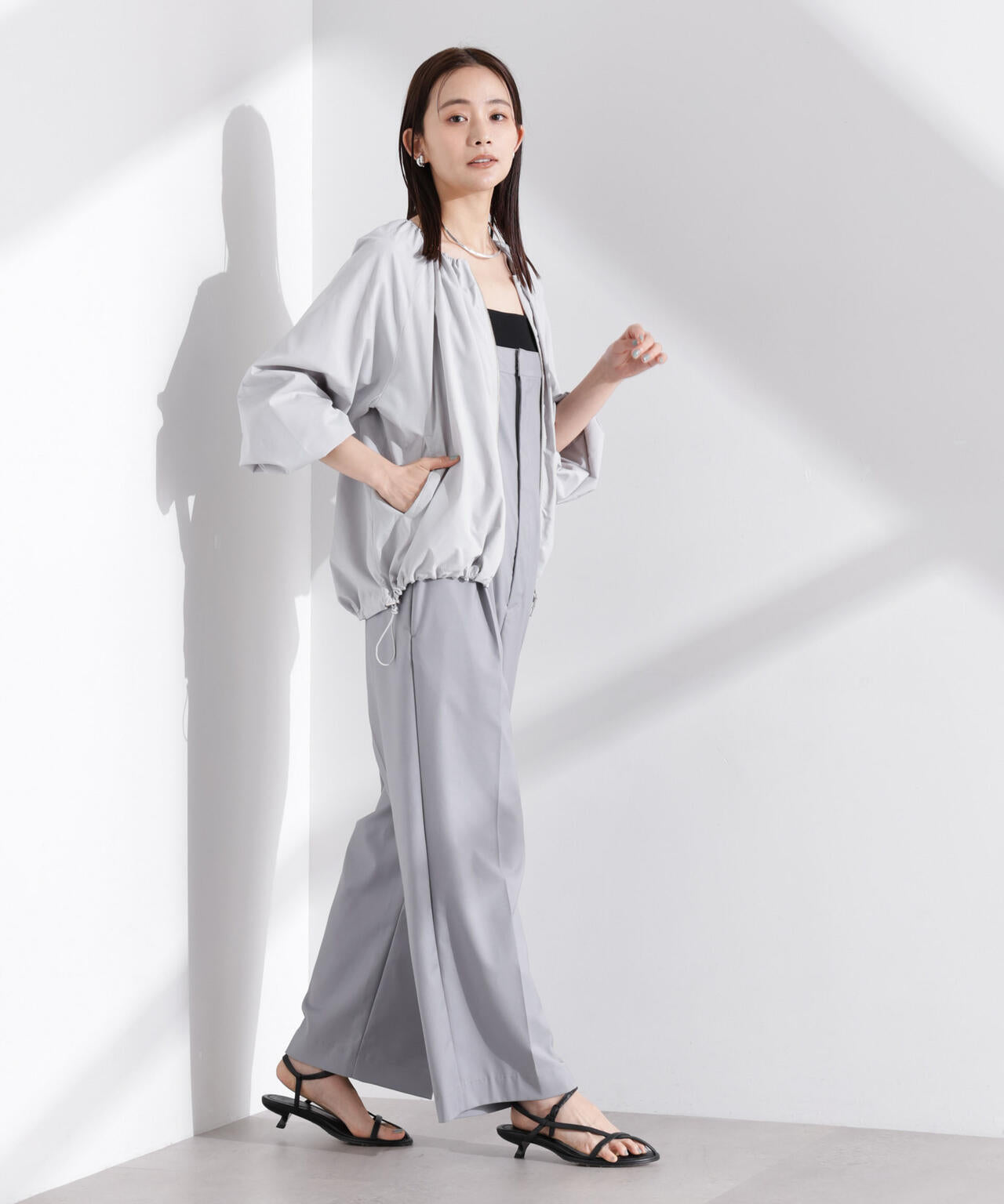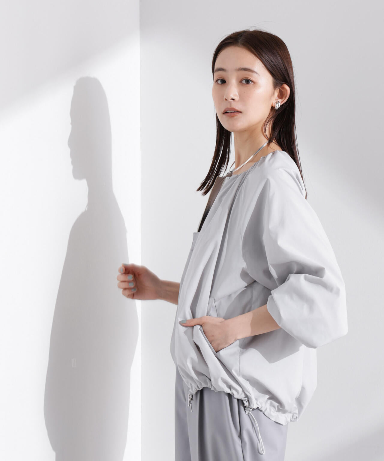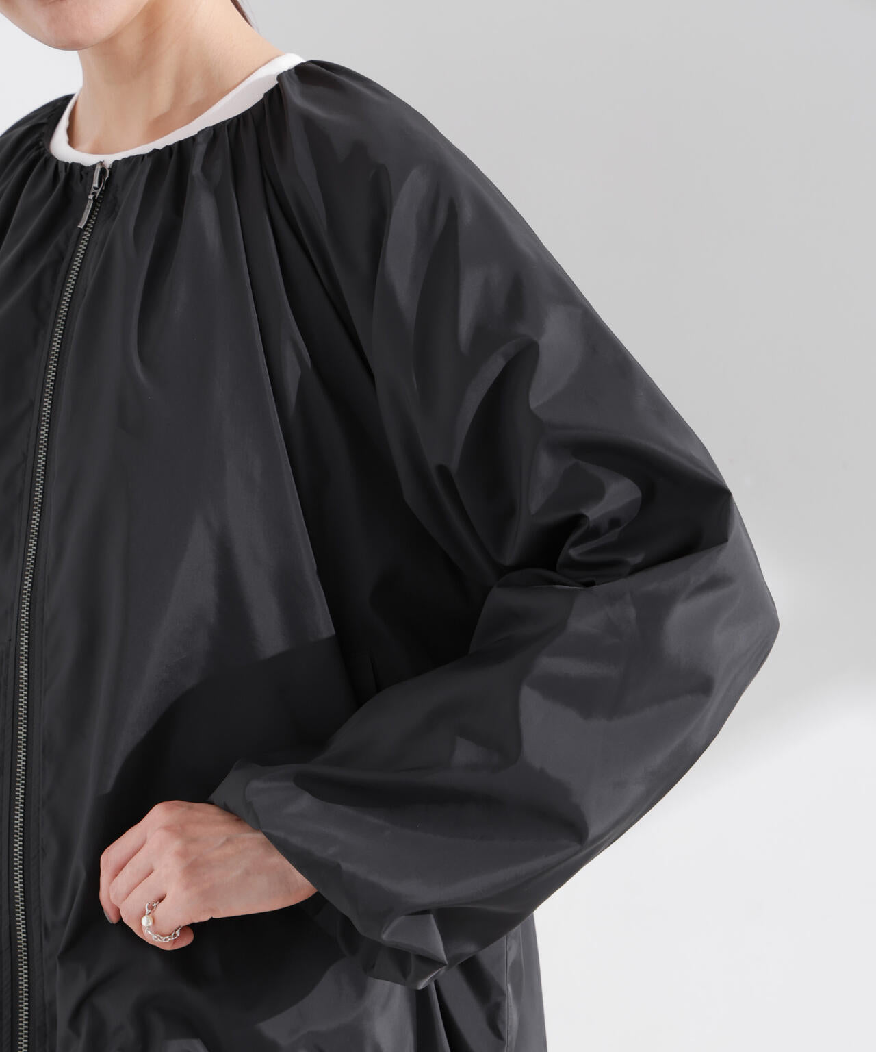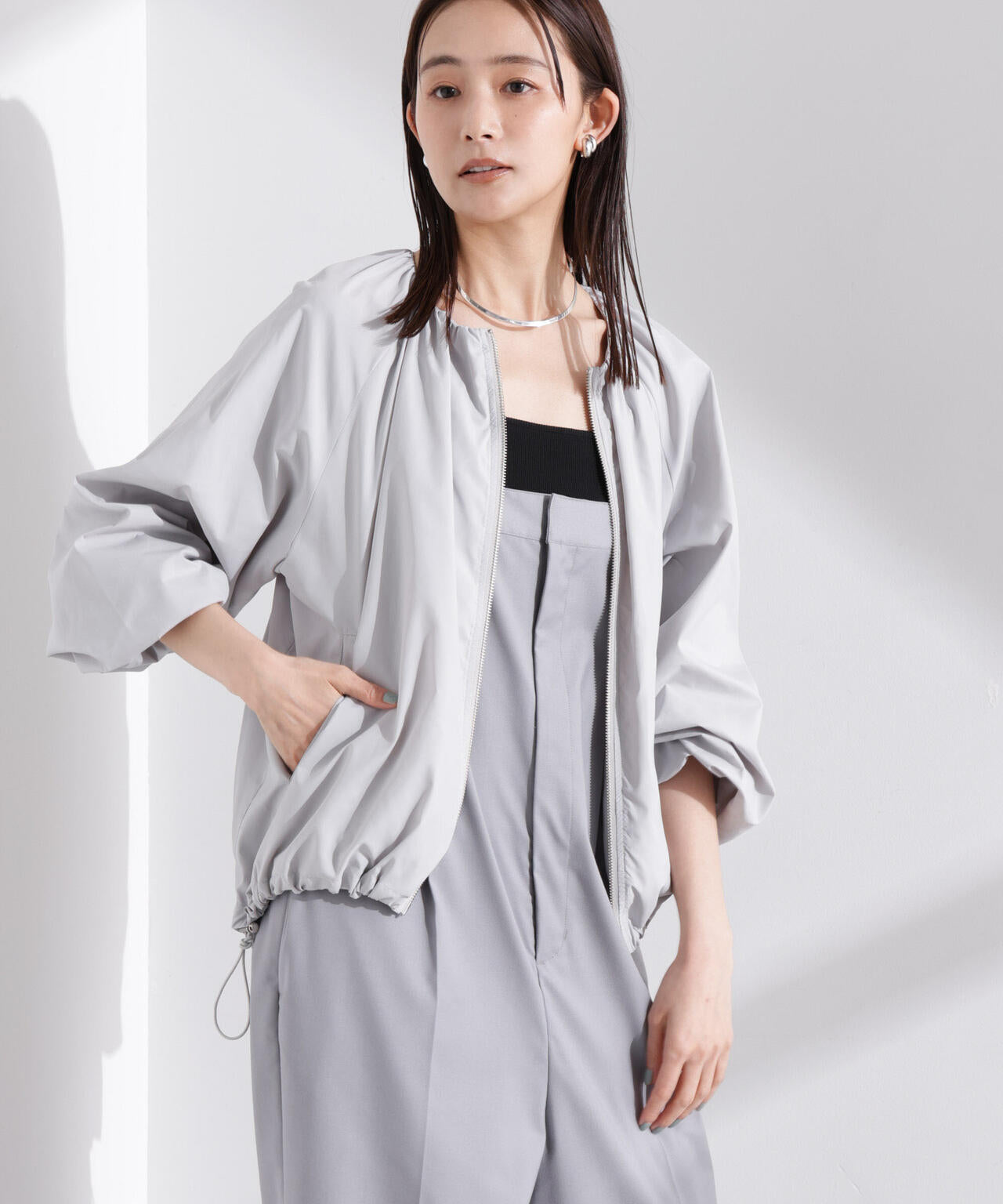 衿周りや袖に程よくギャザーが入った、リラックスシルエットのジップブルゾン。控え目な光沢のある素材がカジュアルさを抑えてくれているので、羽織るだけで大人の抜け感を演出してくれます。