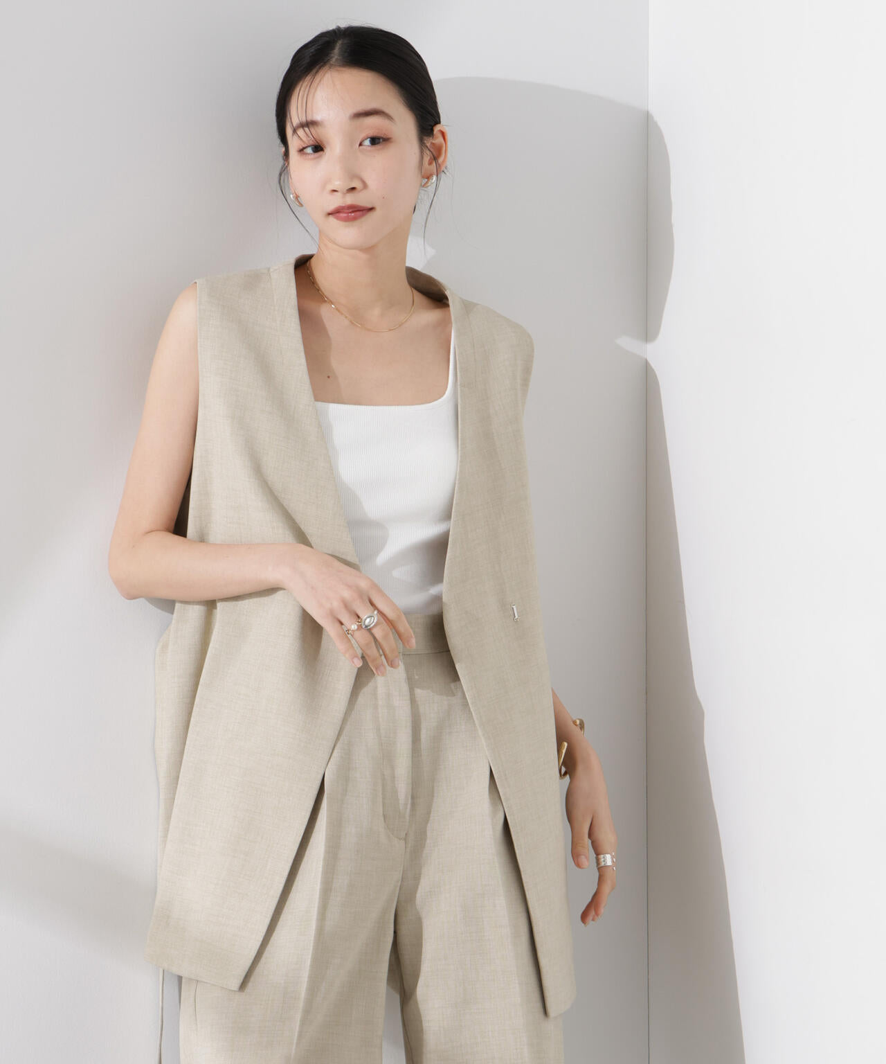 リネン見えする涼やかな素材で仕立てた上品なジレ。前を閉めてベルトでウエストマークしたり、開けてベルトを外したり、様々な着こなしを楽しめるアイテム。防シワ、UVカット、接触冷感、吸水速乾の多機能性を備えているので、快適な着心地でスイッチシーズンに重宝しそう。
