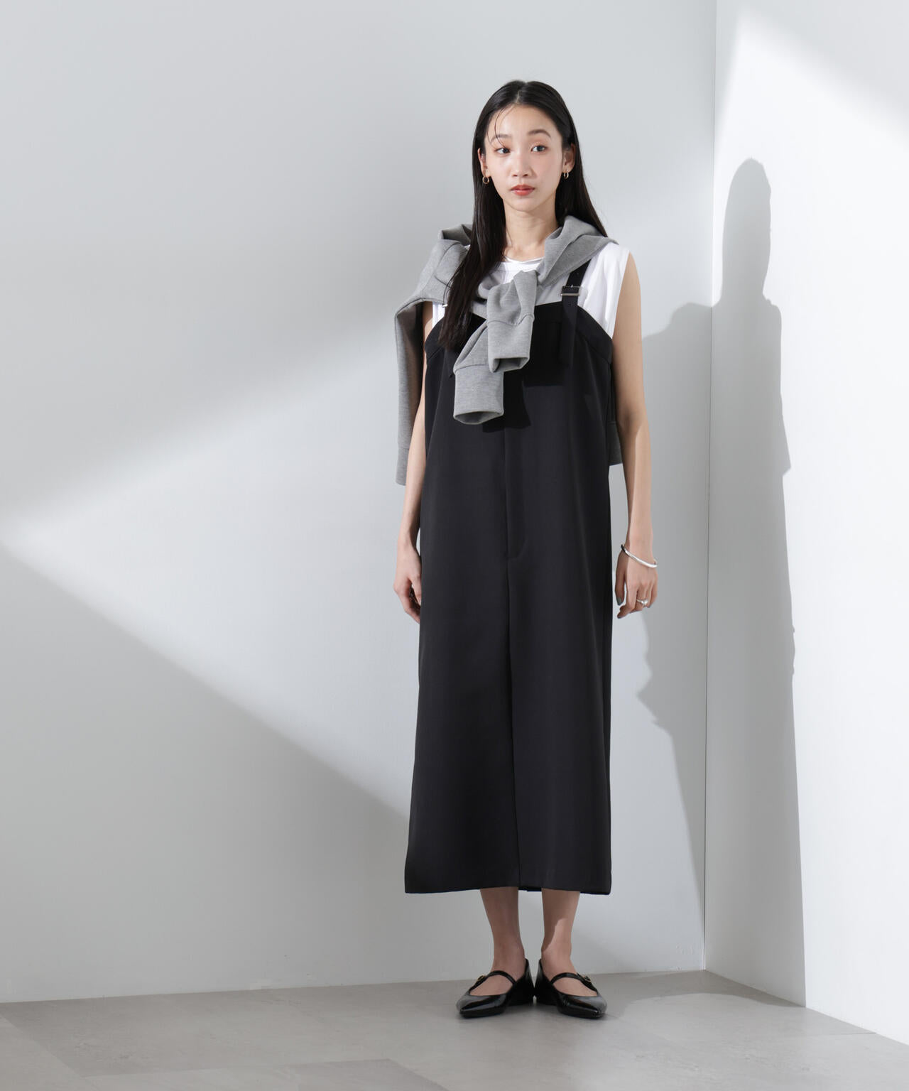 ベルト切り替えデザインが目を惹くストラップワンピース。インナー次第で印象が変わるので、シーズンレスで取り入れられるアイテム。上端ベルト切り替えで前あきを作りパンツ風のルックスに仕上げた一着です。