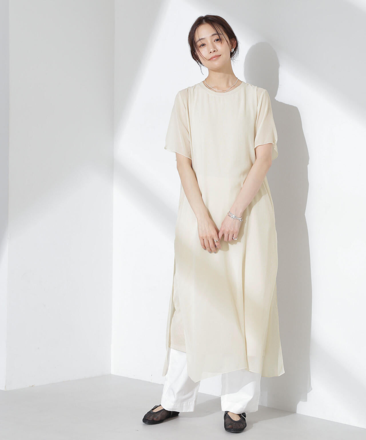 シーズンライクなレイヤードが様になる異素材コンビのワンピース。表側には落ち感が上品なシアー素材、インナーには柔らかなカットソー素材を採用し、素材のコントラストを楽しめるデザインに仕上げた一枚。パンツやプリーツスカートを裾からチラッと覗かせたり、上にジャケットやオーバーサイズの羽織りを合わせるコーディネートもオススメです。