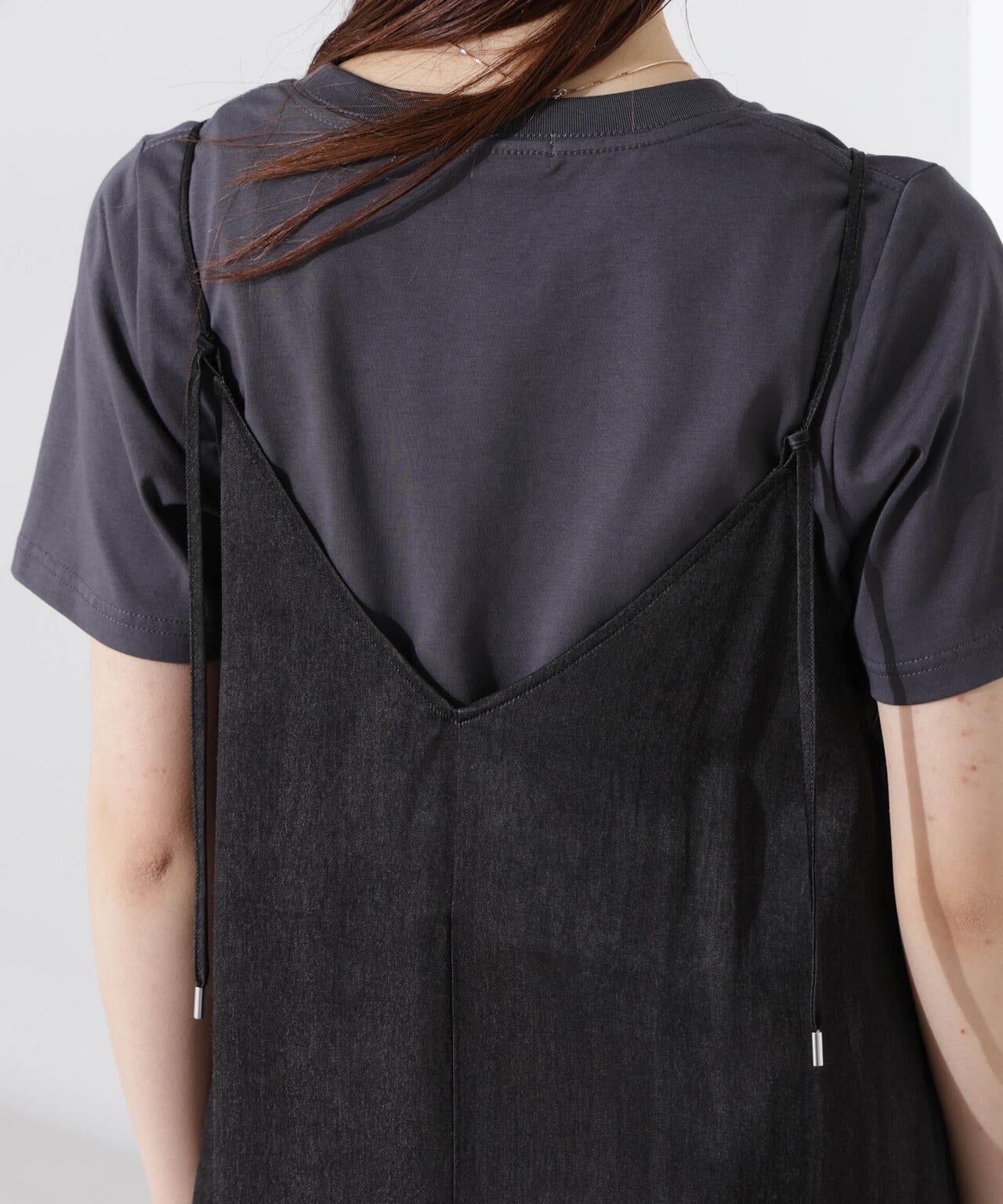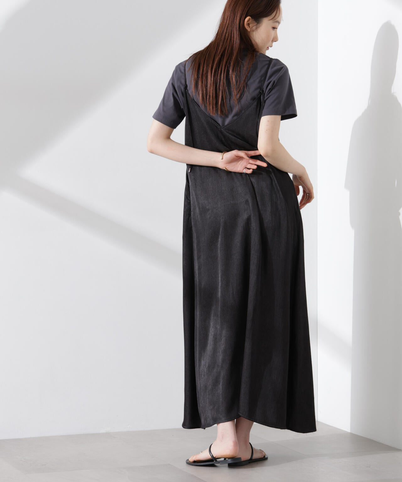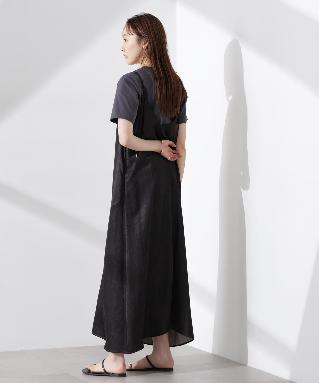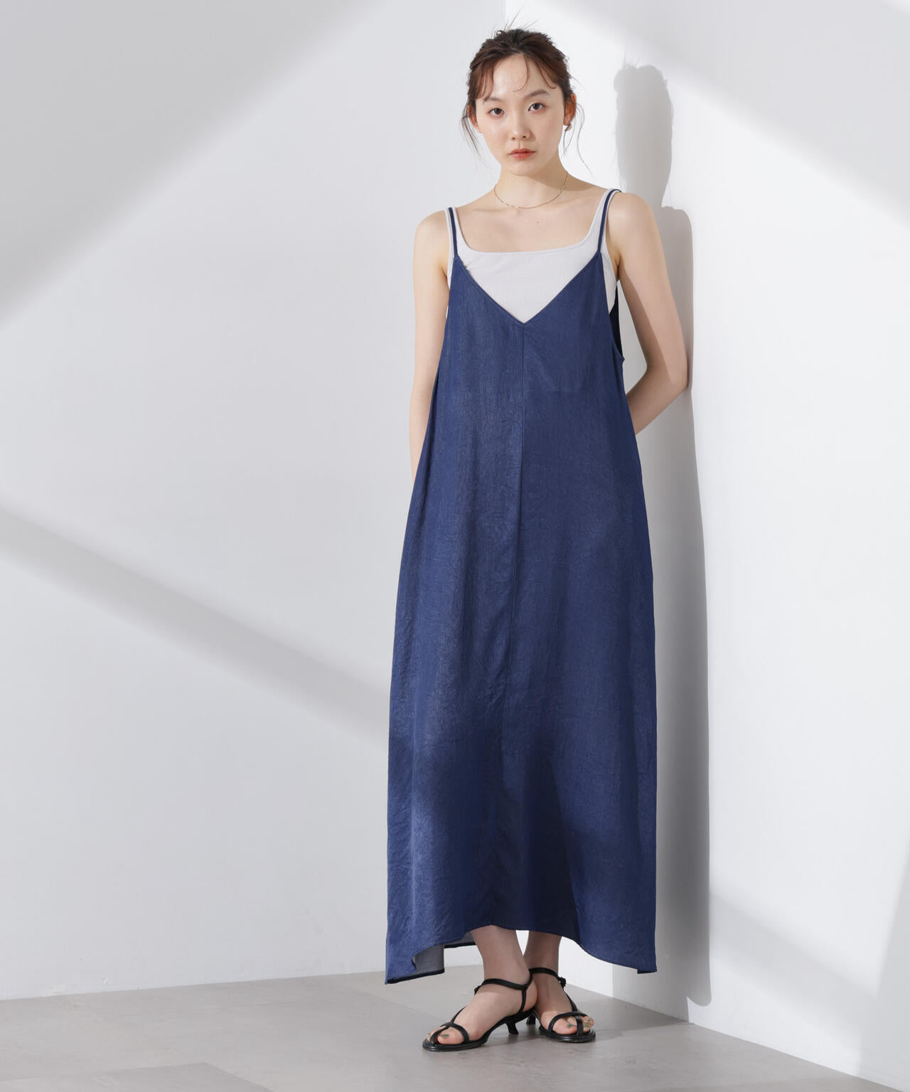 華奢なショルダーストラップと深めのネックラインがフェミニンなキャミワンピ。着回しやすいプレーンなデザインで、カジュアルにもキレイめにも着回しやすい優秀アイテムです。