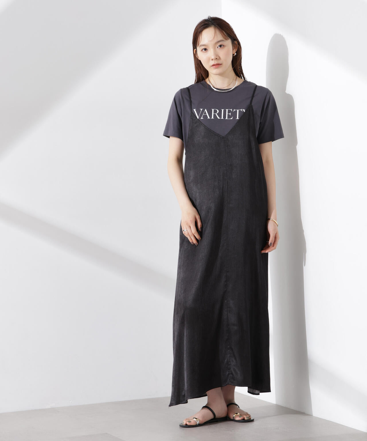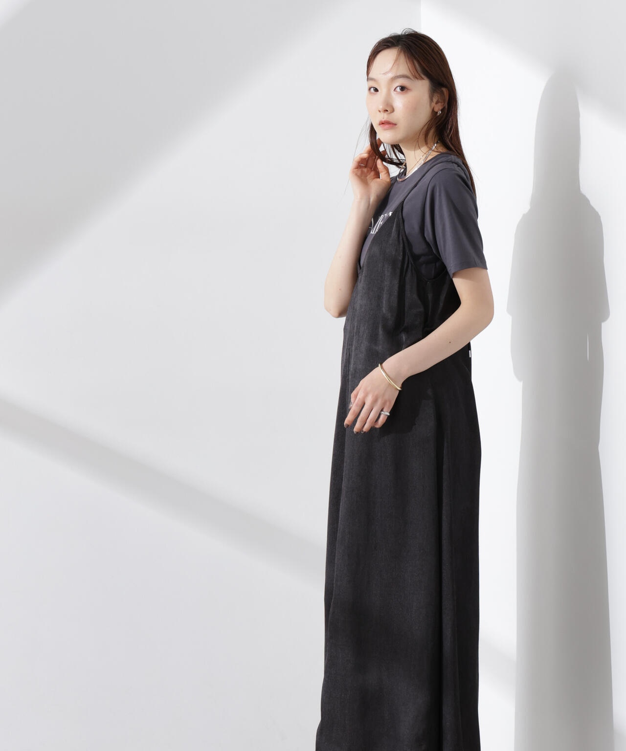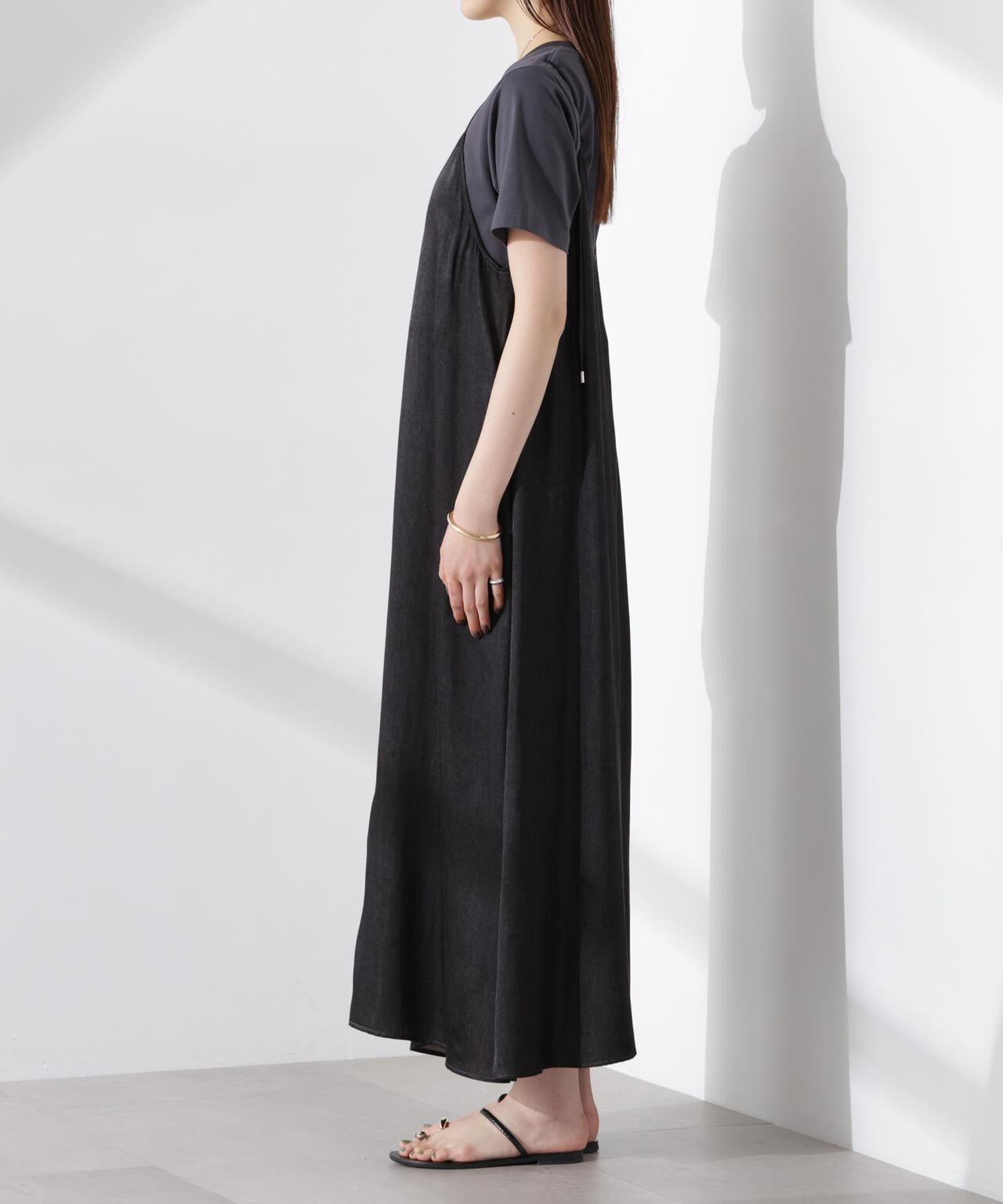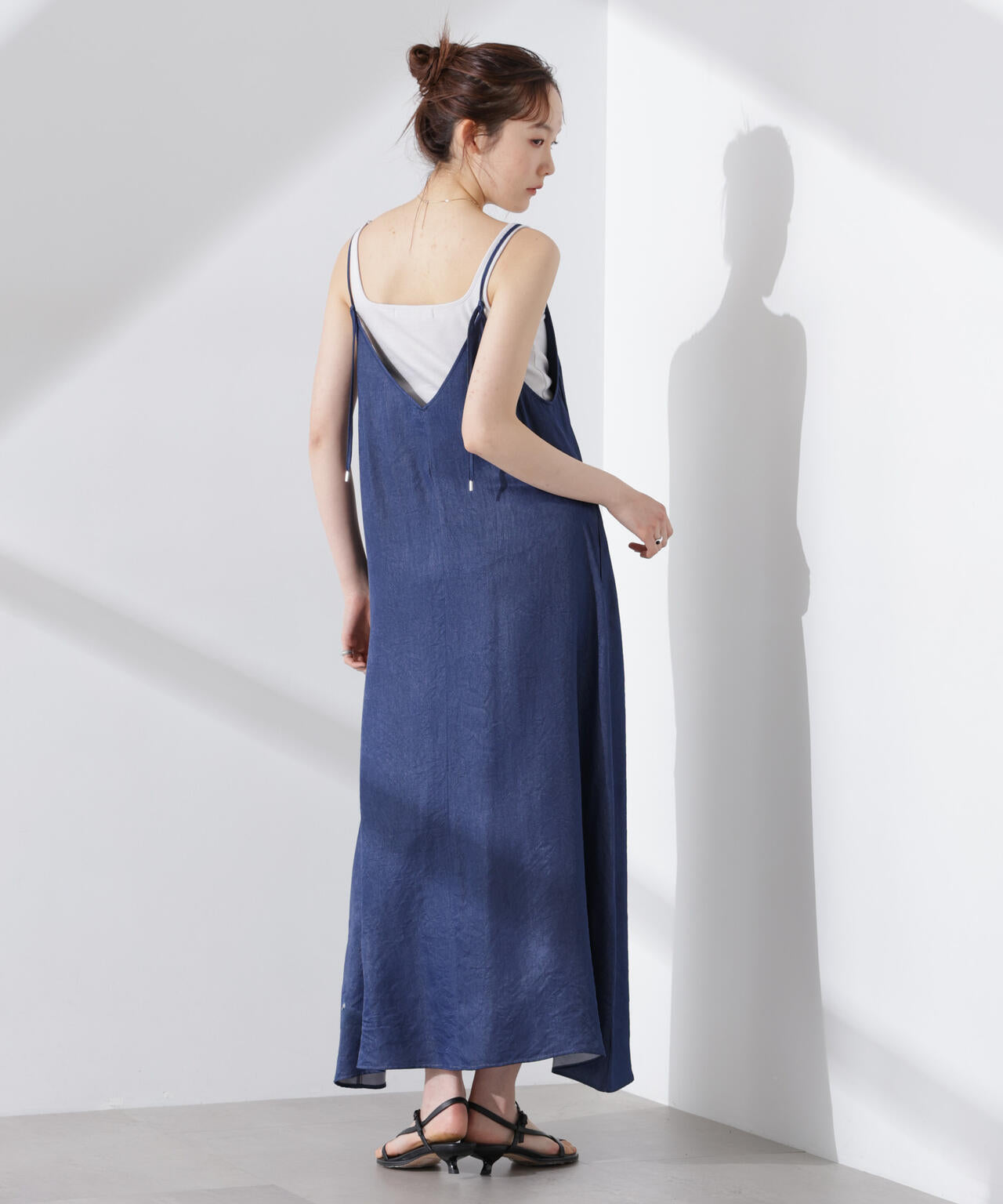 華奢なショルダーストラップと深めのネックラインがフェミニンなキャミワンピ。着回しやすいプレーンなデザインで、カジュアルにもキレイめにも着回しやすい優秀アイテムです。