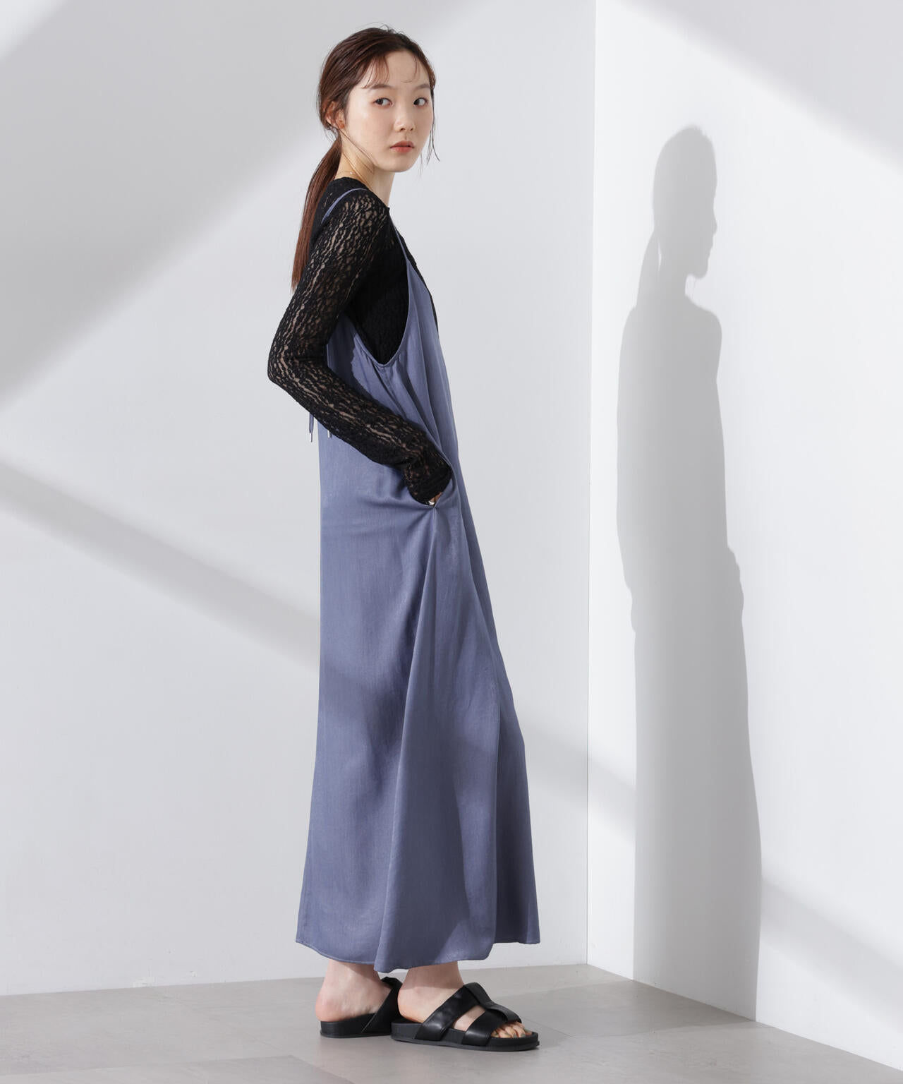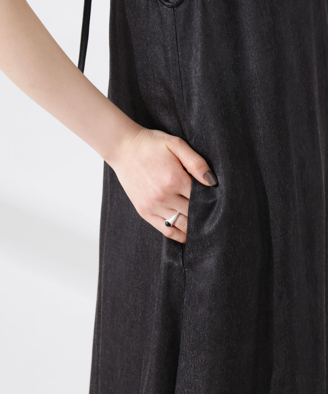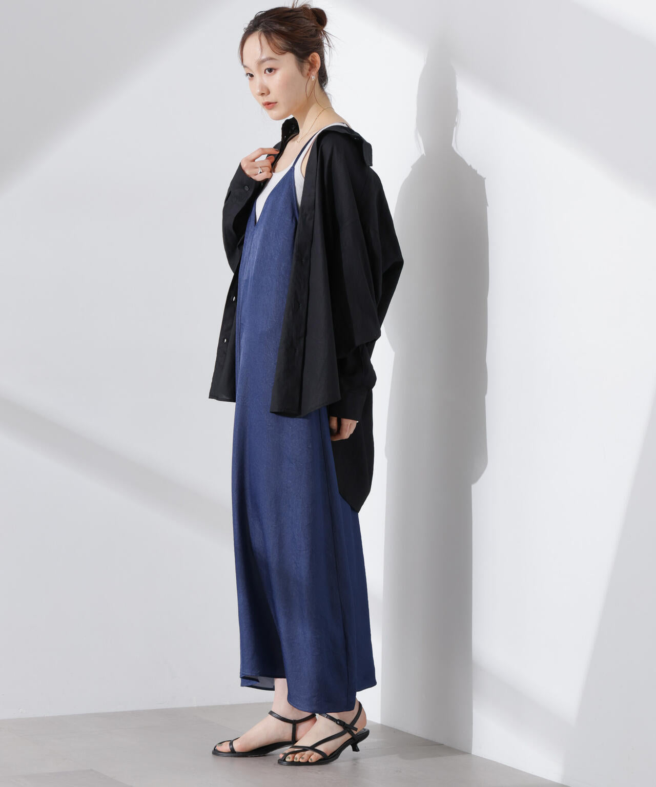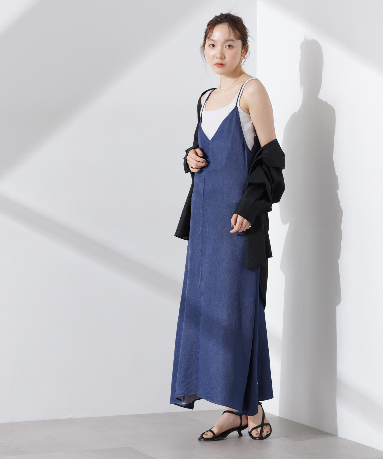 華奢なショルダーストラップと深めのネックラインがフェミニンなキャミワンピ。着回しやすいプレーンなデザインで、カジュアルにもキレイめにも着回しやすい優秀アイテムです。
