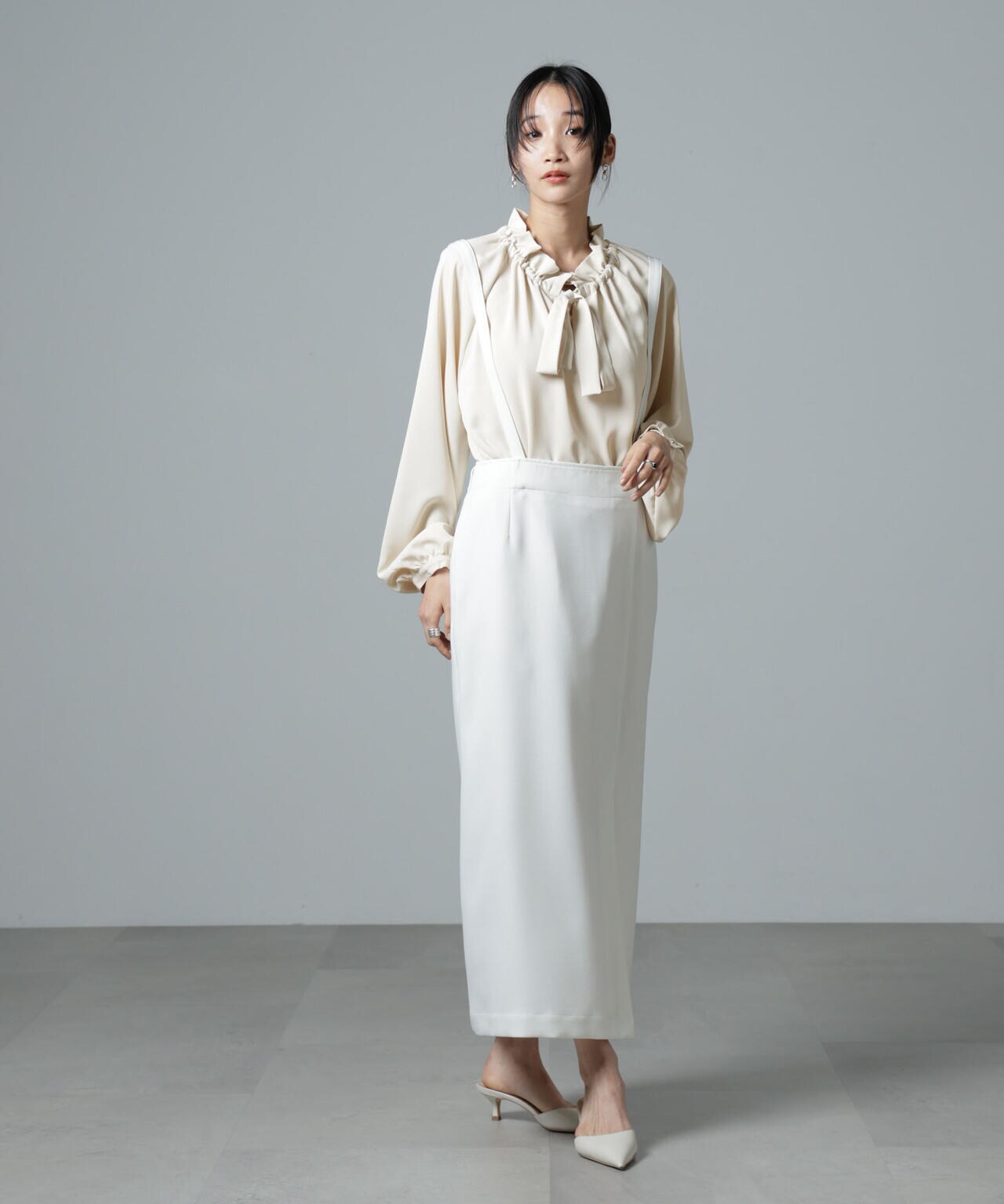フリルカラーが華やかな印象のボータイブラウス。衿元のリボンを結んだり、衿元を開けて異なる印象で着こなしのアレンジを楽しめるデザイン。上からベストやジャケットなどを重ねてレイヤードコーデや、デニムなどのカジュアルボトムとのスタイリングもおすすめです。