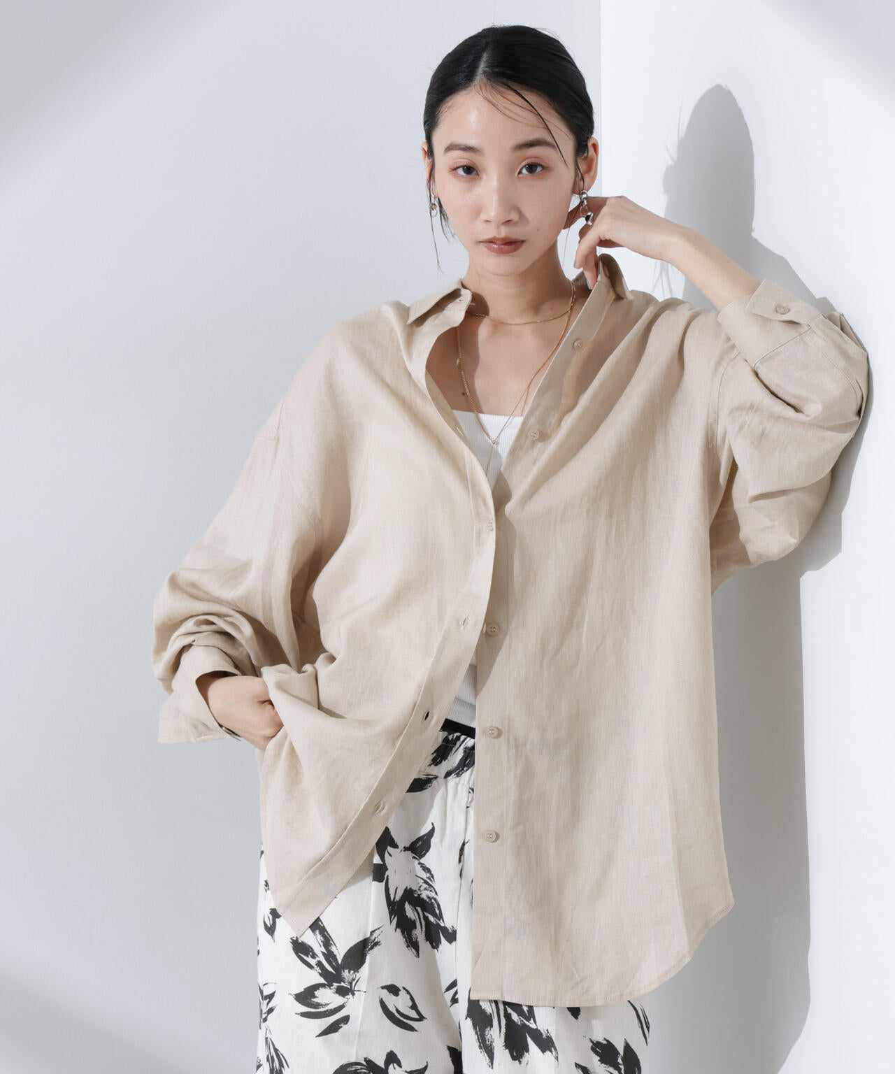 きれいなシルエットのベーシックワイドシャツ。羽織るだけでエレガントさも演出できる、ワードローブに揃えておきたいアイテムです。