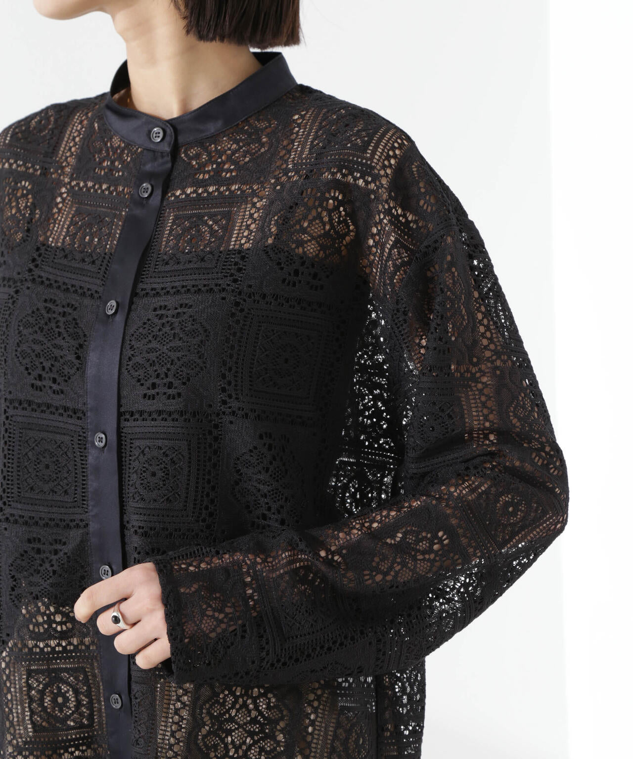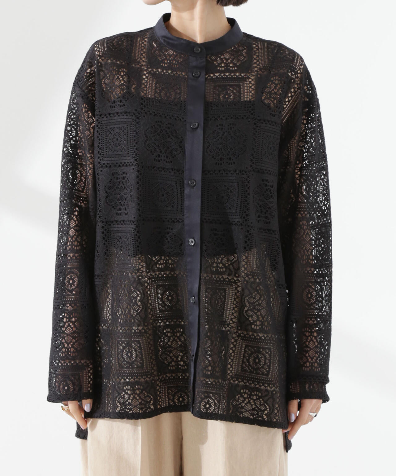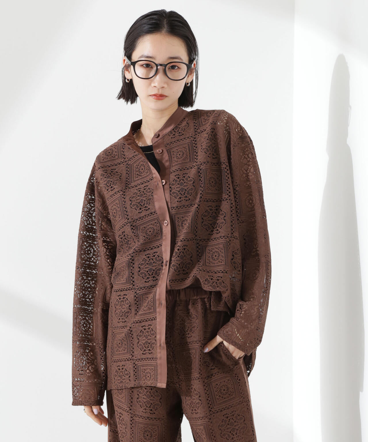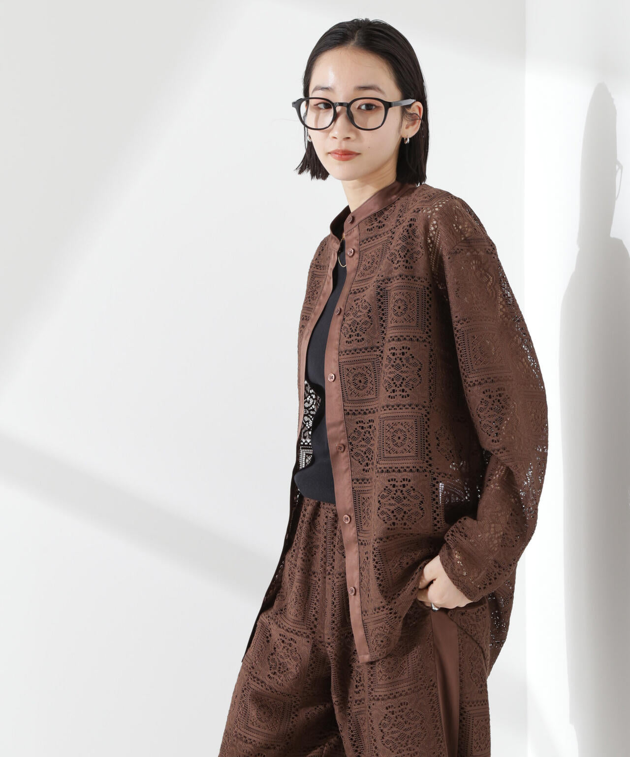 クロシェ編み風のレースデザインで仕立てたバンドカラーシャツ。パッと華やかな印象ながら、甘すぎないレース模様や異素材の前立て等、すっきり着こなせるディティールがポイント。同素材展開のパンツとのセットアップスタイルもおすすめです。