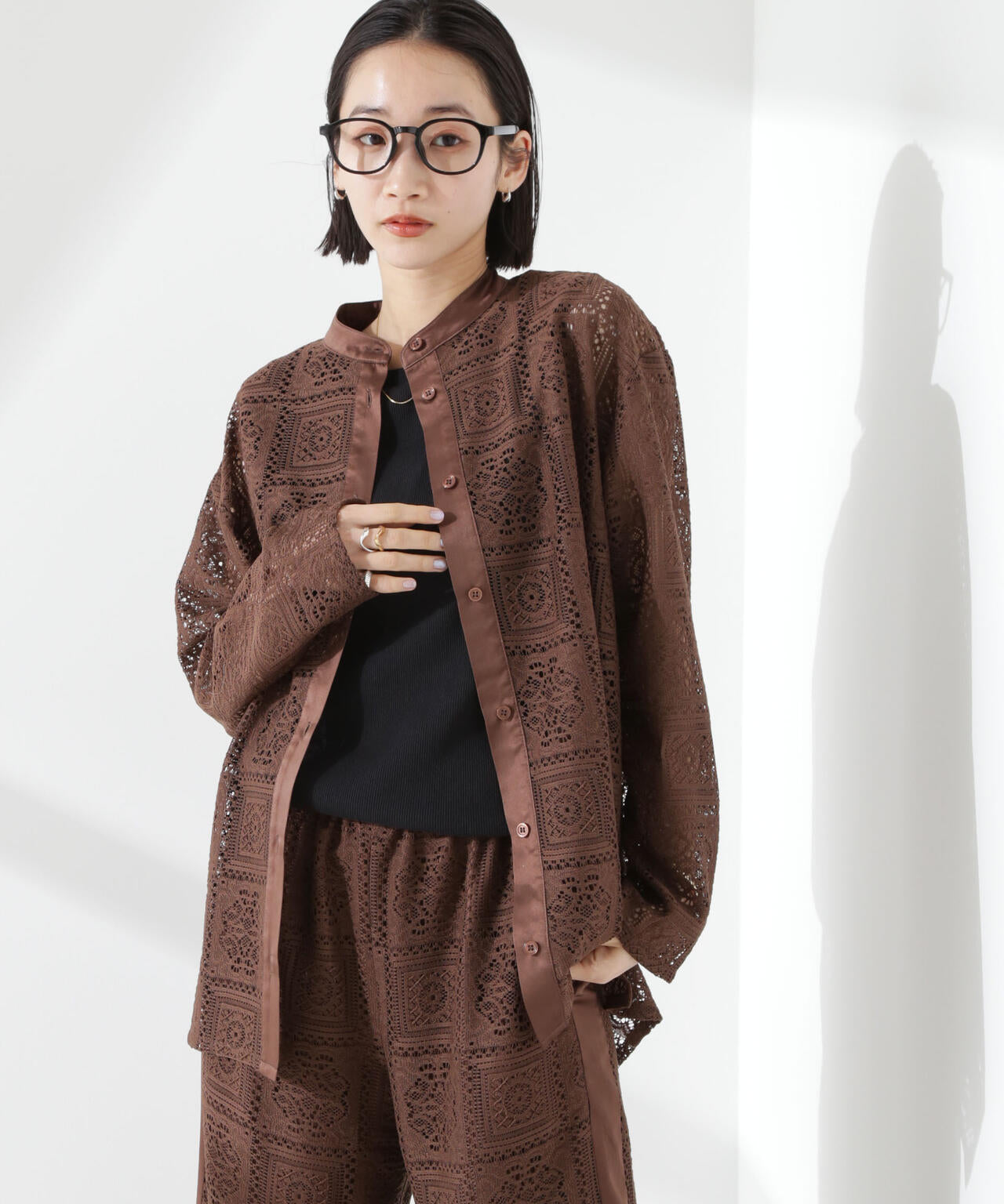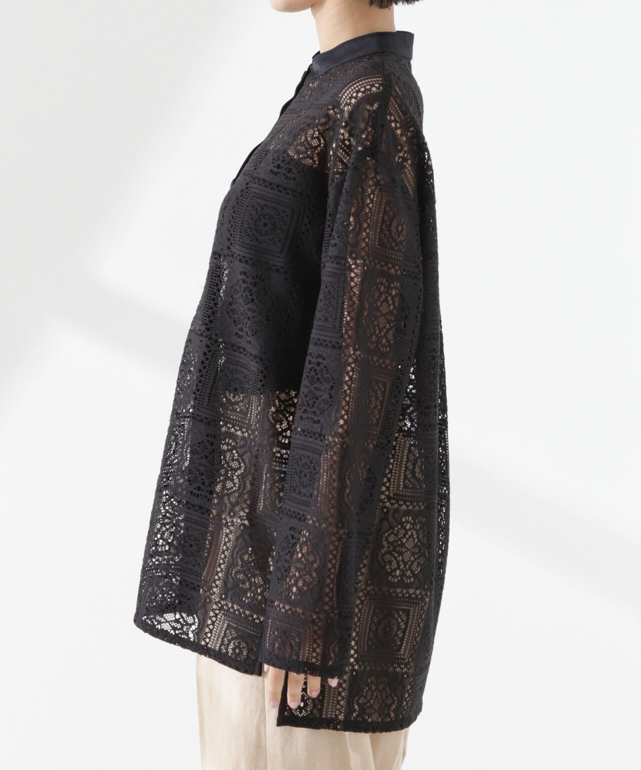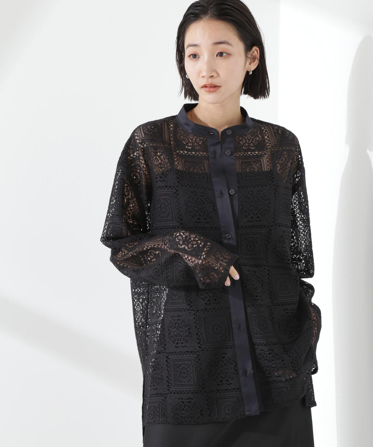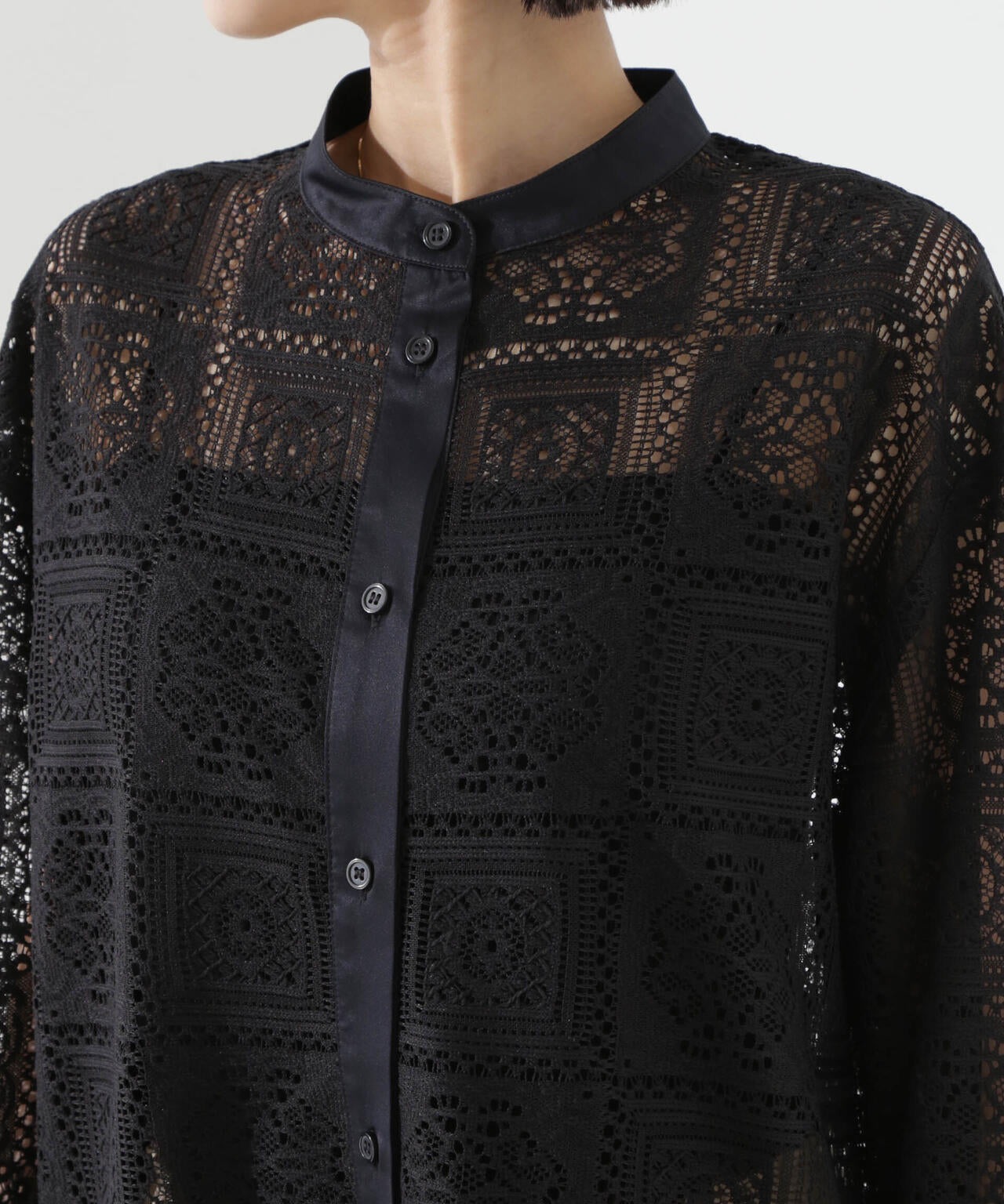 クロシェ編み風のレースデザインで仕立てたバンドカラーシャツ。パッと華やかな印象ながら、甘すぎないレース模様や異素材の前立て等、すっきり着こなせるディティールがポイント。同素材展開のパンツとのセットアップスタイルもおすすめです。