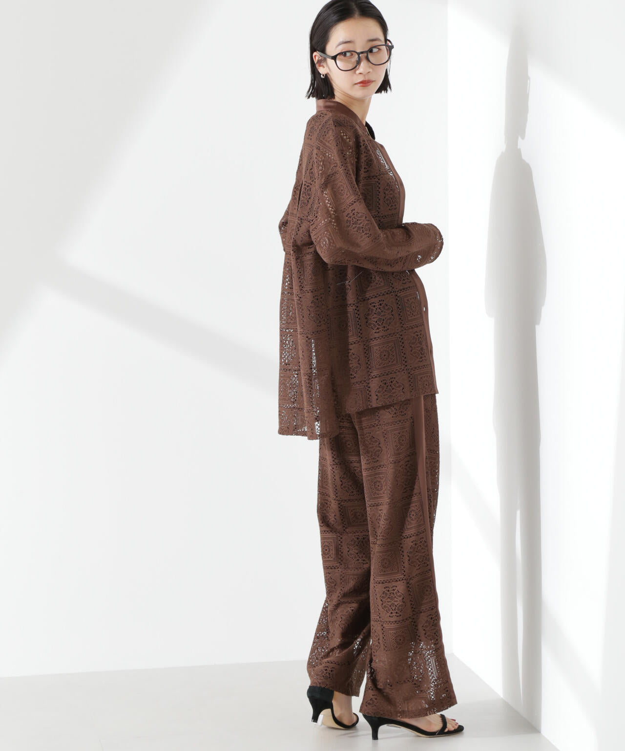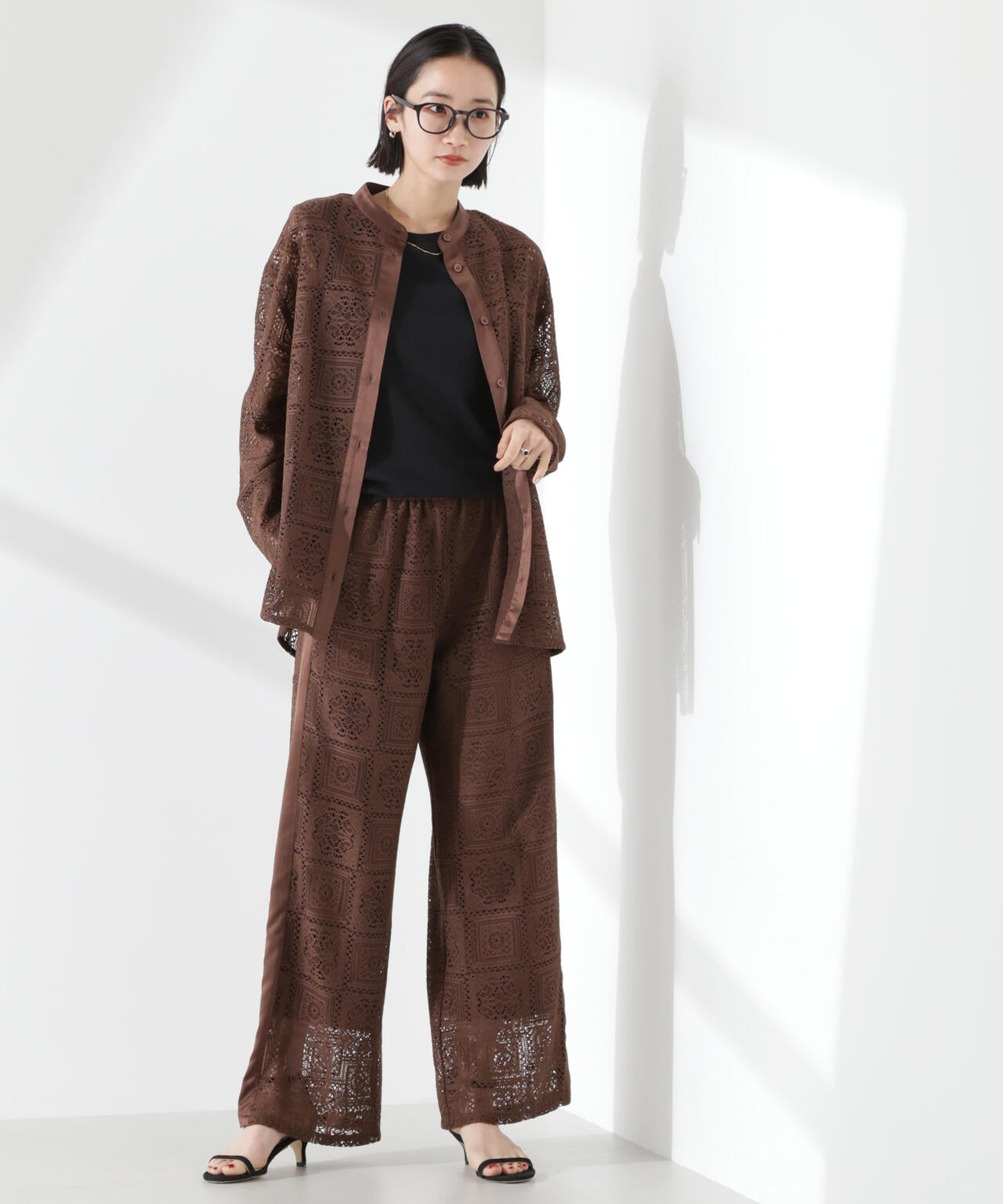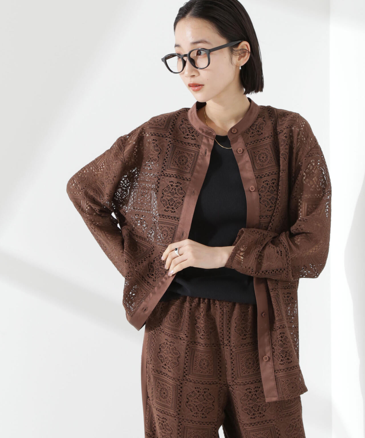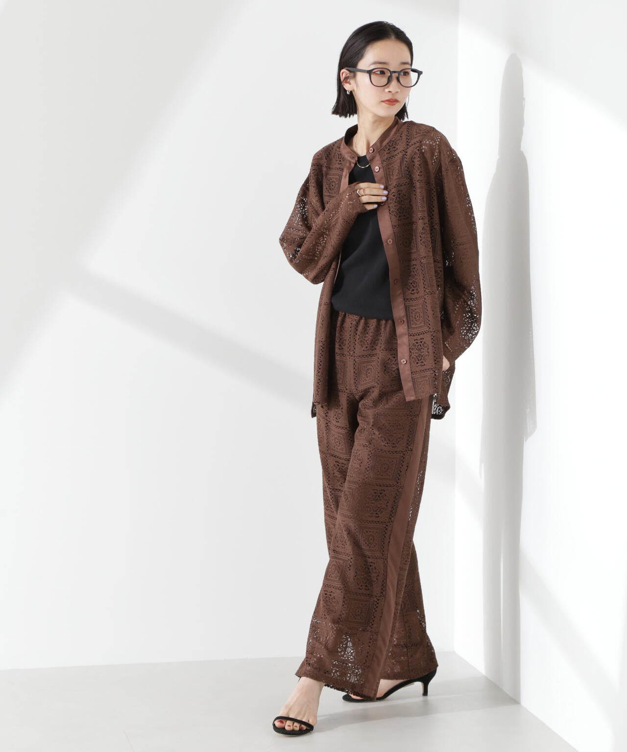 クロシェ編み風のレースデザインで仕立てたバンドカラーシャツ。パッと華やかな印象ながら、甘すぎないレース模様や異素材の前立て等、すっきり着こなせるディティールがポイント。同素材展開のパンツとのセットアップスタイルもおすすめです。
