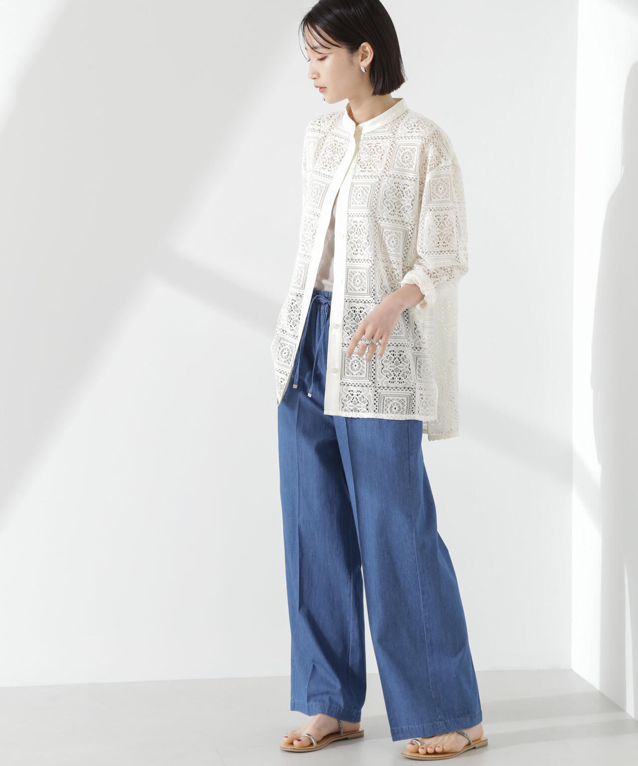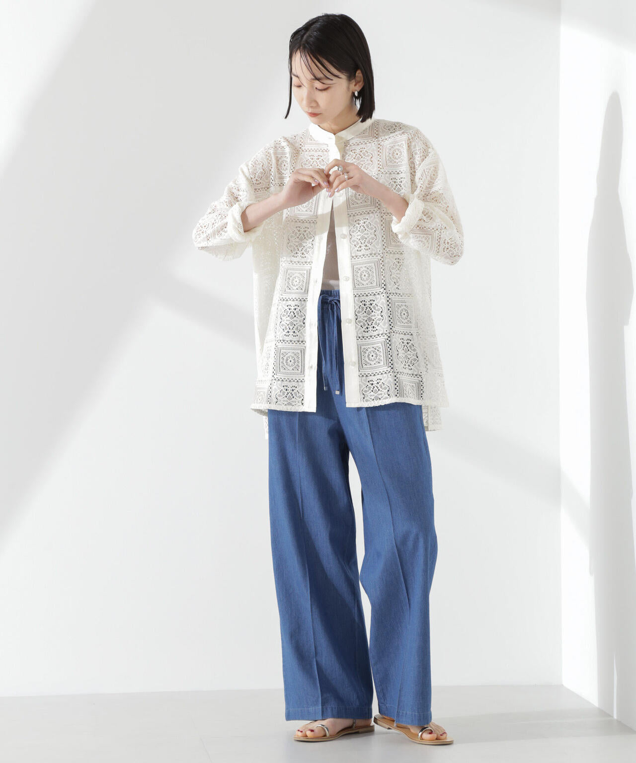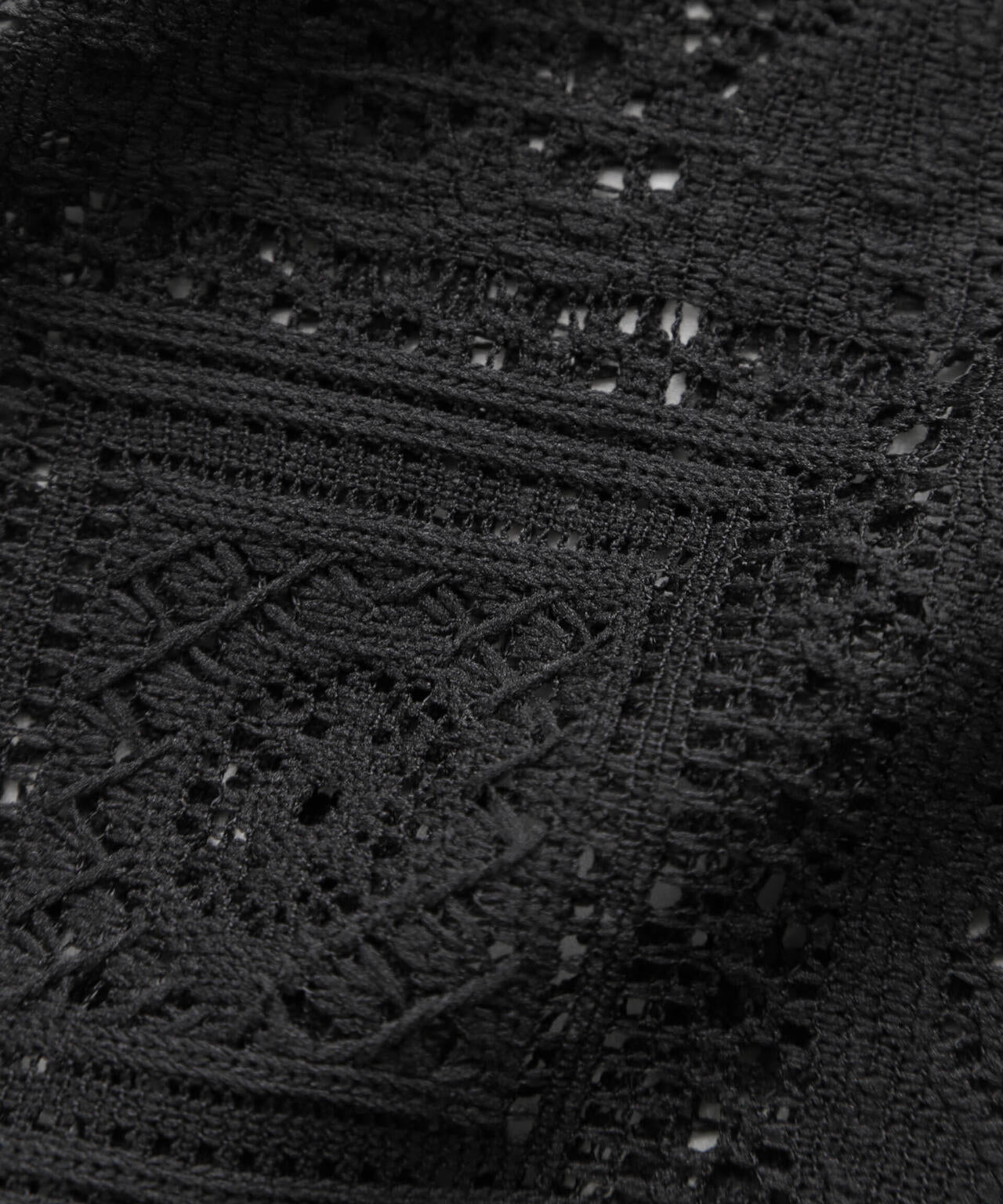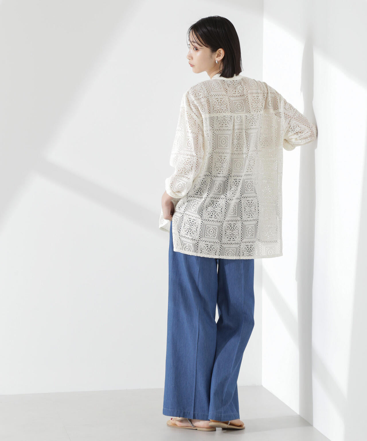 クロシェ編み風のレースデザインで仕立てたバンドカラーシャツ。パッと華やかな印象ながら、甘すぎないレース模様や異素材の前立て等、すっきり着こなせるディティールがポイント。同素材展開のパンツとのセットアップスタイルもおすすめです。