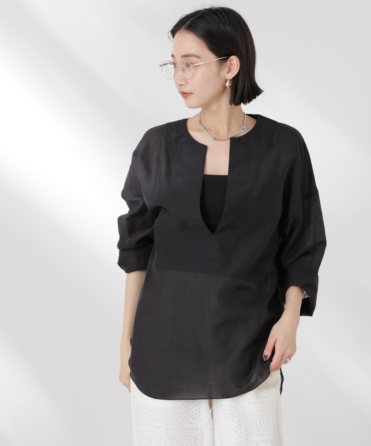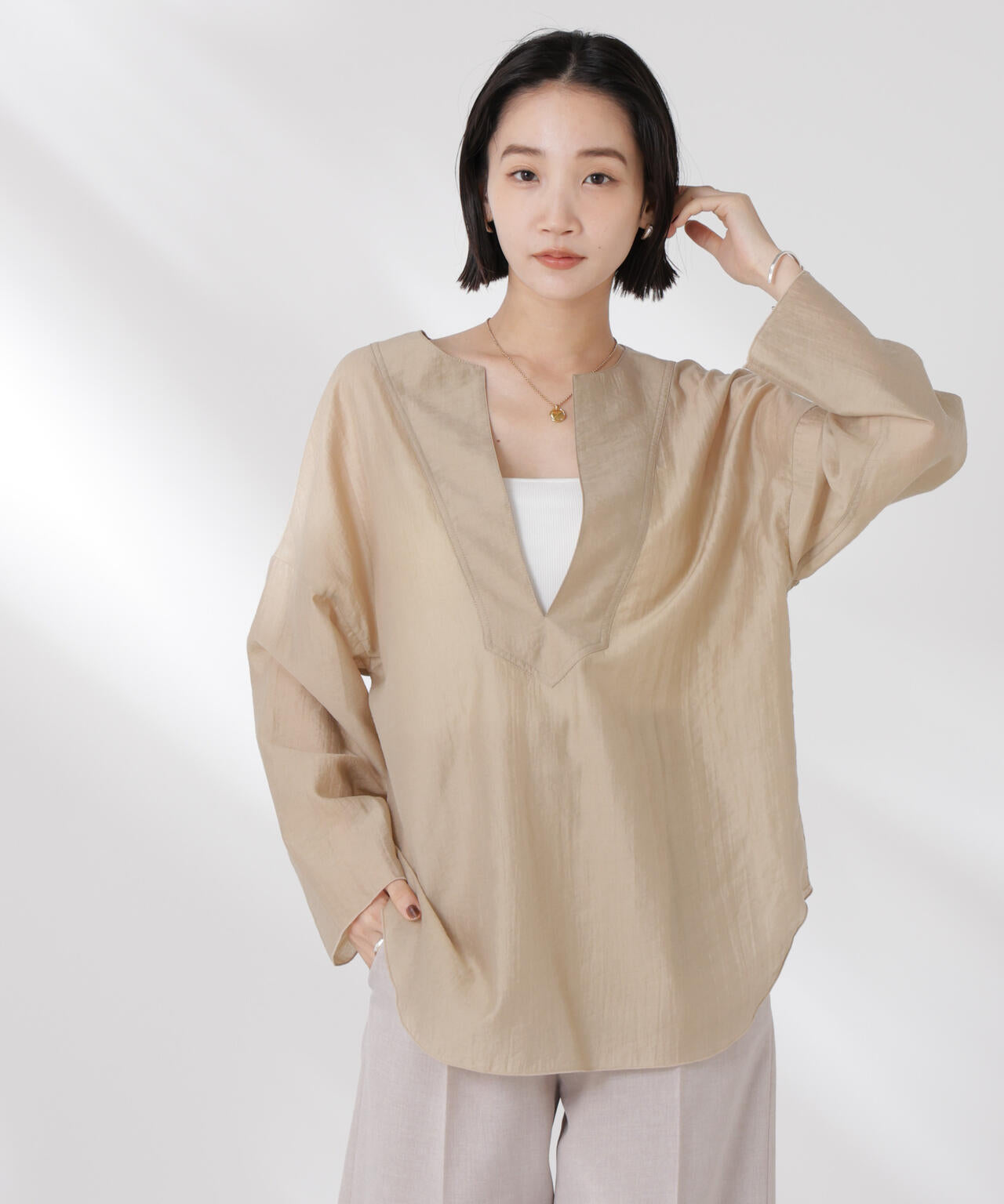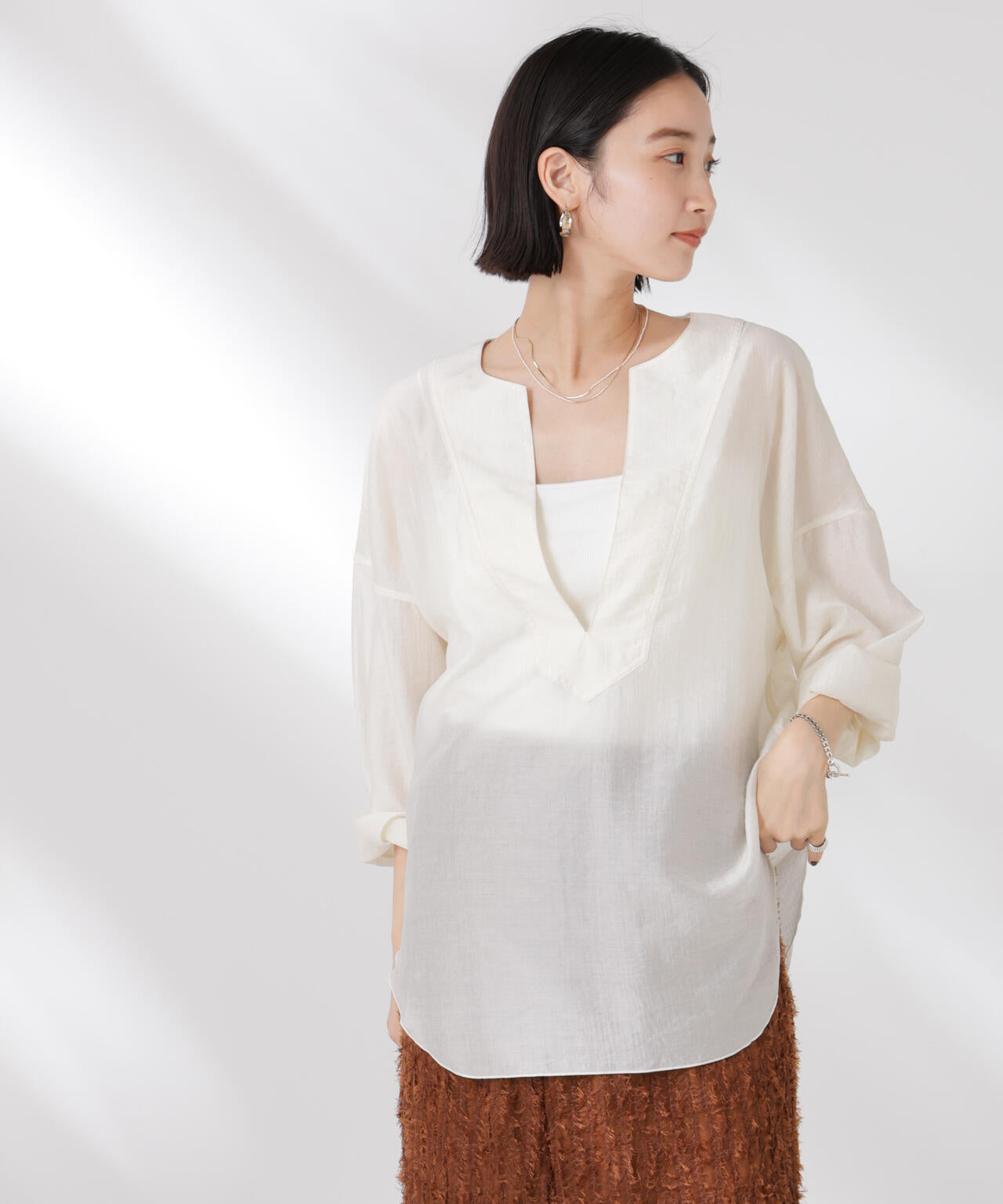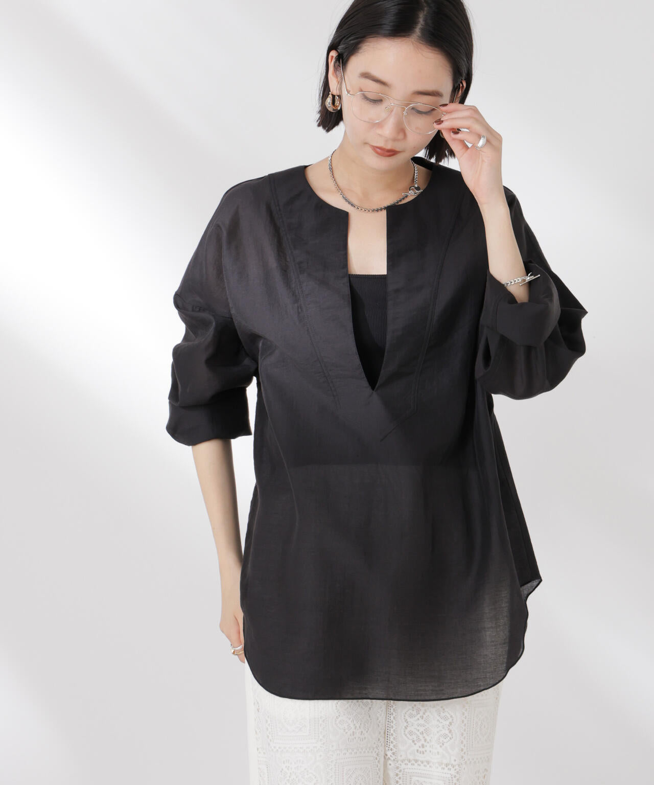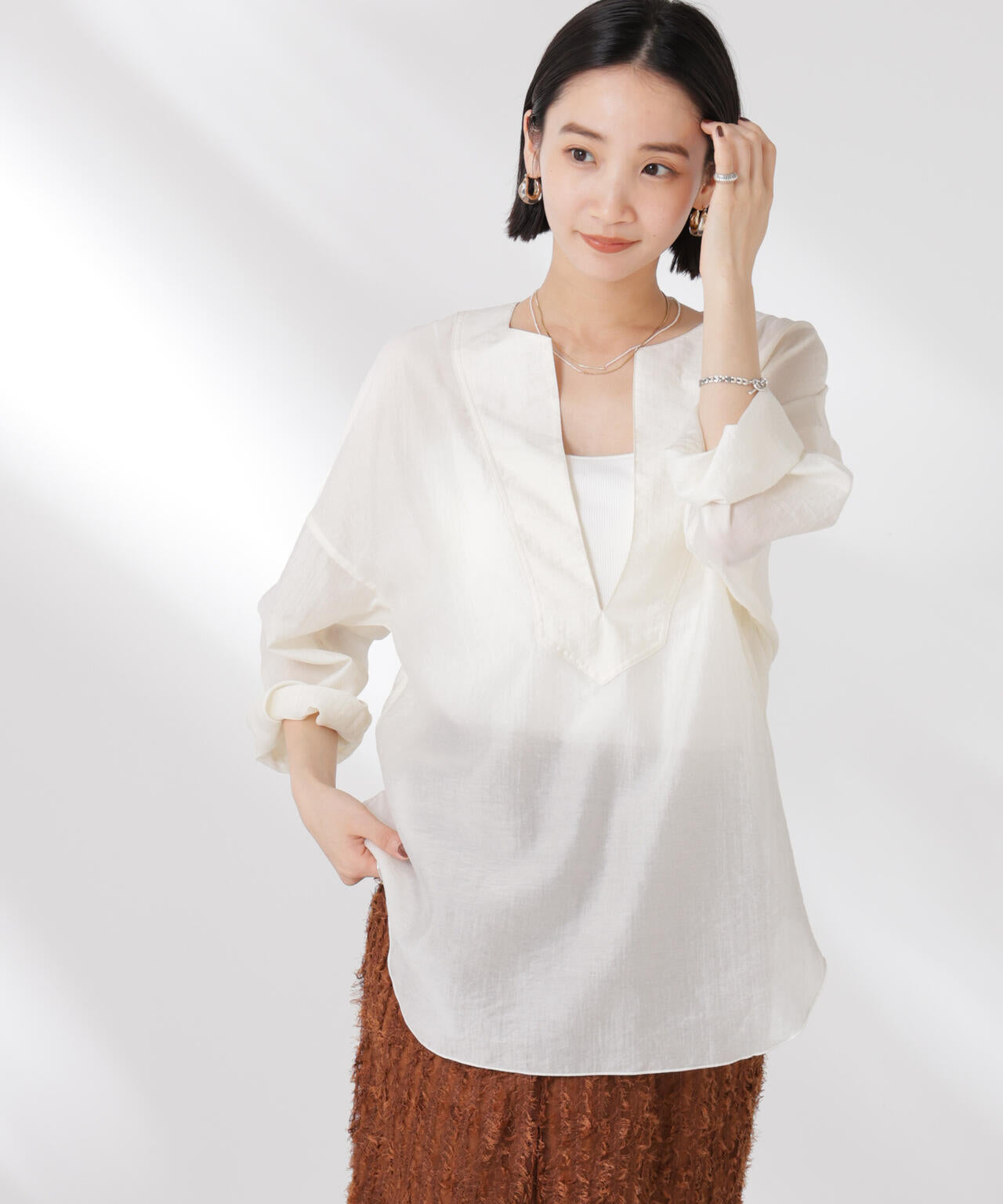 深めのVネックと上品なシアー感が抜け感をプラスしてくれるプルオーバーブラウス。大胆に入ったVネックが特徴的で、顔まわりにシャープな印象を与えてくれる一枚です。