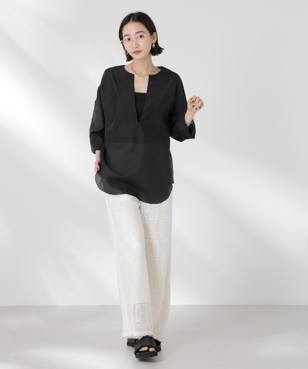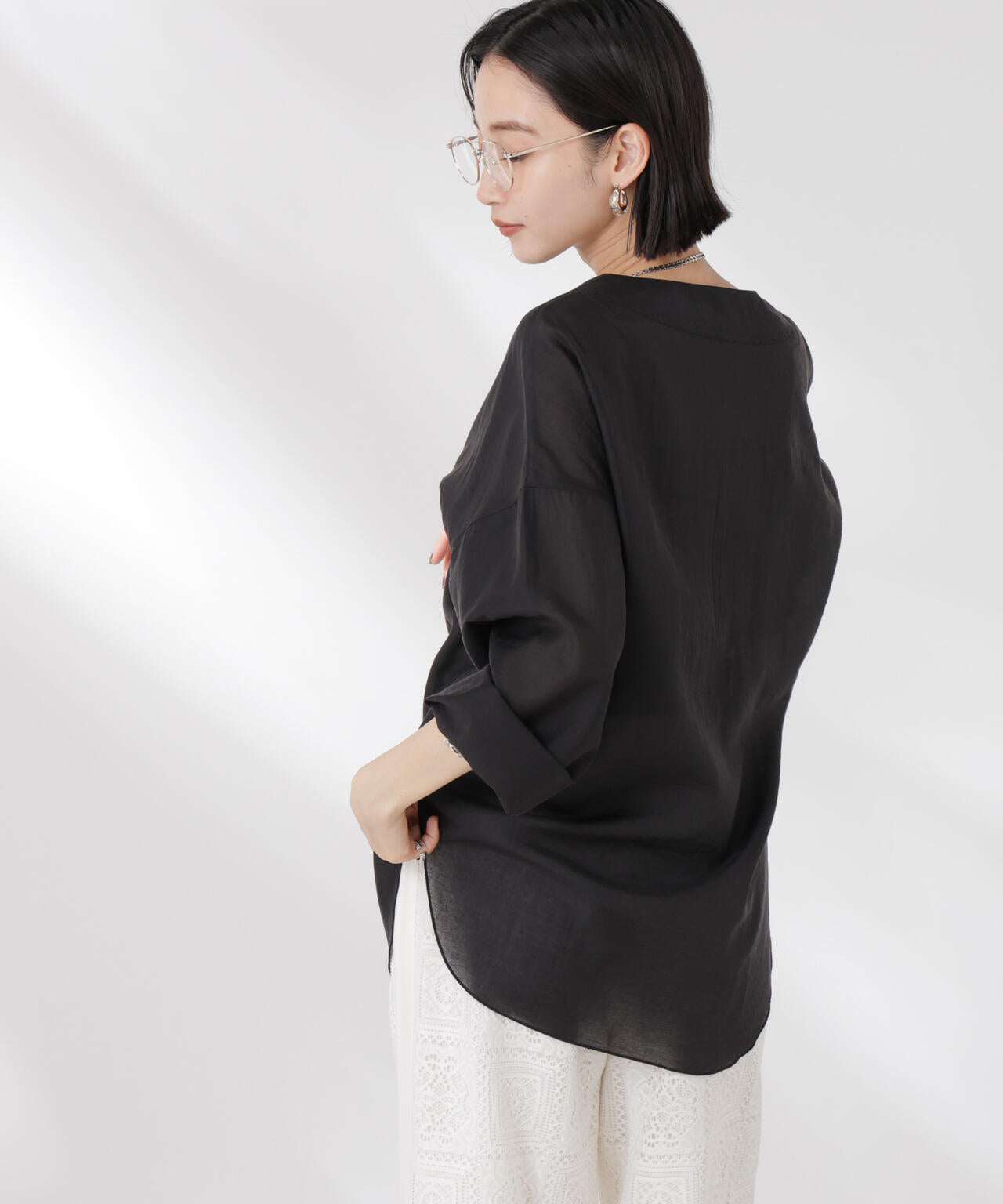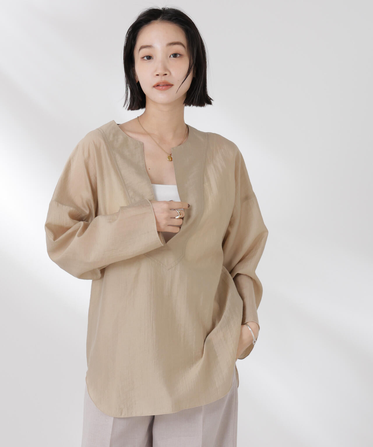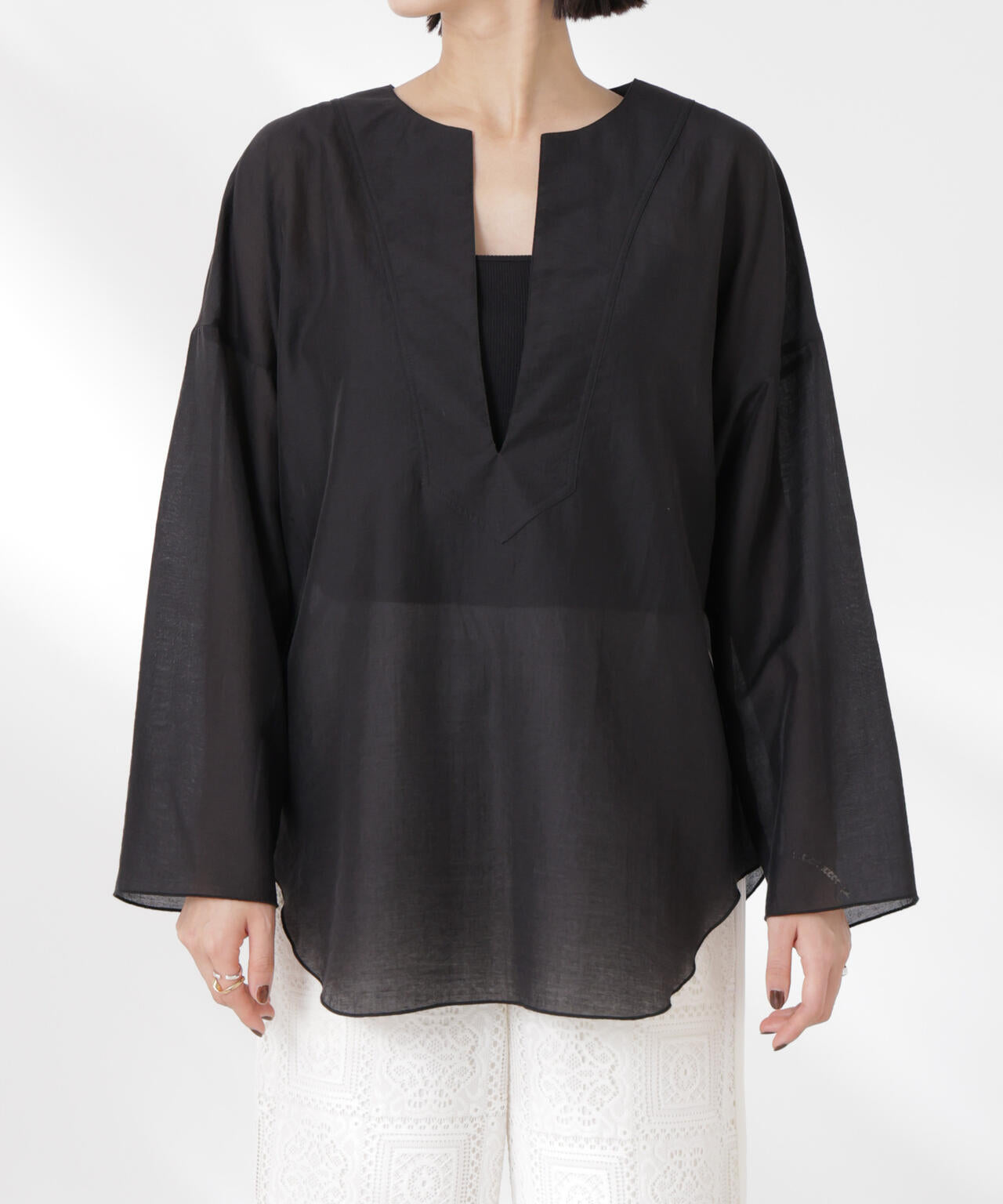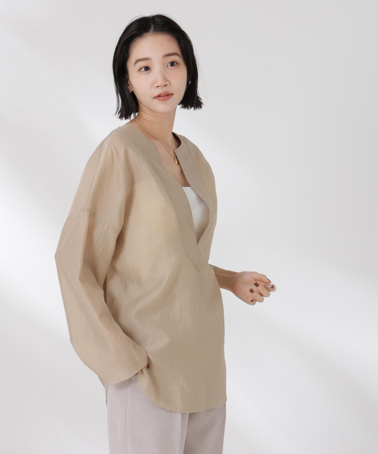 深めのVネックと上品なシアー感が抜け感をプラスしてくれるプルオーバーブラウス。大胆に入ったVネックが特徴的で、顔まわりにシャープな印象を与えてくれる一枚です。