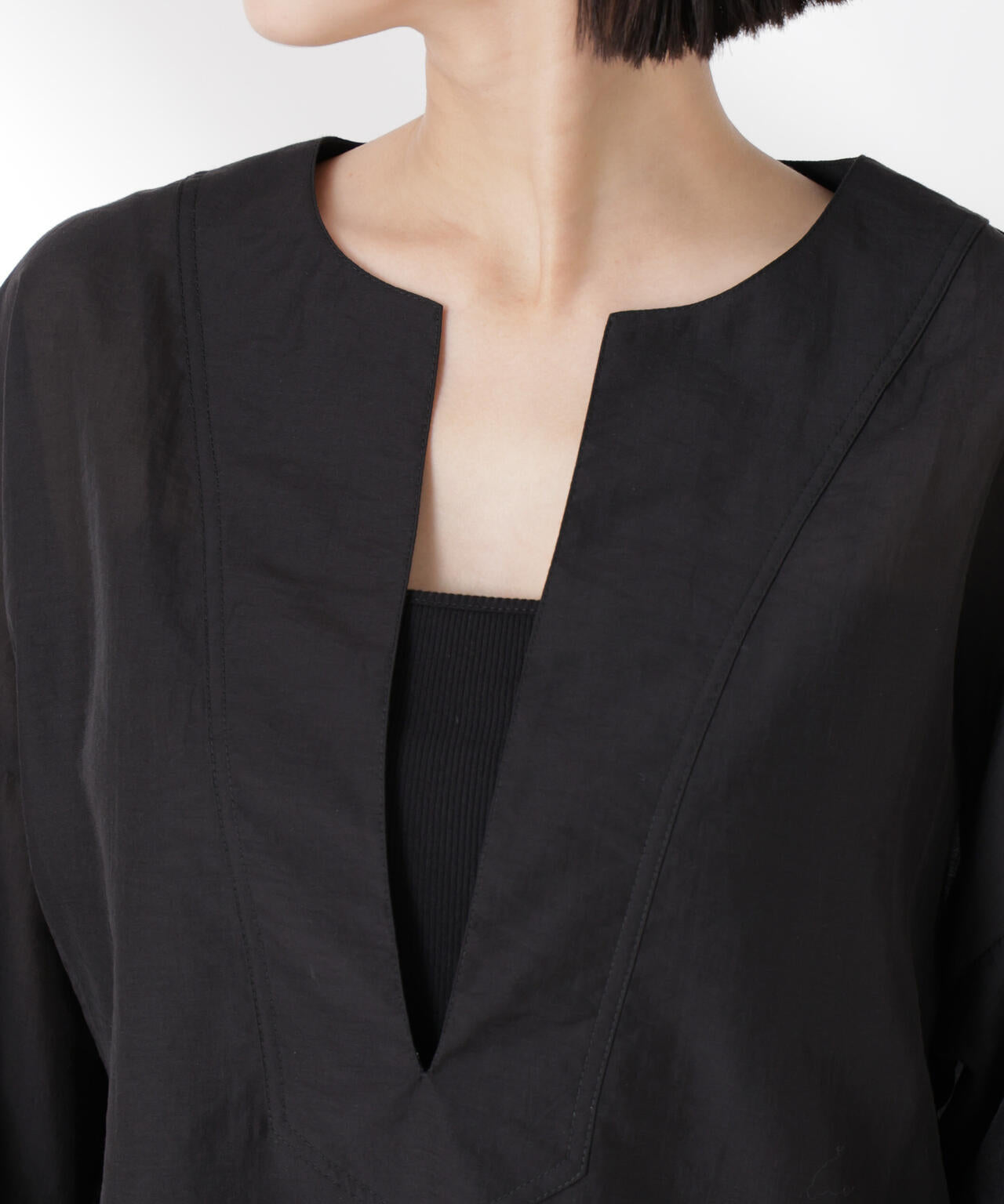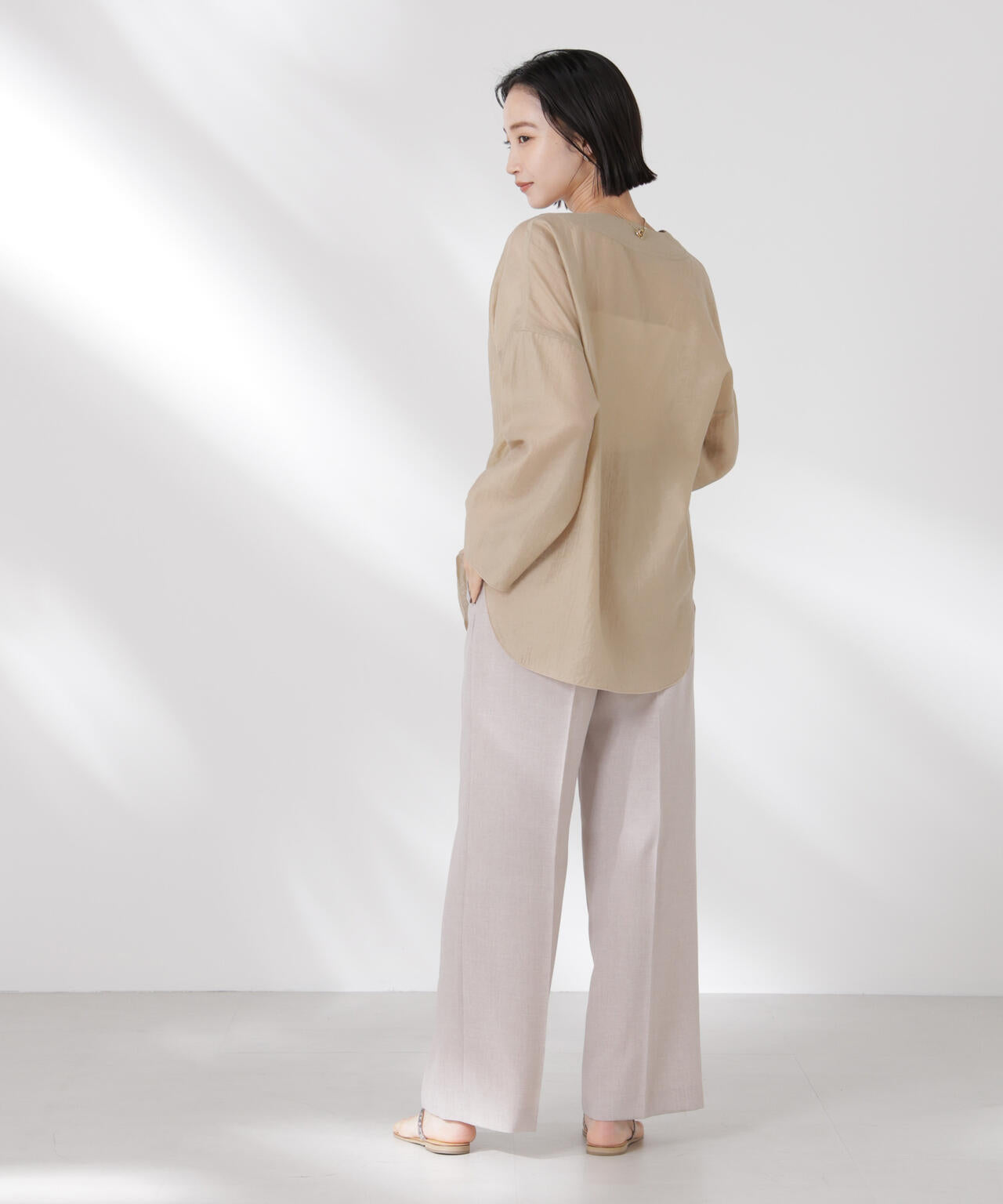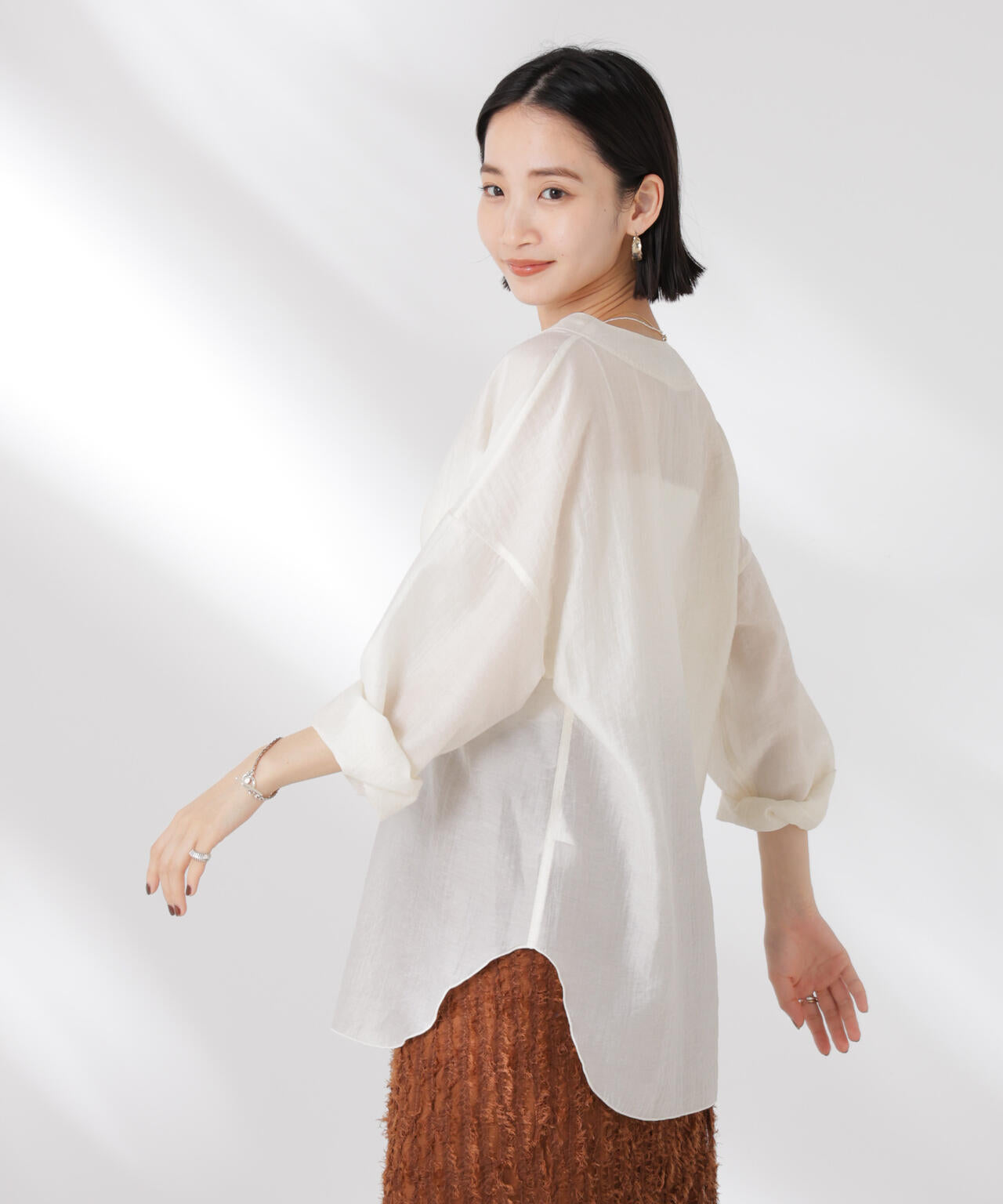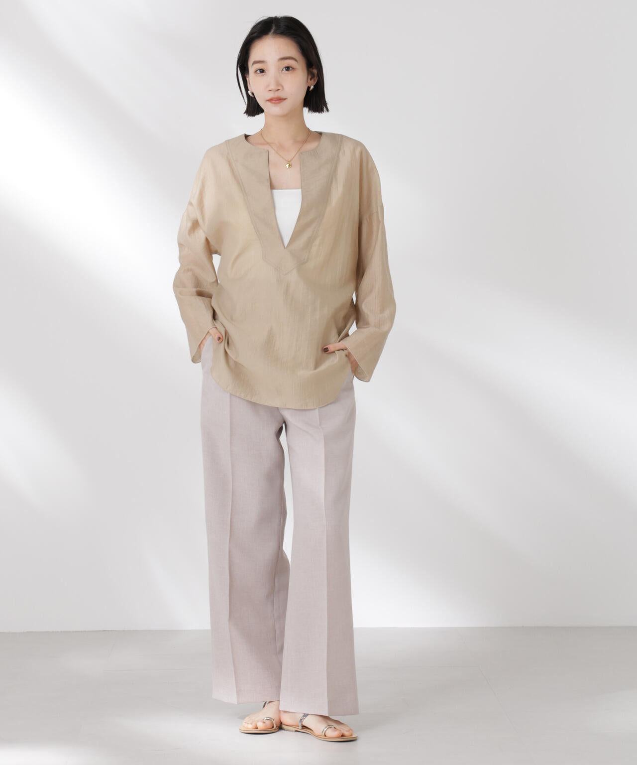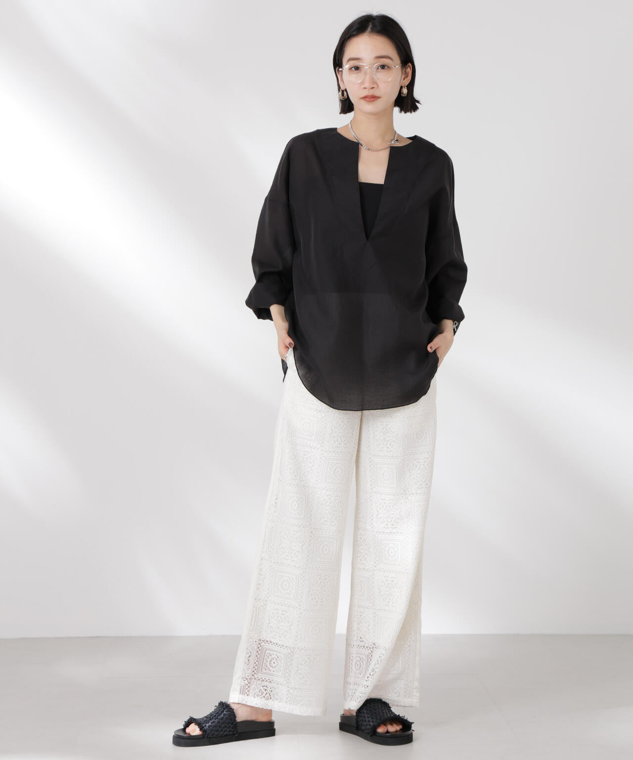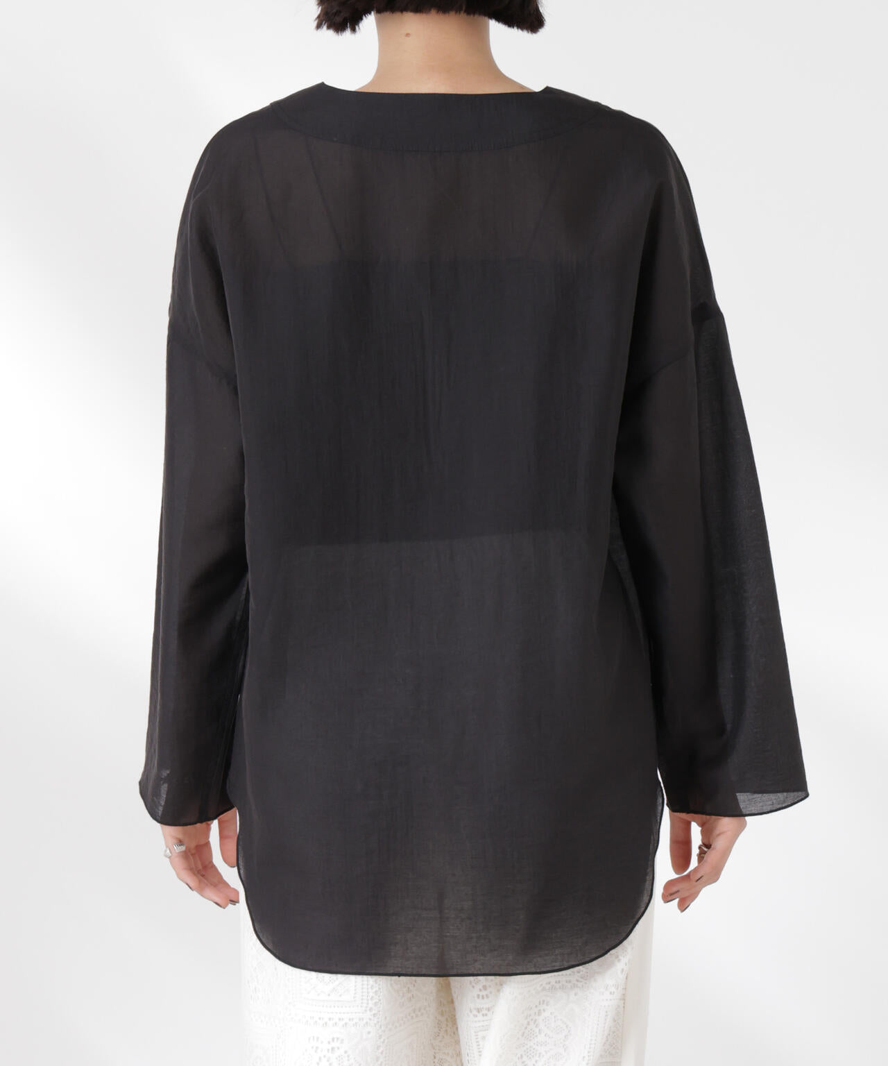 深めのVネックと上品なシアー感が抜け感をプラスしてくれるプルオーバーブラウス。大胆に入ったVネックが特徴的で、顔まわりにシャープな印象を与えてくれる一枚です。