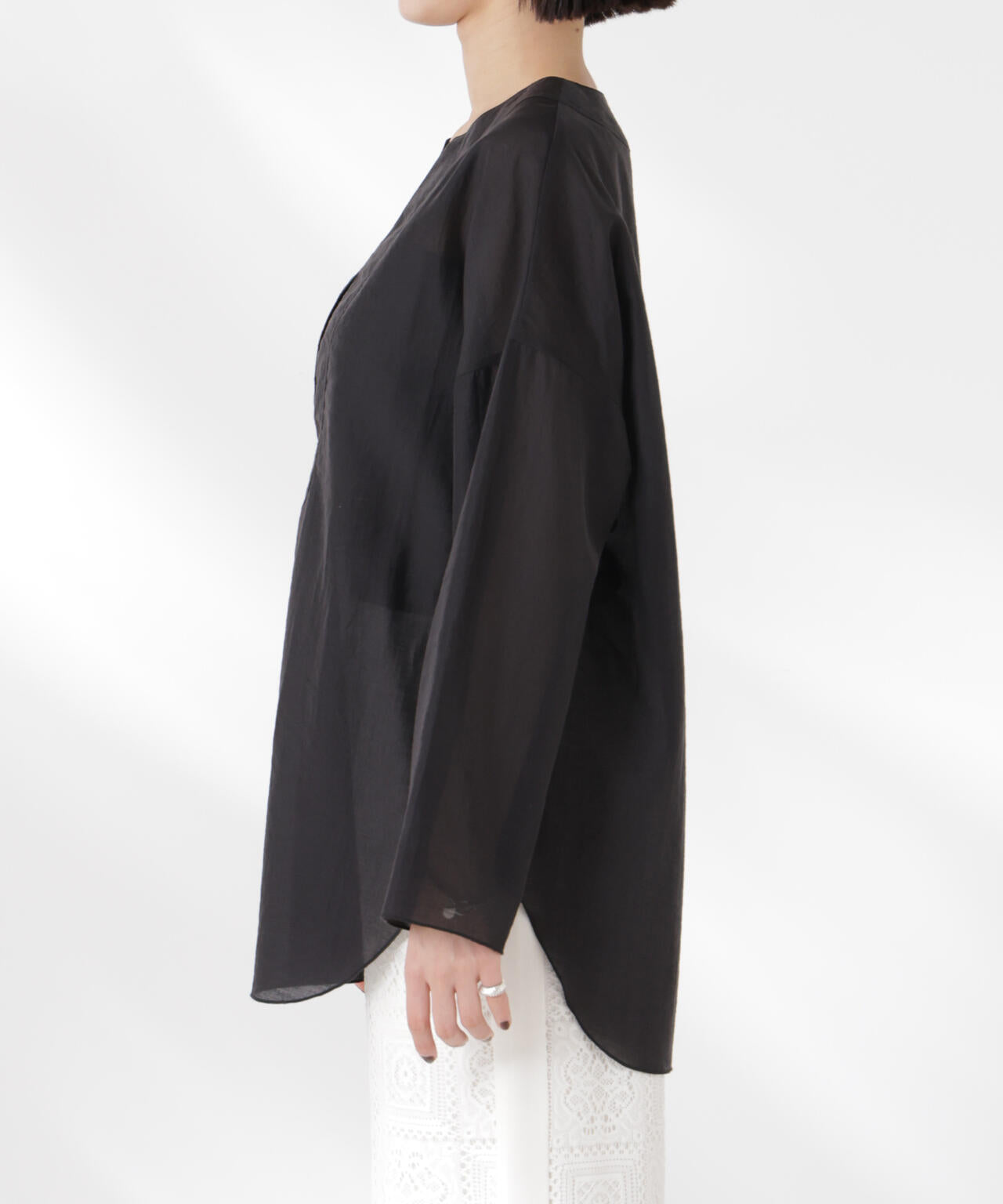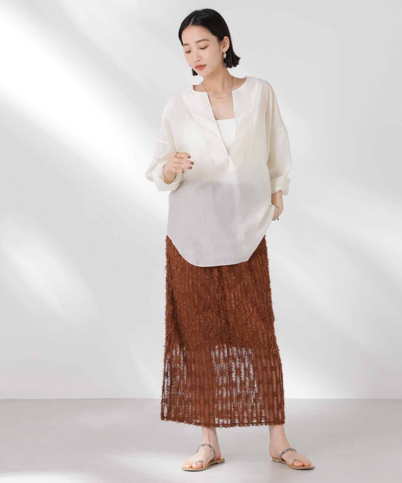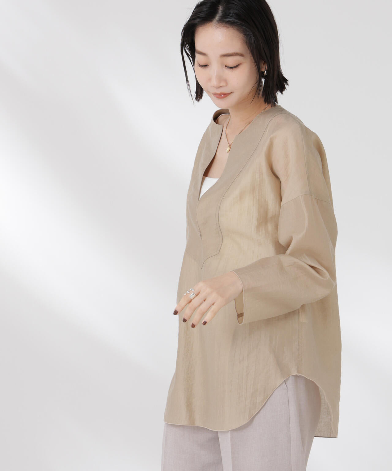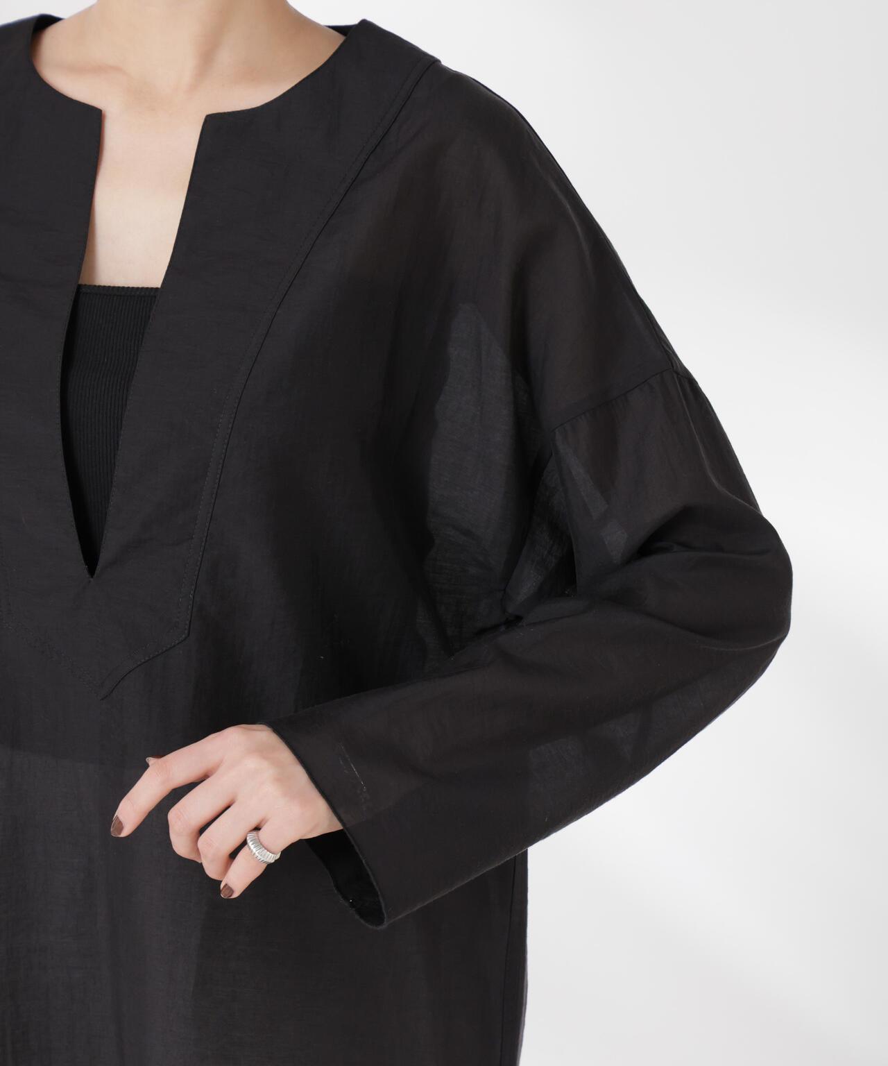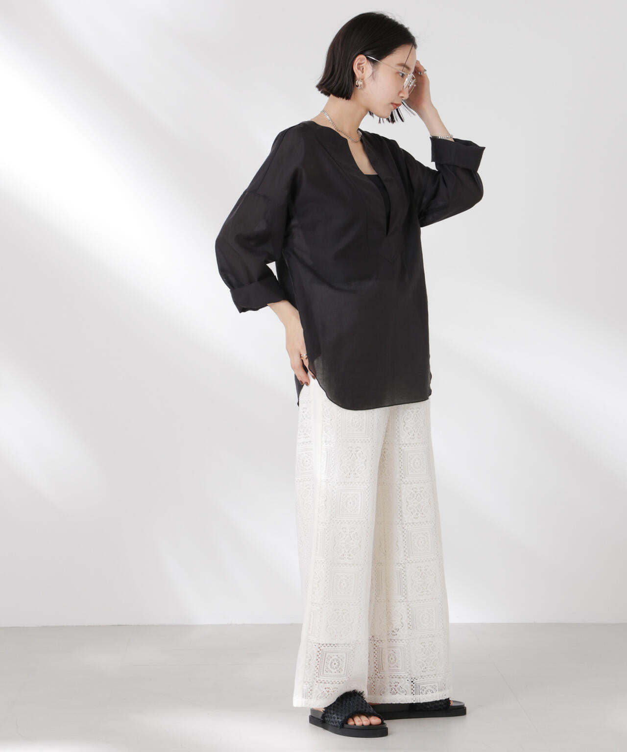 深めのVネックと上品なシアー感が抜け感をプラスしてくれるプルオーバーブラウス。大胆に入ったVネックが特徴的で、顔まわりにシャープな印象を与えてくれる一枚です。