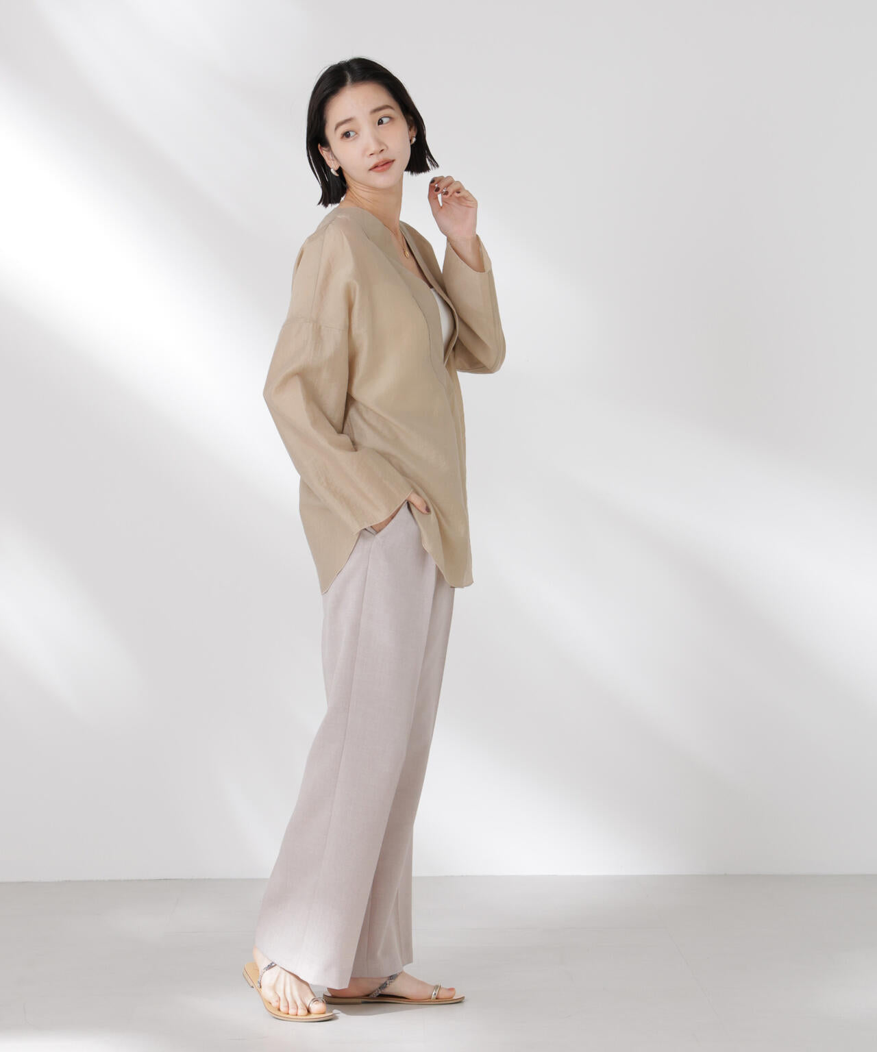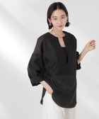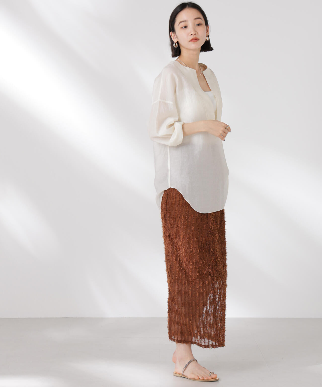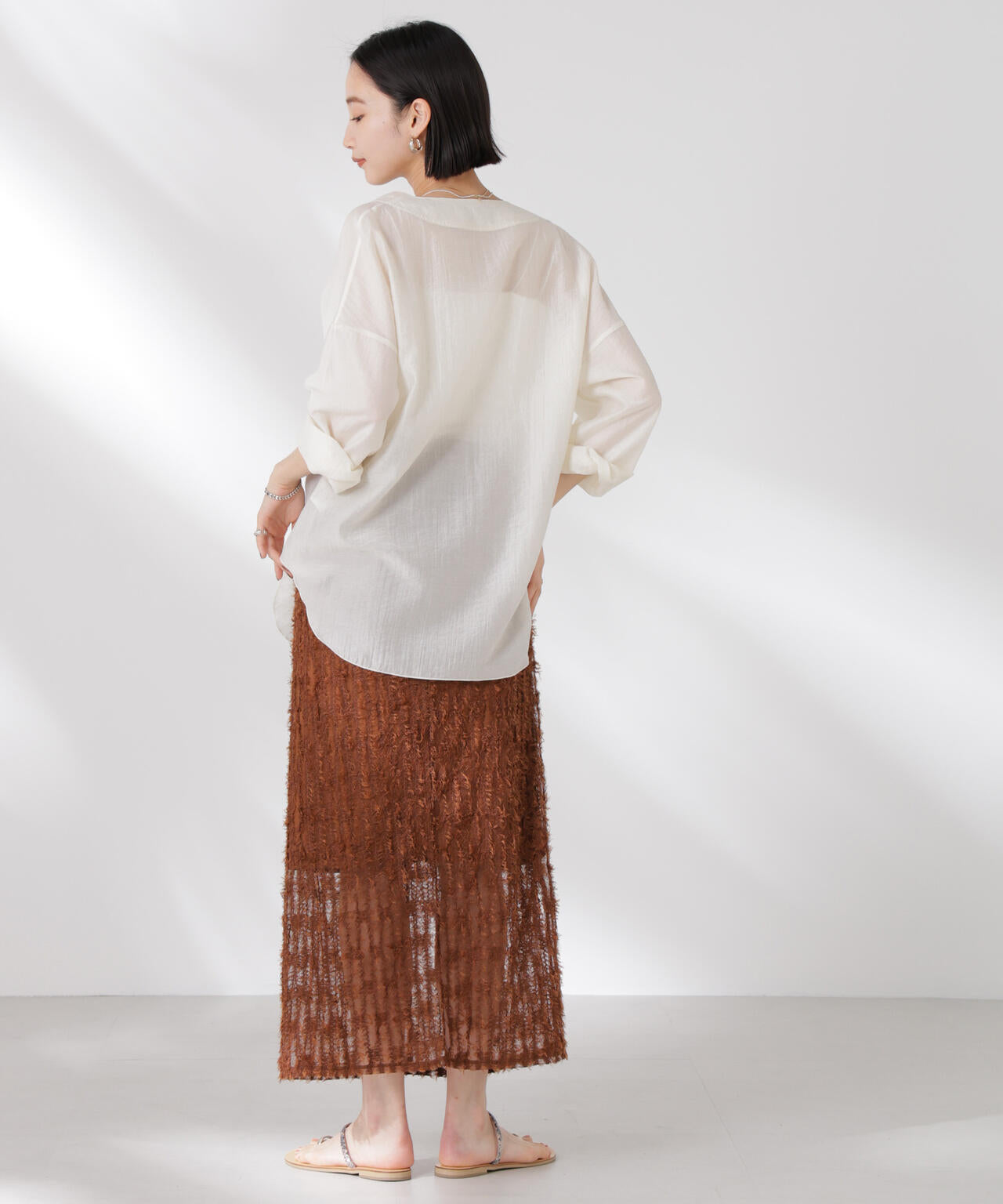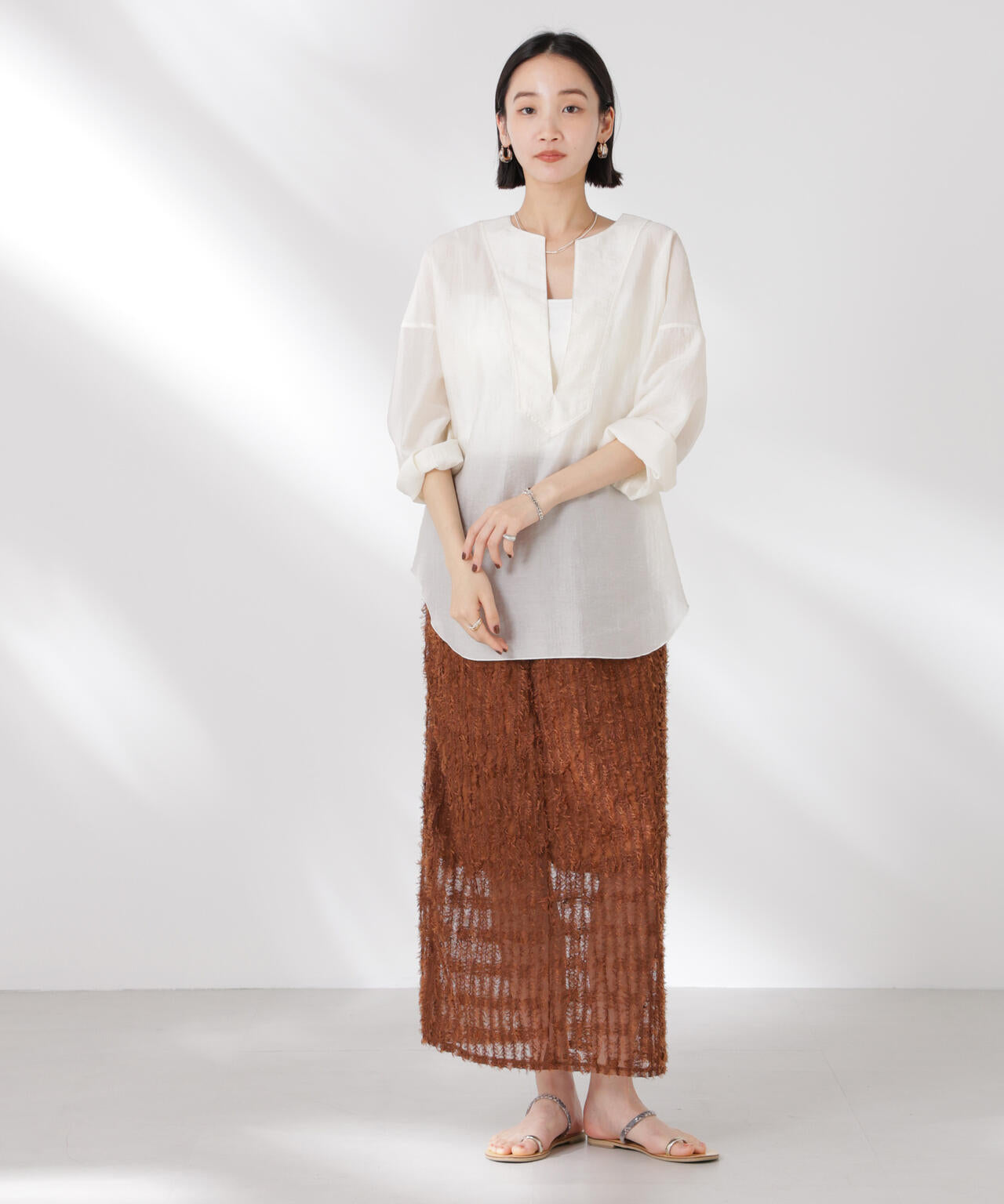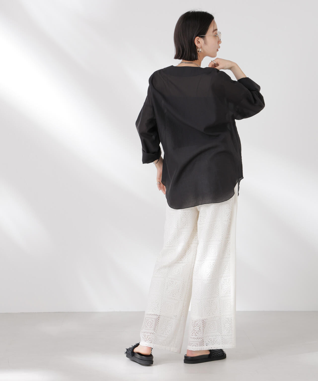 深めのVネックと上品なシアー感が抜け感をプラスしてくれるプルオーバーブラウス。大胆に入ったVネックが特徴的で、顔まわりにシャープな印象を与えてくれる一枚です。
