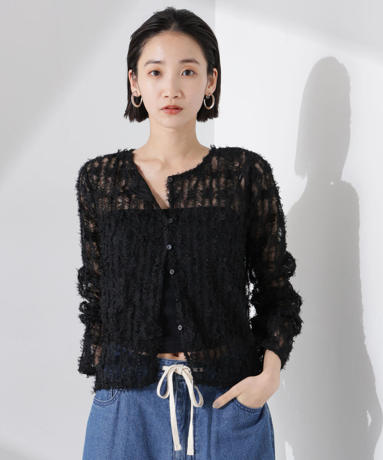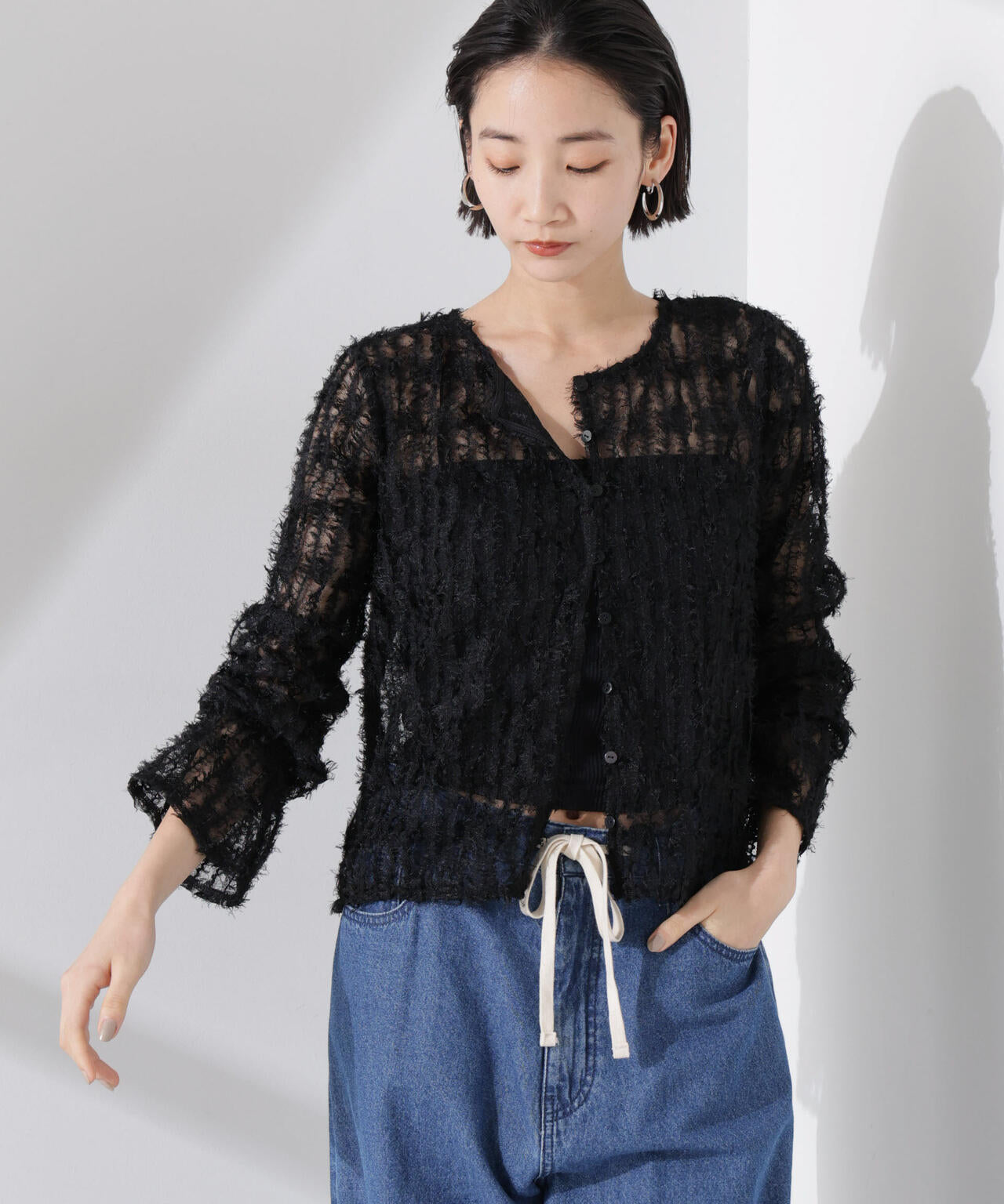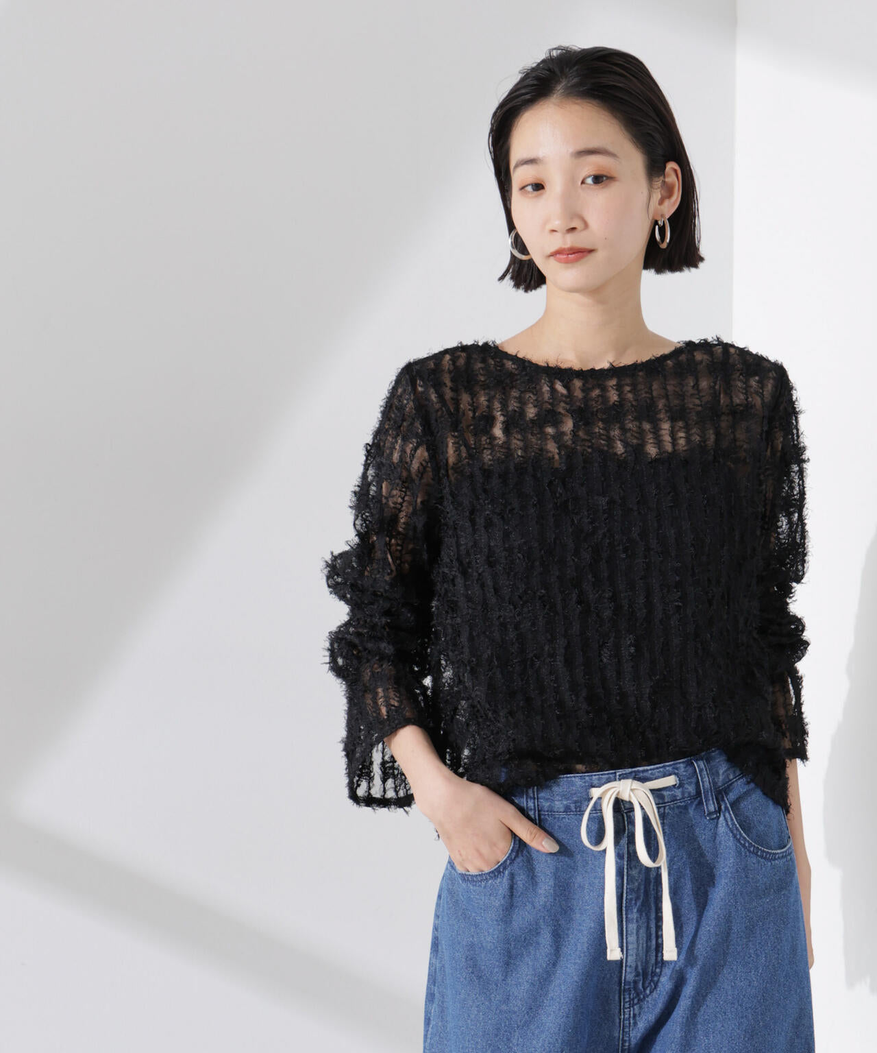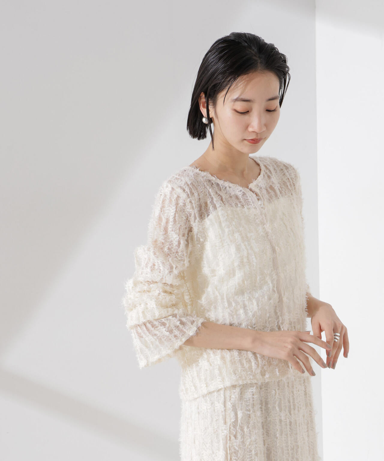 一枚でしっかり映えるフリンジデザインが特徴の前後2wayブラウス。長さのないフリンジなので個性的過ぎず、程よいチュールの透け感が女性らしいアイテム。ややクロップ丈でスタイルアップも叶い、いろいろな着こなしが楽しめるひと品です。