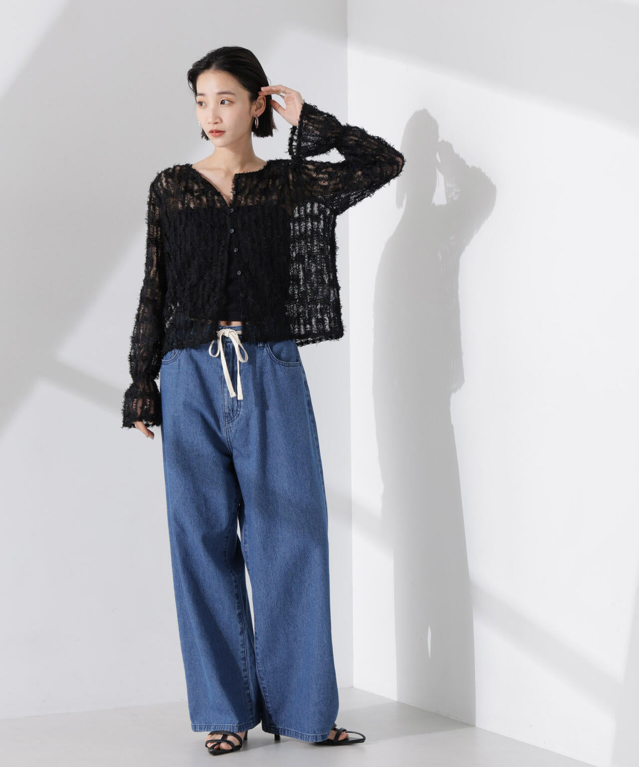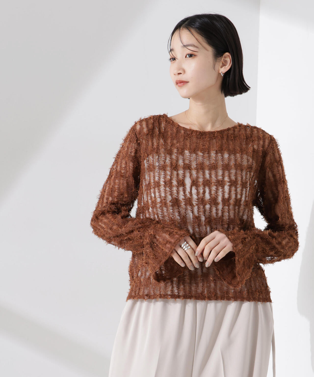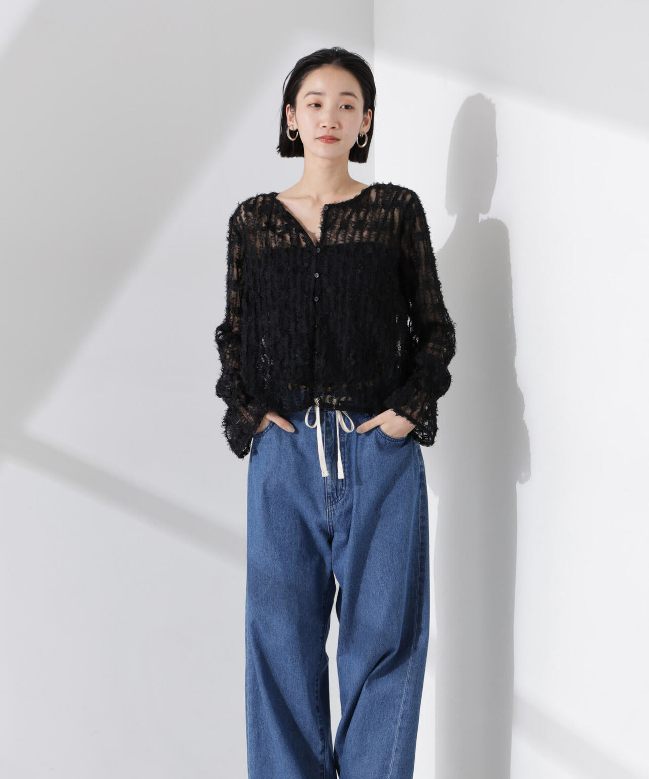 一枚でしっかり映えるフリンジデザインが特徴の前後2wayブラウス。長さのないフリンジなので個性的過ぎず、程よいチュールの透け感が女性らしいアイテム。ややクロップ丈でスタイルアップも叶い、いろいろな着こなしが楽しめるひと品です。