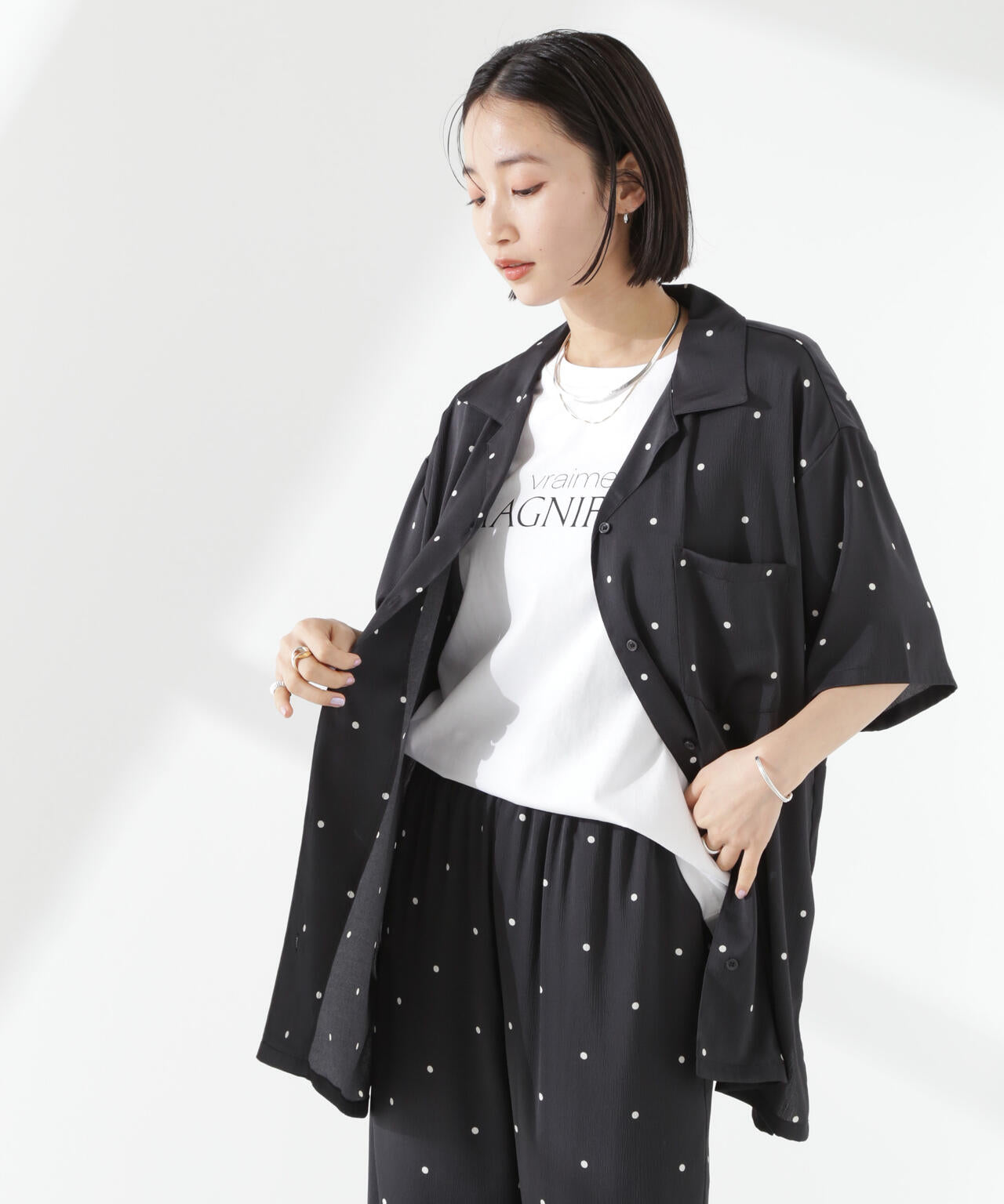 落ち感のあるとろみ素材でリラックス感たっぷりのドットブラウス。シンプルながらも上品で大人っぽい雰囲気で遊び心のあるドット柄が魅力なアイテム。オフィススタイルにも使え、カジュアルダウンすればデイリー使いにもぴったりな一着です。
