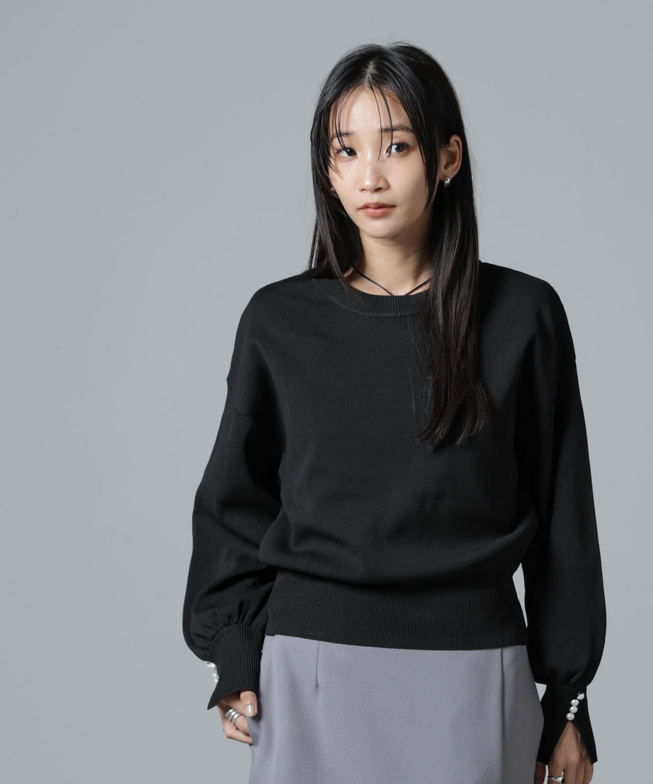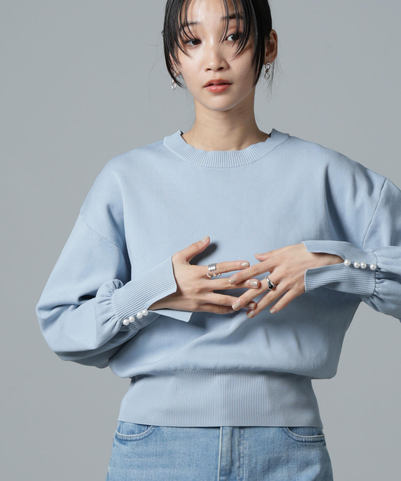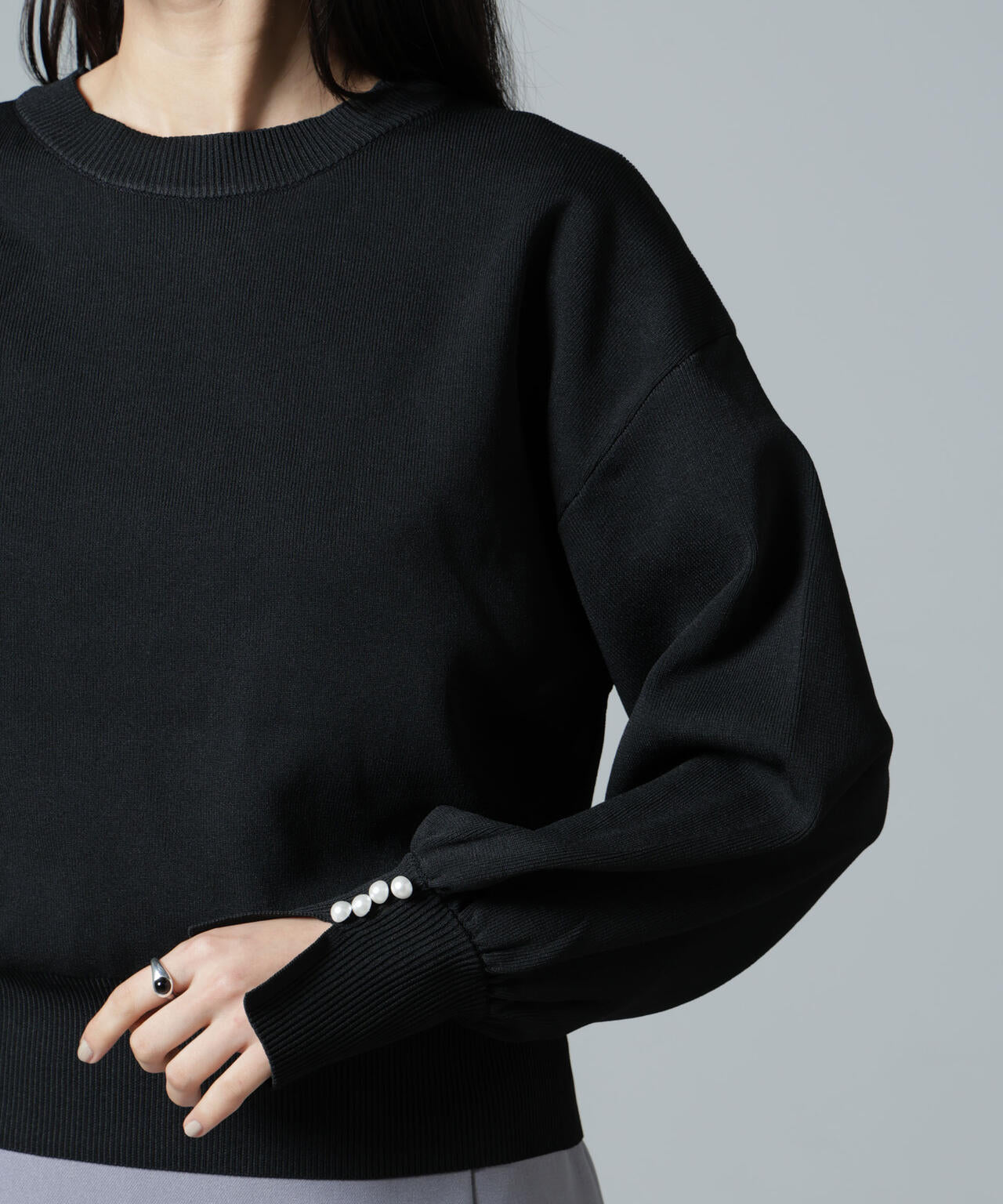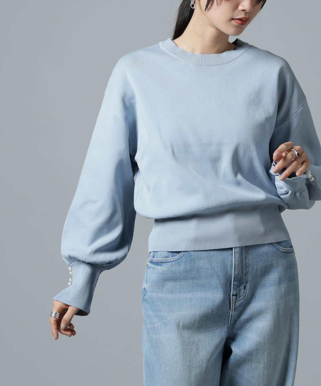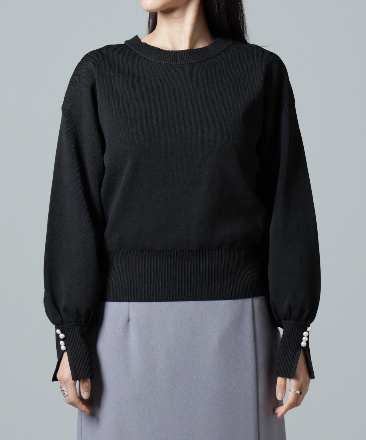 毎シーズンご好評の洗濯機洗い可シリーズのニットトップス。袖口に配置したパールが上品な印象を与えるデザインで、オンオフで活躍するアイテム。ややコンパクトな丈感のボックスシルエットで、スタイルが良く見える一枚です。