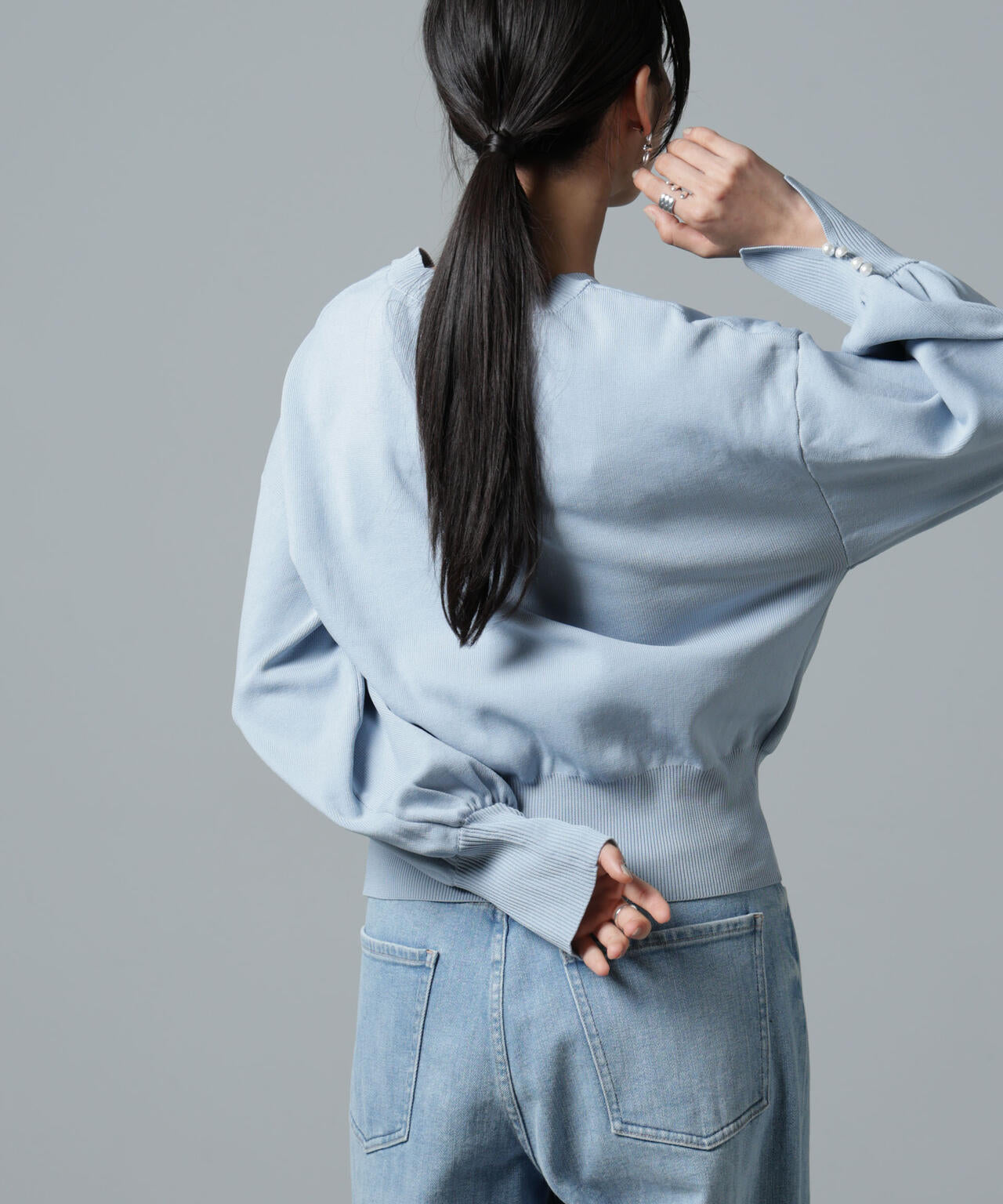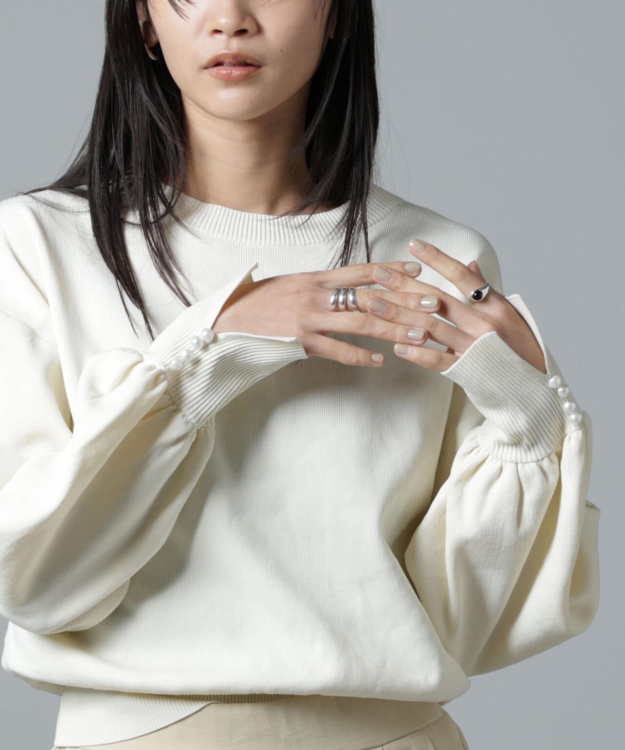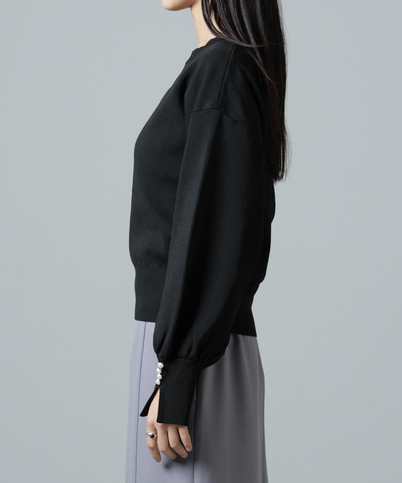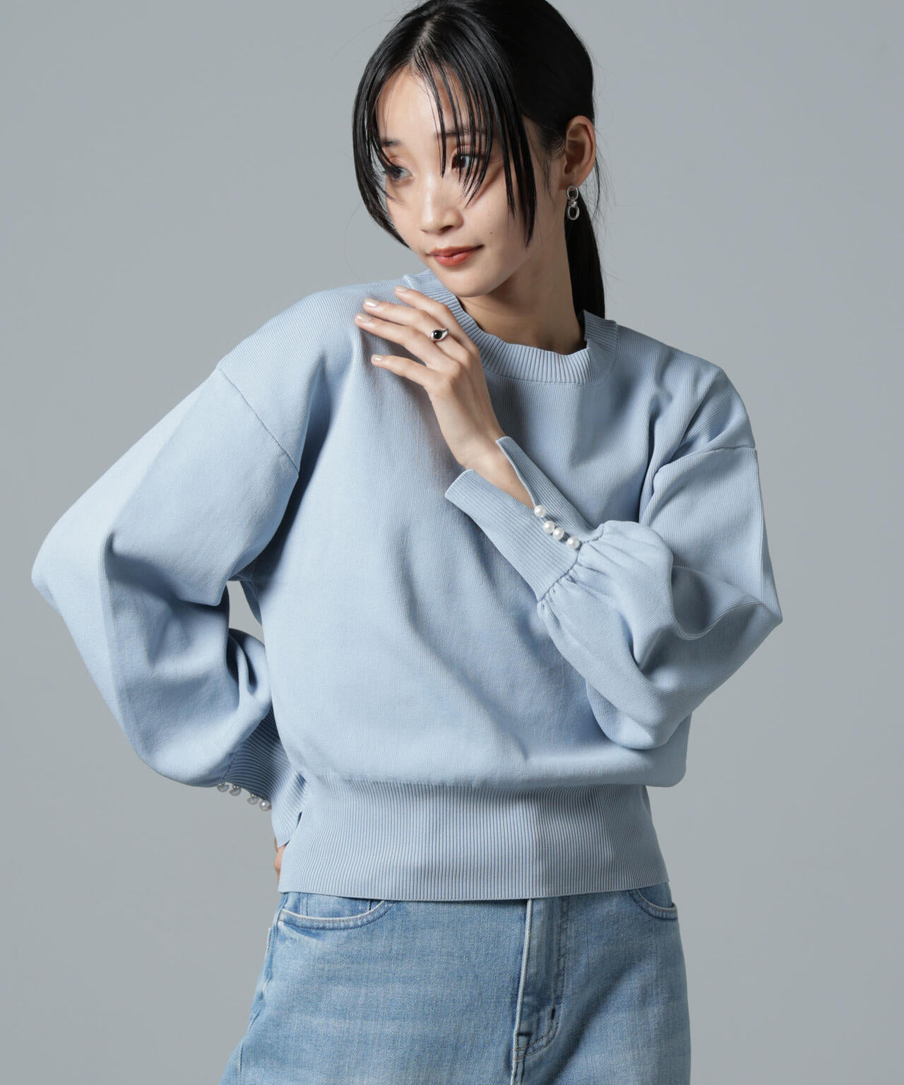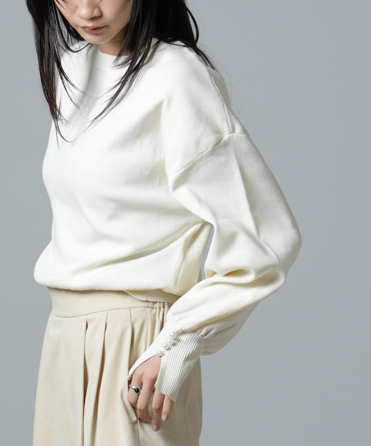 毎シーズンご好評の洗濯機洗い可シリーズのニットトップス。袖口に配置したパールが上品な印象を与えるデザインで、オンオフで活躍するアイテム。ややコンパクトな丈感のボックスシルエットで、スタイルが良く見える一枚です。