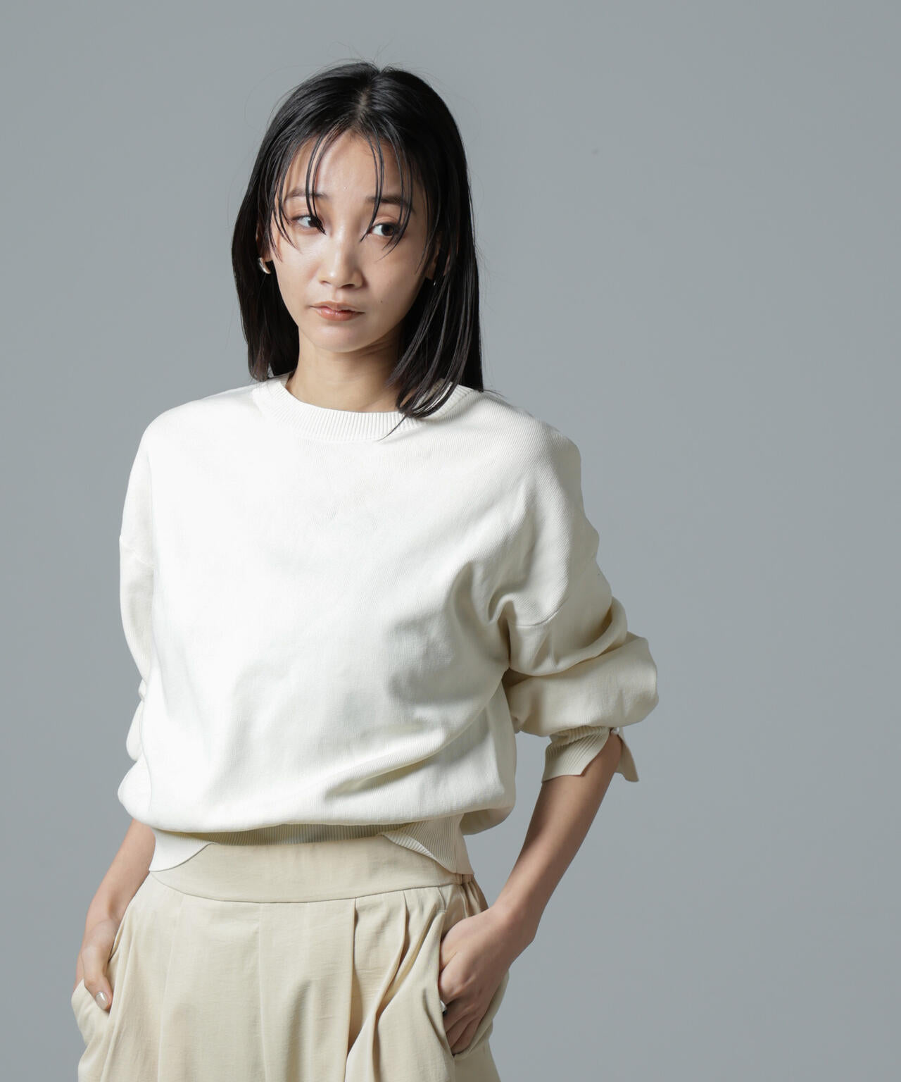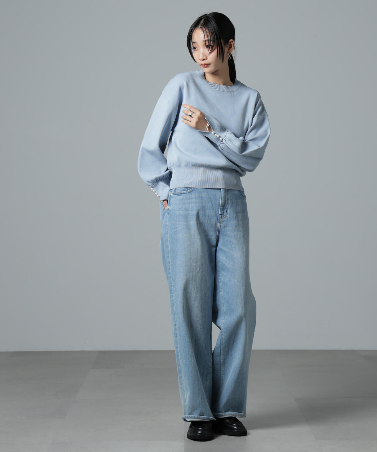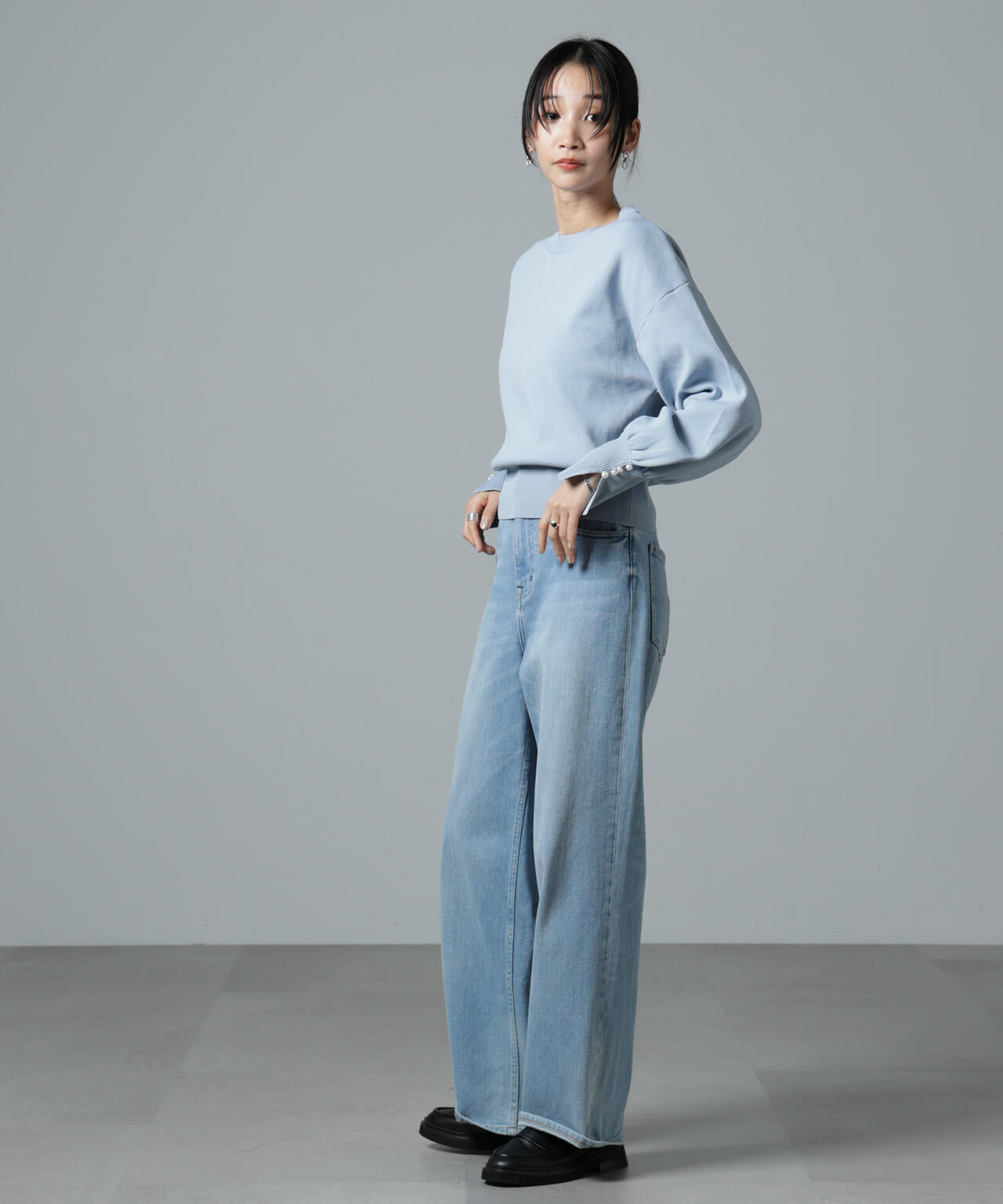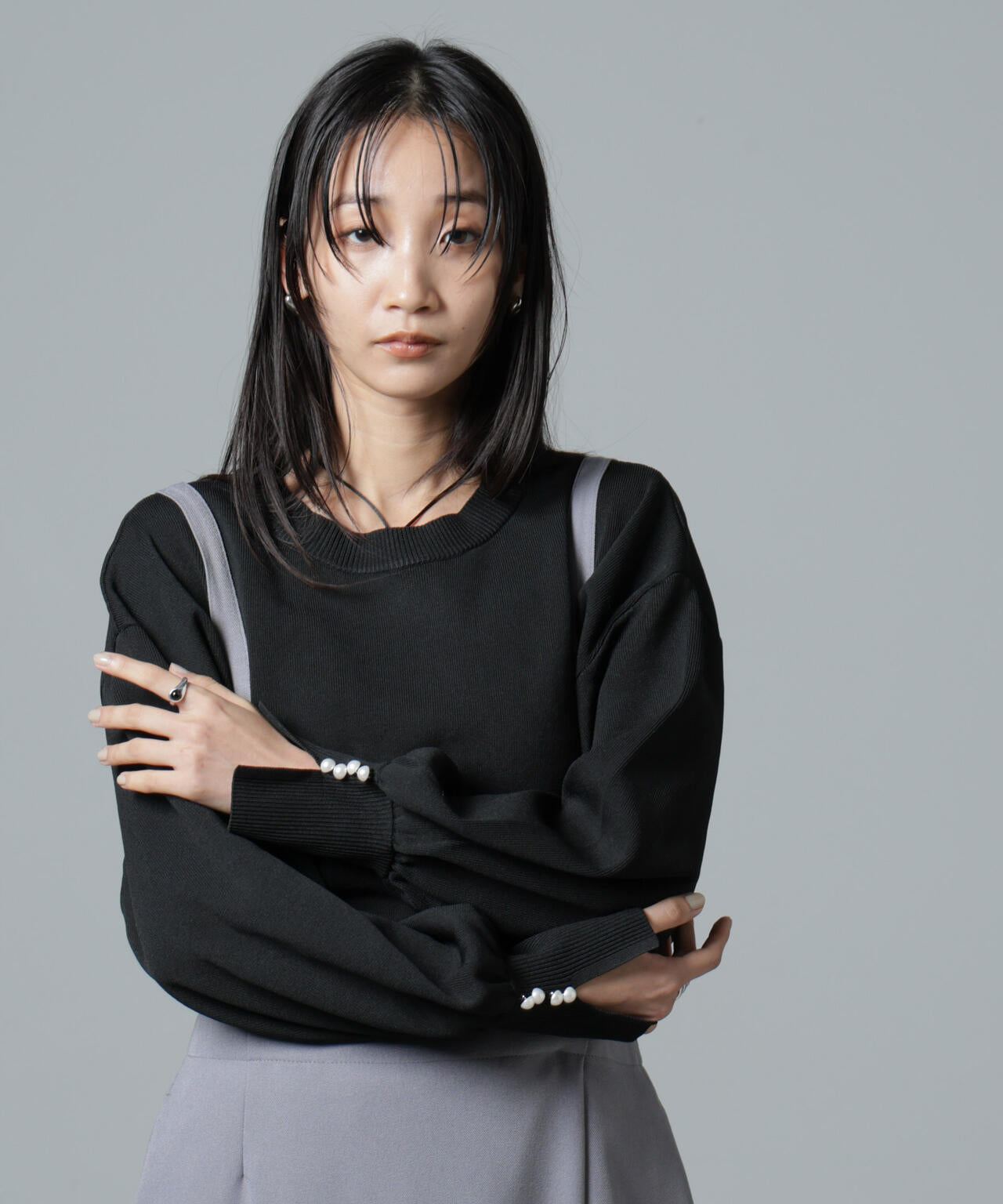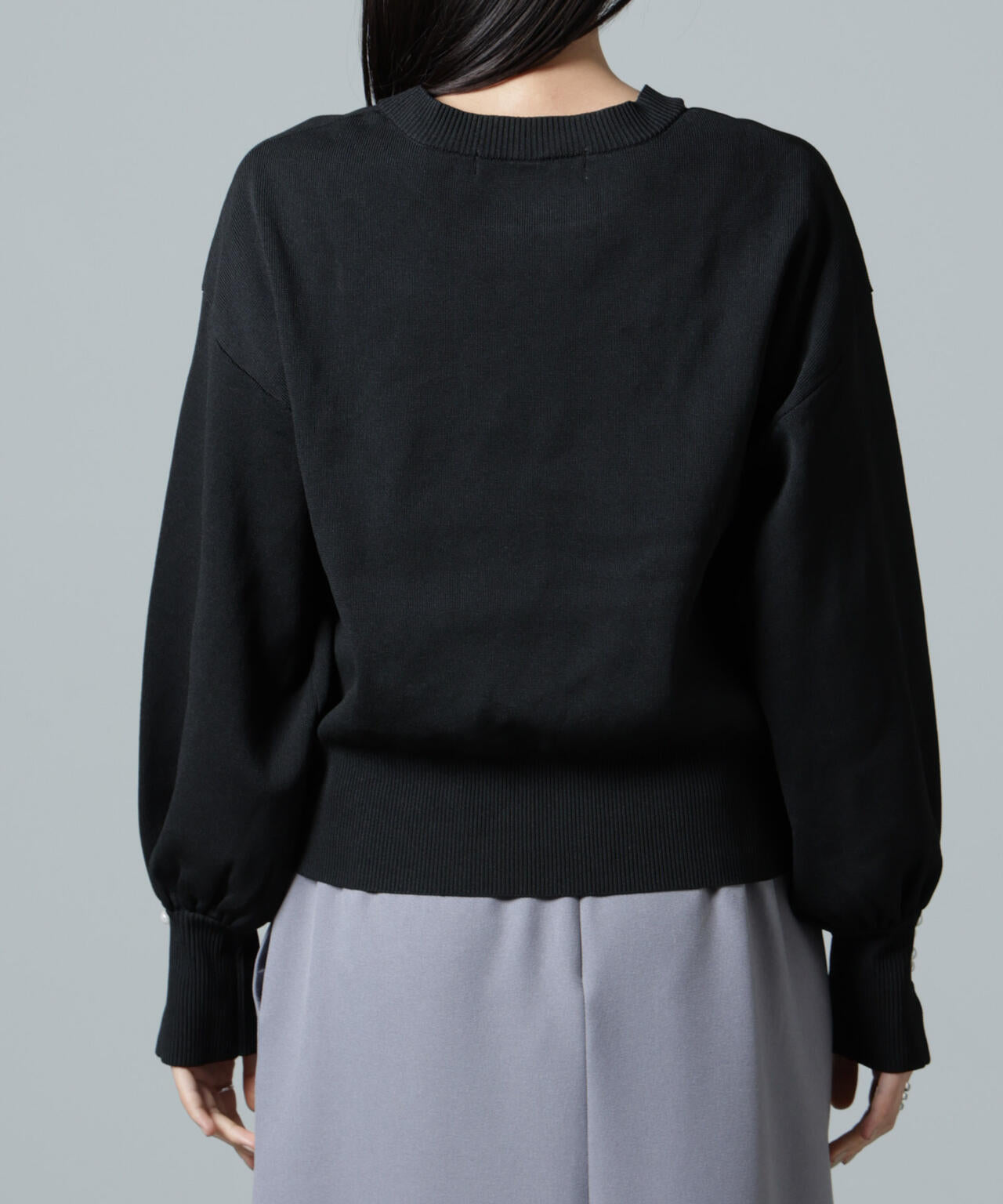 毎シーズンご好評の洗濯機洗い可シリーズのニットトップス。袖口に配置したパールが上品な印象を与えるデザインで、オンオフで活躍するアイテム。ややコンパクトな丈感のボックスシルエットで、スタイルが良く見える一枚です。