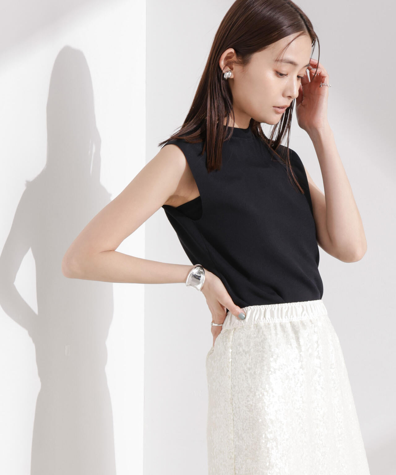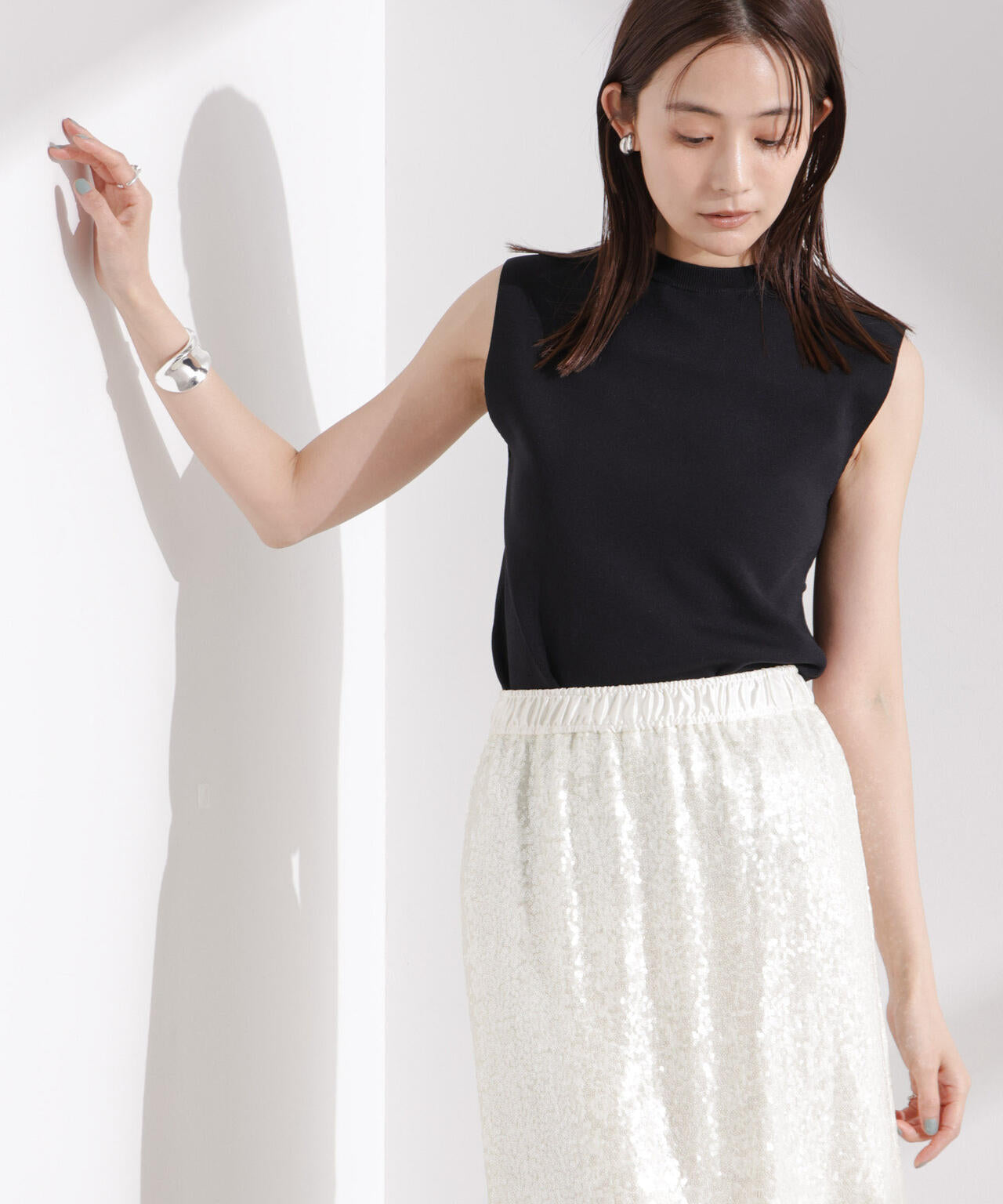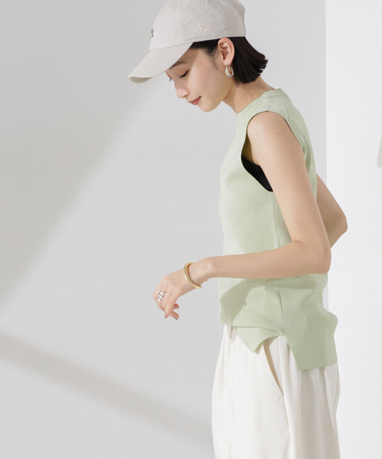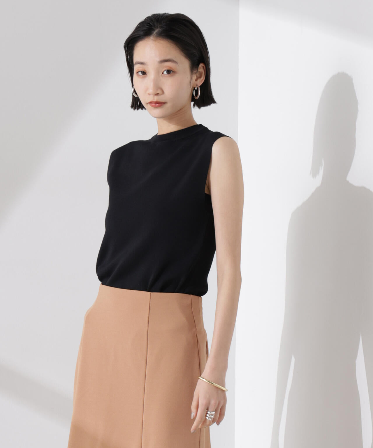 ・詰まった首元とノースリーブが好バランスな一着