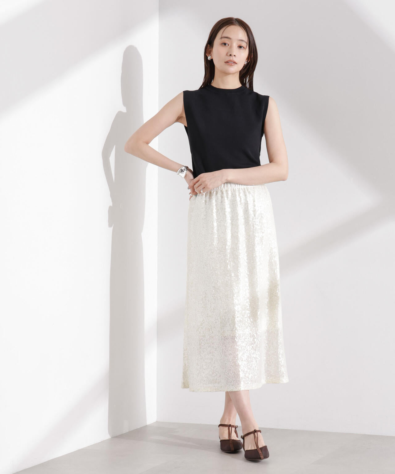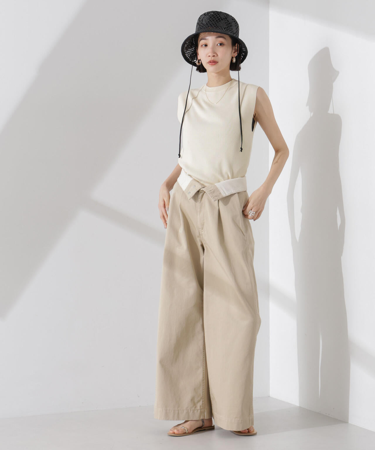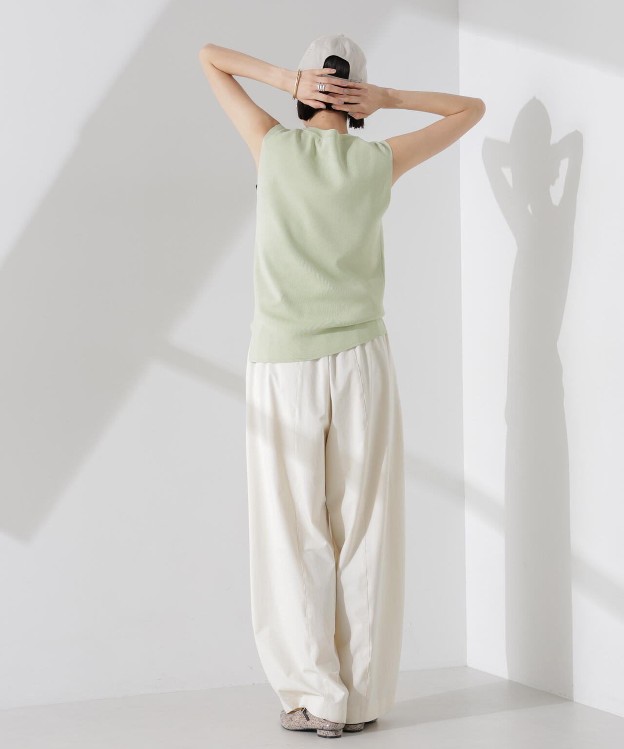 ・詰まった首元とノースリーブが好バランスな一着